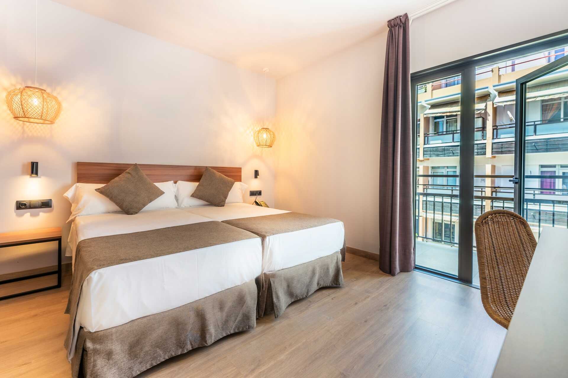 Dubbelrum, utan uteplats. Två enkelsängar. Wifi, luftkonditionering och deponering ingår. Kylskåp. Tv med internationella kanaler. Hårtork. Badrum med badkar och wc. Städning 7 ggr/vecka.