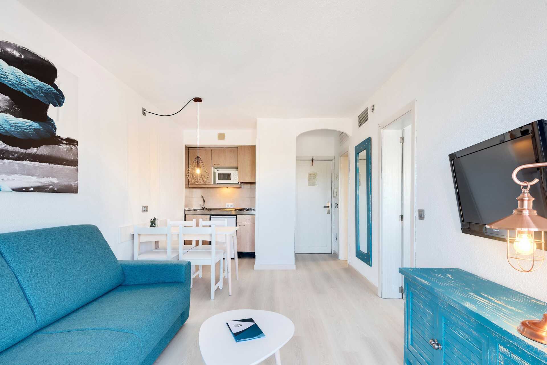 Tvårumslägenhet med balkong eller terrass alternativt med markterrass och en liten trädgård med solstolar. Lägenheterna med markterrass ligger i sidobyggnaden. Inredning och färger varierar mellan rummen. Ett separat sovrum med två enkelsängar. Kombinerat sovrum med vardagsrum och minikök. Möjlighet till extrabäddar i bäddsoffa. Minikök med kokplattor, mikrovågsugn, kylskåp, kaffekokare och enkel köksutrustning. Wifi, luftkonditionering och deponering ingår. Tv med lokala kanaler. Hårtork. Badrum med dusch och wc. Städning 5 ggr/vecka.
