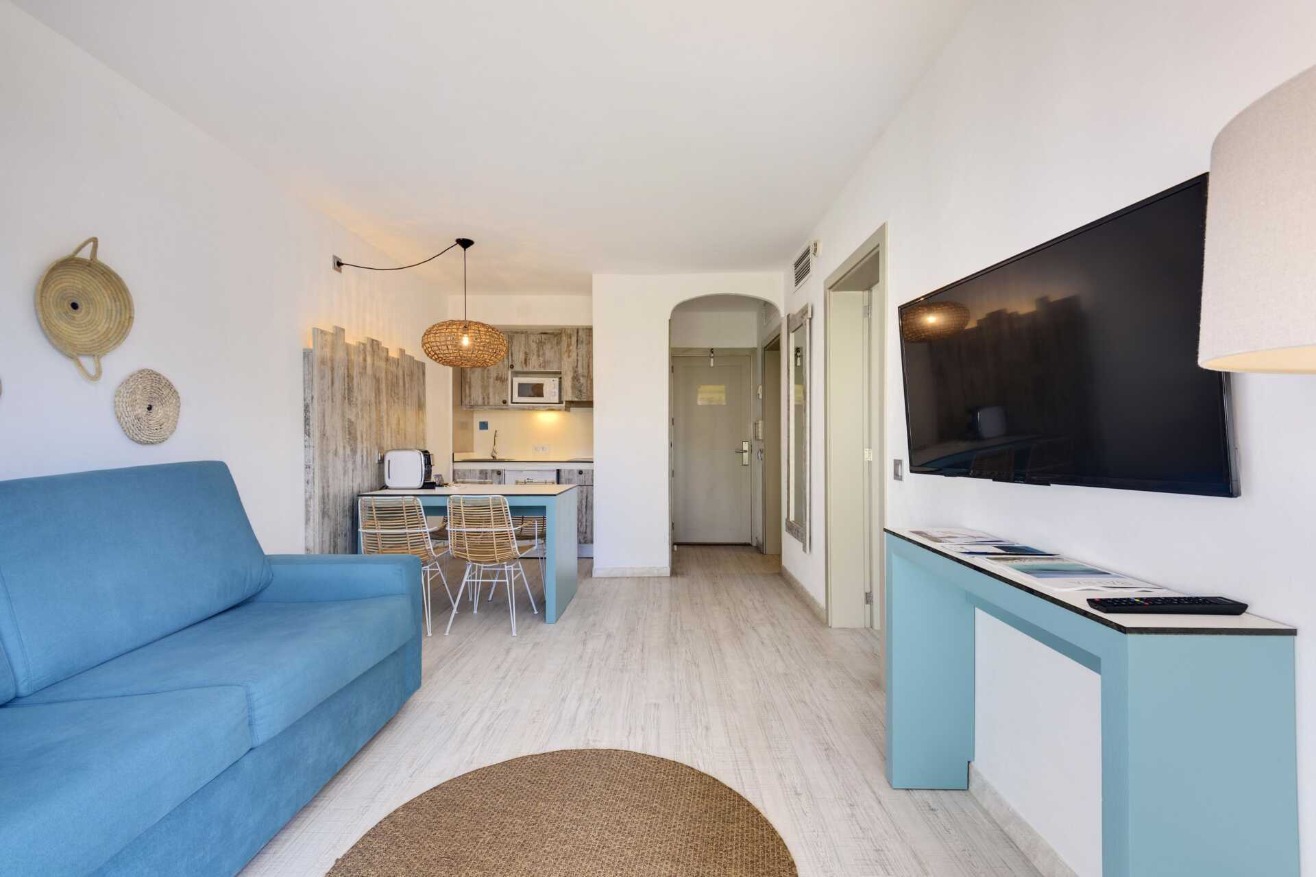 Tvårumslägenhet med balkong eller terrass. Ett separat sovrum med en dubbelsäng. Kombinerat sovrum med vardagsrum och minikök. Möjlighet till extrabäddar i två bäddsoffor. Minikök med kokplattor, mikrovågsugn, kylskåp och enkel köksutrustning. Wifi, luftkonditionering och deponering ingår. Tv med lokala kanaler. Hårtork. Badrum med dusch och wc. Städning 5 ggr/vecka.