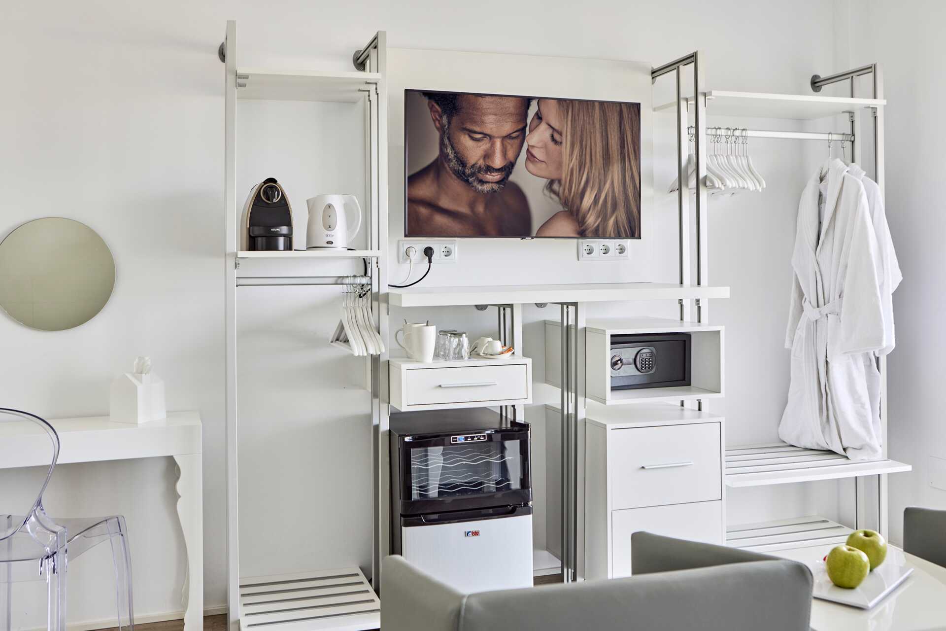 Dubbelrum med balkong, vissa mot poolområdet eller med stor balkong eller terrass. Rummen med balkong ligger på våning 2 till 4. Rummen med stor balkong eller terrass ligger på våning 1 och på uteplatsen finns bord och stolar samt en skön balisäng. Två enkelsängar. Wifi, luftkonditionering och deponering ingår. Kylskåp. Vattenkokare. Tv med internationella kanaler. Hårtork. Badrum med dusch och wc. Städning 7 ggr/vecka.