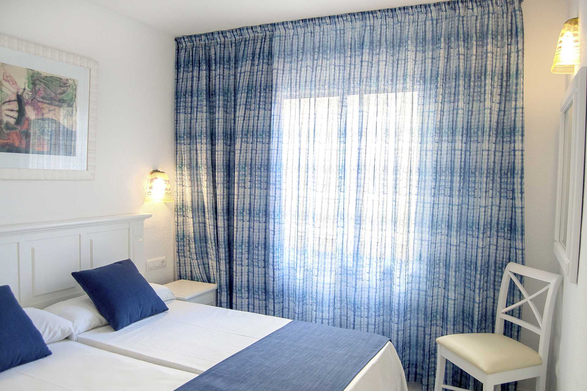 Dubbelrum med balkong eller terrass. Två enkelsängar. Möjlighet till extrabädd i bäddsoffa. Luftkonditionering ingår. Wifi och deponering mot avgift. Kylskåp, mikrovågsugn, vattenkokare samt kaffe och te. Tv med internationella kanaler. Hårtork. Badrum med dusch och wc. Städning 5 ggr/vecka. Barn under två år räknas in i maxantalet personer i rummet.