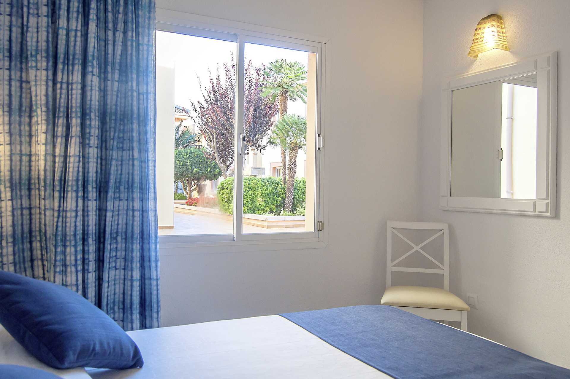 Tvårumslägenhet med balkong eller terrass. Sovrum och kombinerat vardagsrum med minikök. Två enkelsängar. Möjlighet till extrabäddar i bäddsoffa. Minikök med kokplattor, kylskåp, mikrovågsugn, brödrost, kaffebryggare och enkel köksutrustning. Luftkonditionering (endast i vardagsrummet) ingår. Wifi och deponering mot avgift. Tv med internationella kanaler. Hårtork Badrum med dusch och wc. Städning 5 ggr/vecka. Barn under två år räknas in i maxantalet personer i lägenheten.