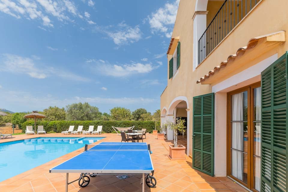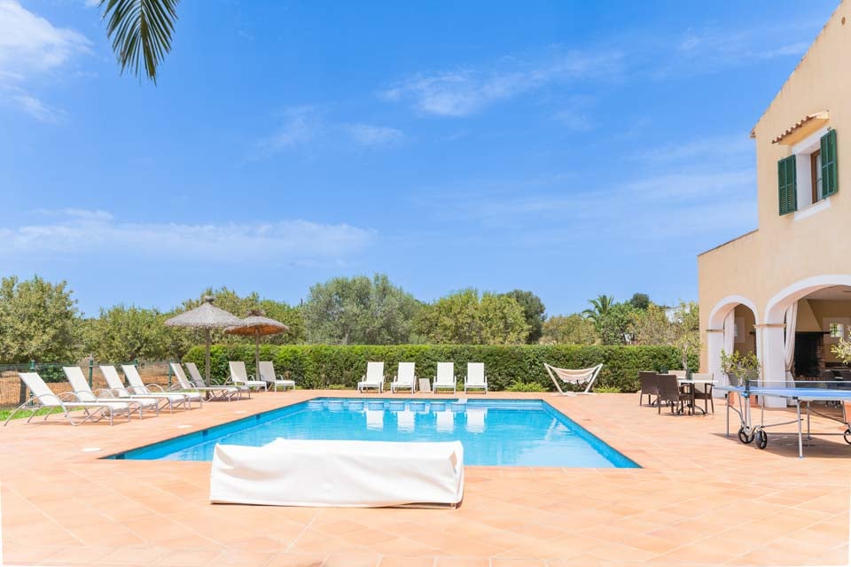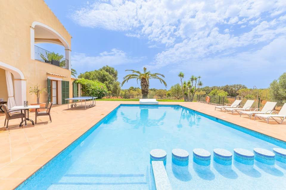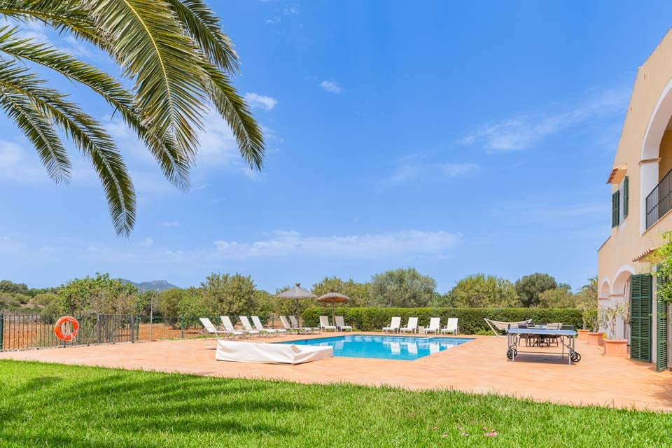 Utomhus står den magnifika poolen på 12 x 6 meter i centrum med tolv moderna solstolar och en dagbädd som är tillräckligt stor för att två personer ska kunna koppla av. När den strålande medelhavssolen blir lite för varm, sök skugga under en vacker palm i de välskötta trädgårdarna eller under ett av de strandliknande parasollerna vid poolen. När solen går ner kan du koppla av och njuta av en uppfriskande kvällscocktail och beundra de oförglömliga flamröda solnedgångarna från de övre terrasserna, medan barnen spelar bordtennis.