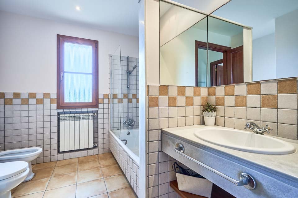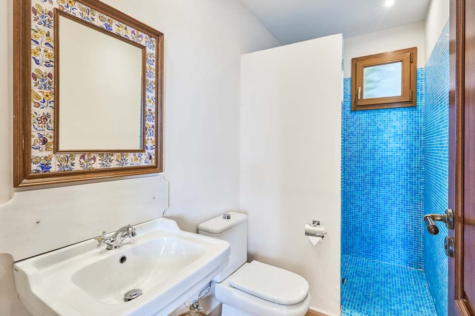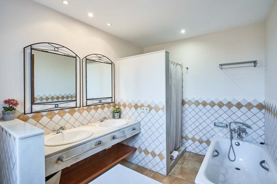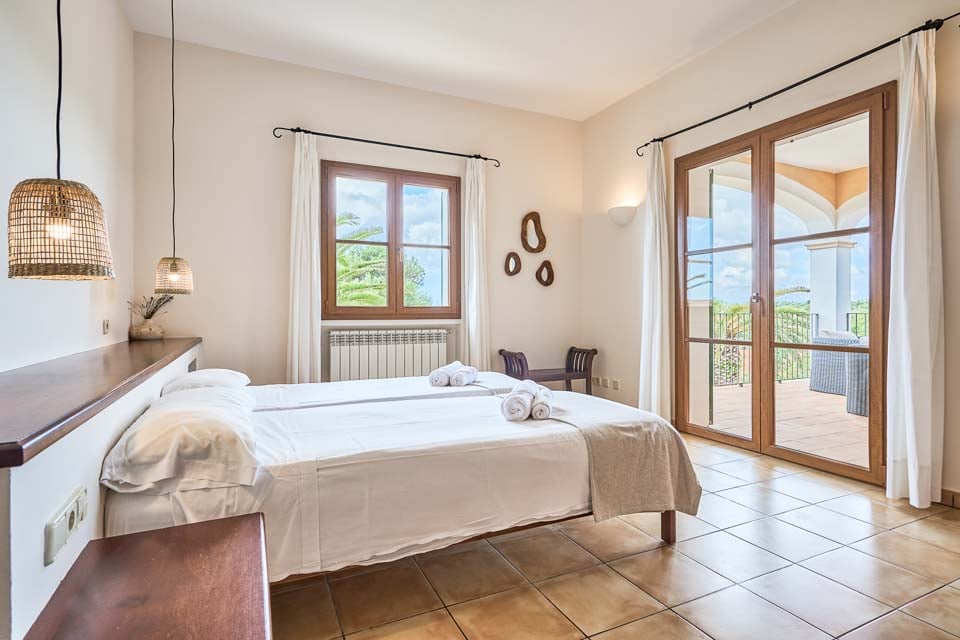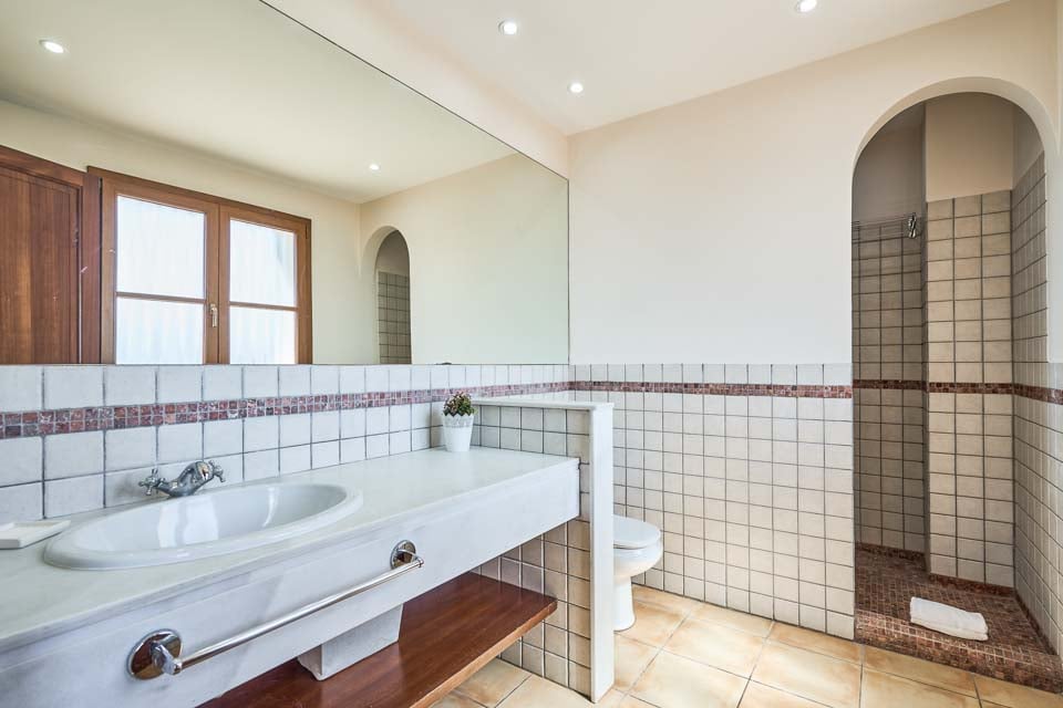 På första våningen hittar du de återstående sovrummen. Master-sviten har en klädkammare med inbyggda garderober och ett lyxigt badrum med eget badrum. Franska dörrar öppnar upp mot en rymlig privat solterrass på övre våningen med stolar och bord samt vacker utsikt över poolen och trädgården. Det finns ytterligare 3 tvåbäddsrum, ett med eget badrum och de andra två som delar ett angränsande badrum och solterrass.