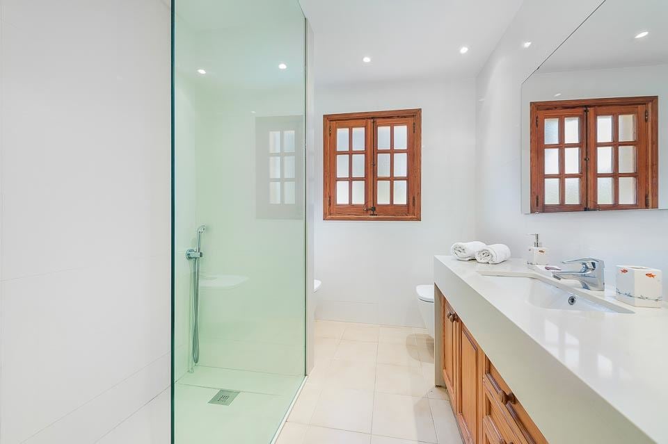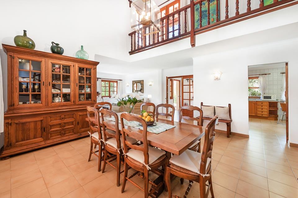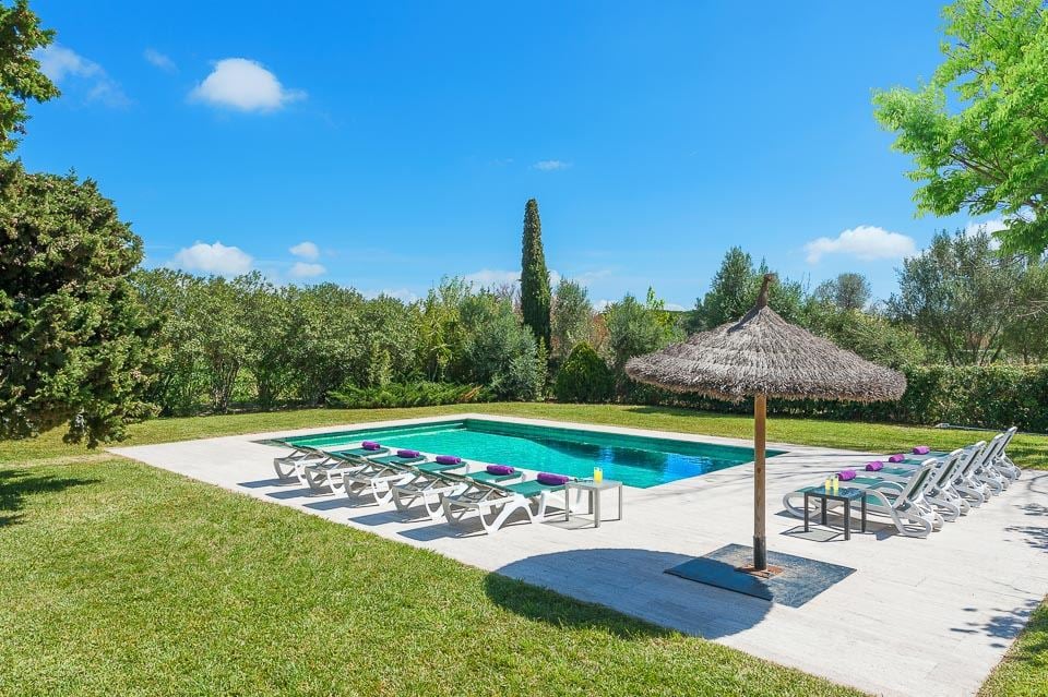 Med plats för upp till åtta gäster i fyra sovrum är arkitekturen traditionellt spansk, så förvänta dig ljusa väggar och träfönster och dörrluckor. Med en tomt på två hektar finns det gott om plats för alla. En fantastisk, turkos pool ligger framför villan med matchande solstolar vid poolen. Det finns två matplatser utomhus, en precis under solen och en annan i skuggan av terrassen.