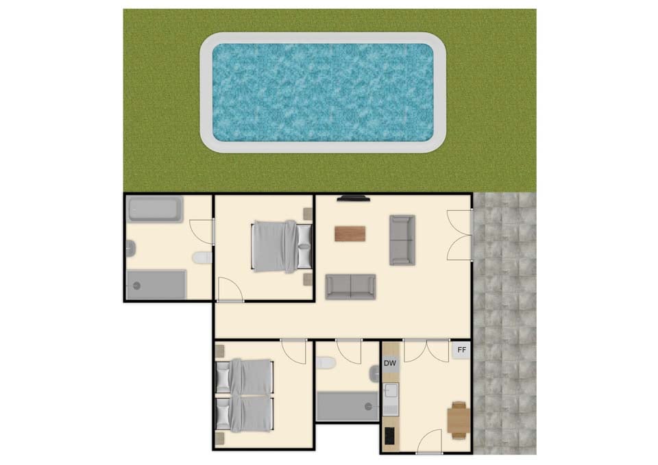 För att komma till villan finns en 120 cm bred stig tillsammans med ett trappsteg. Ytterdörren har en bredd på 90 cm, medan dörren till terrassen också är 90 cm bred. Terrassen är ganska plan, men bestående av kakel, stenläggning och gräsmatta. Poolen kan endast nås via gräsmattan. Det finns en liten trappa ner från trädgårdsgången på vissa ställen. Detta är en fastighet på bottenvåningen. Dörren till sovrummet med två enkelsängar är 75 cm bred, medan badrumsdörrarna är 70 cm breda. Dörren in till kök/matplats är 76 cm bred och dörren in till vardagsrummet är 90 cm bred. *Observera att även om vi har gjort allt för att säkerställa att informationen som lämnas är korrekt, kan fel uppstå och om du behöver mer specifik information om villan, tveka inte att kontakta oss.