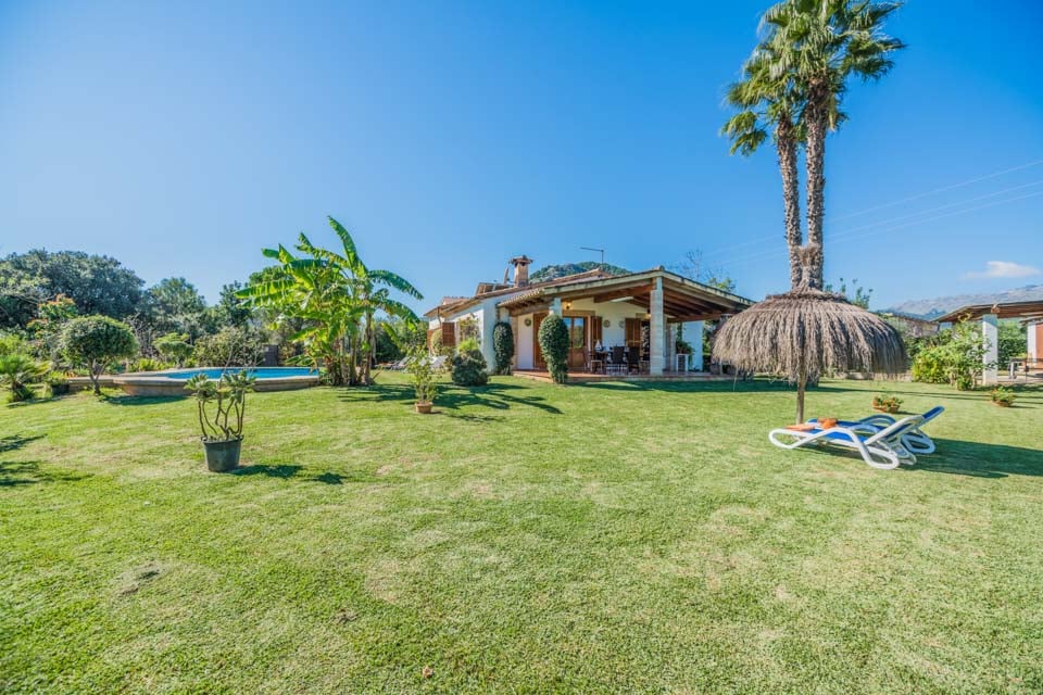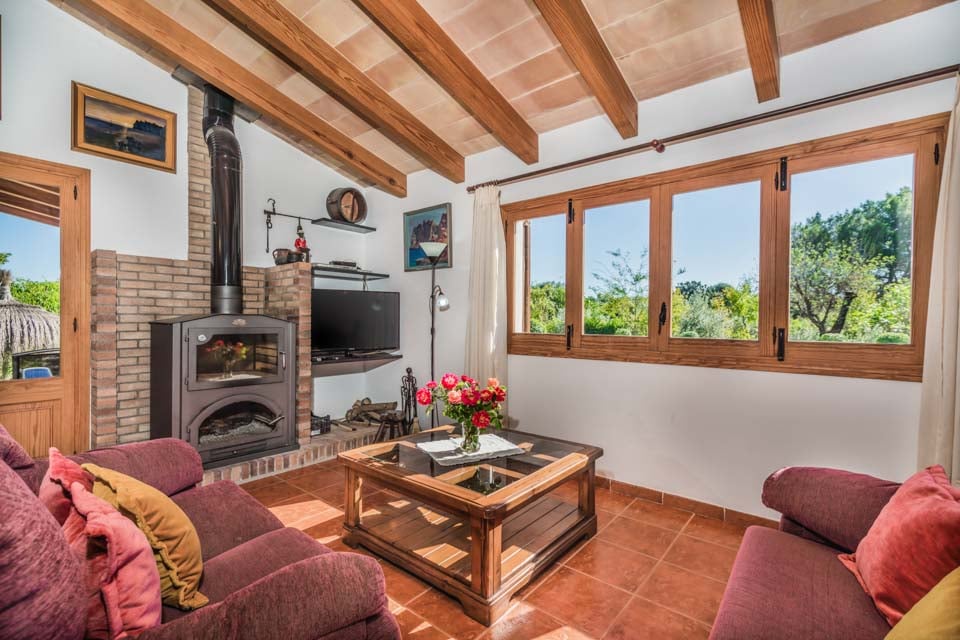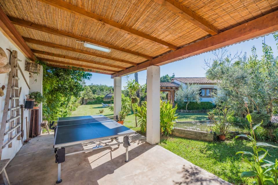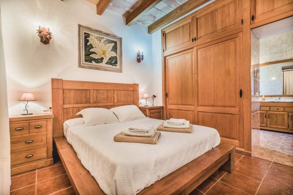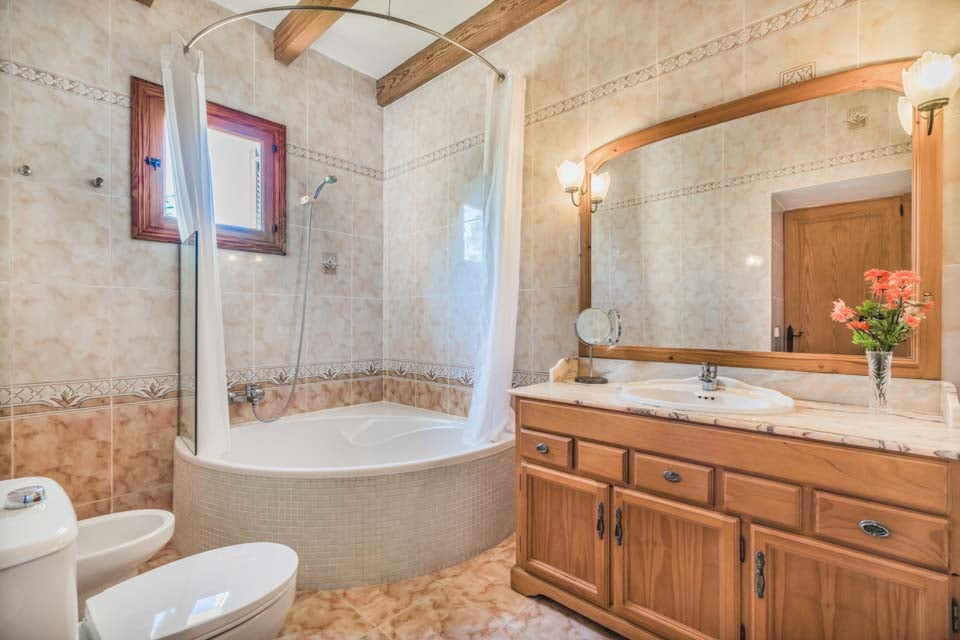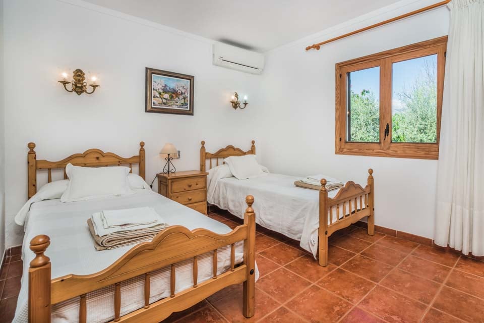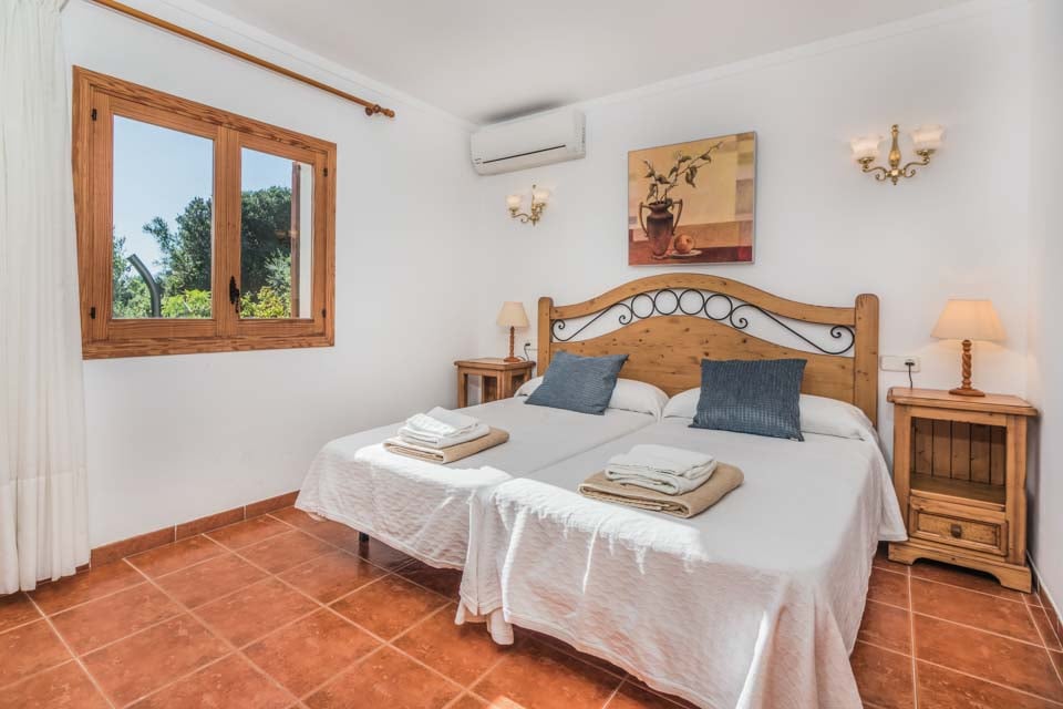 Det finns tre sovrum, ett dubbelrum med eget badrum och två tvåbäddsrum som delar ett komplett badrum. Alla sovrum har luftkonditionering. Båda badrummen är utrustade med badkar/dusch, toalett och bidé. Utomhus i trädgården finns en skuggig möblerad terrass med tegelgrill, perfekt för måltider utomhus. Den inbjudande poolen är omgiven av solstolar på den välskötta gräsmattan. Det finns också en täckt terrass för en omgång pingis. Det finns en spektakulär utsikt över bergen vilket gör denna villa idealisk för en avkopplande semester på Mallorca. Poolhanddukar ingår.