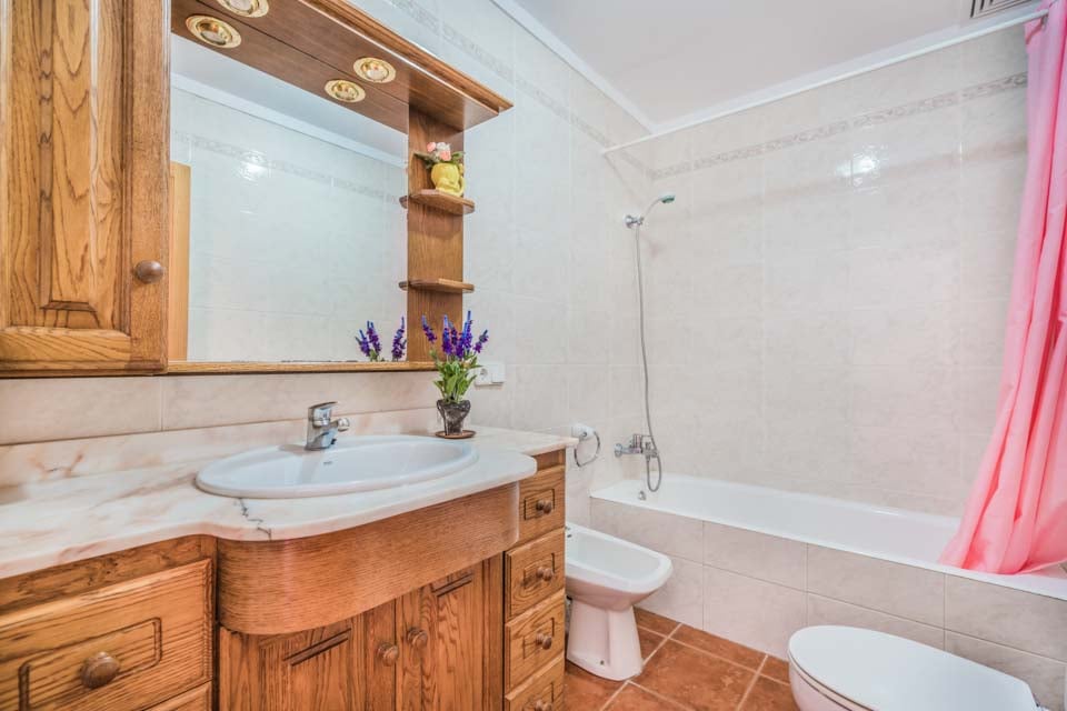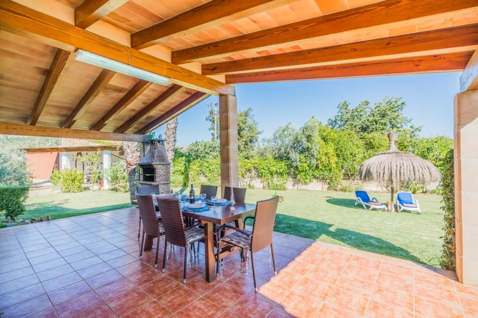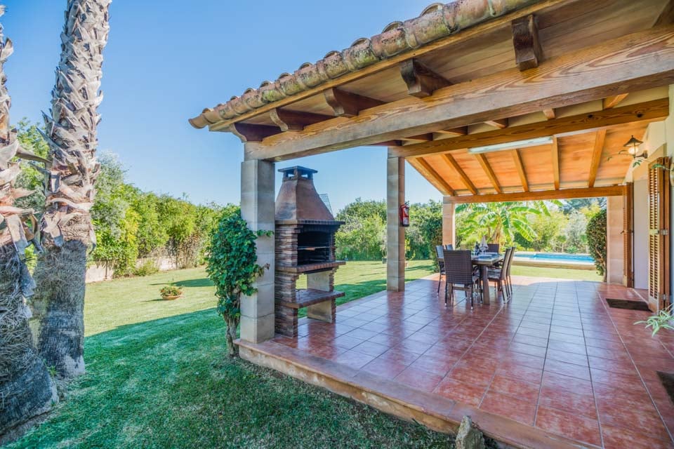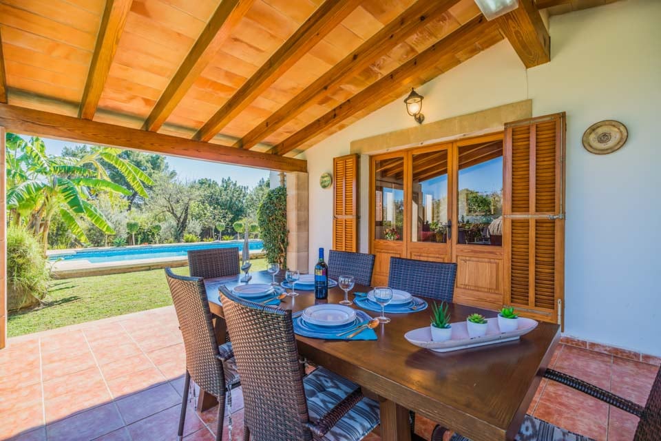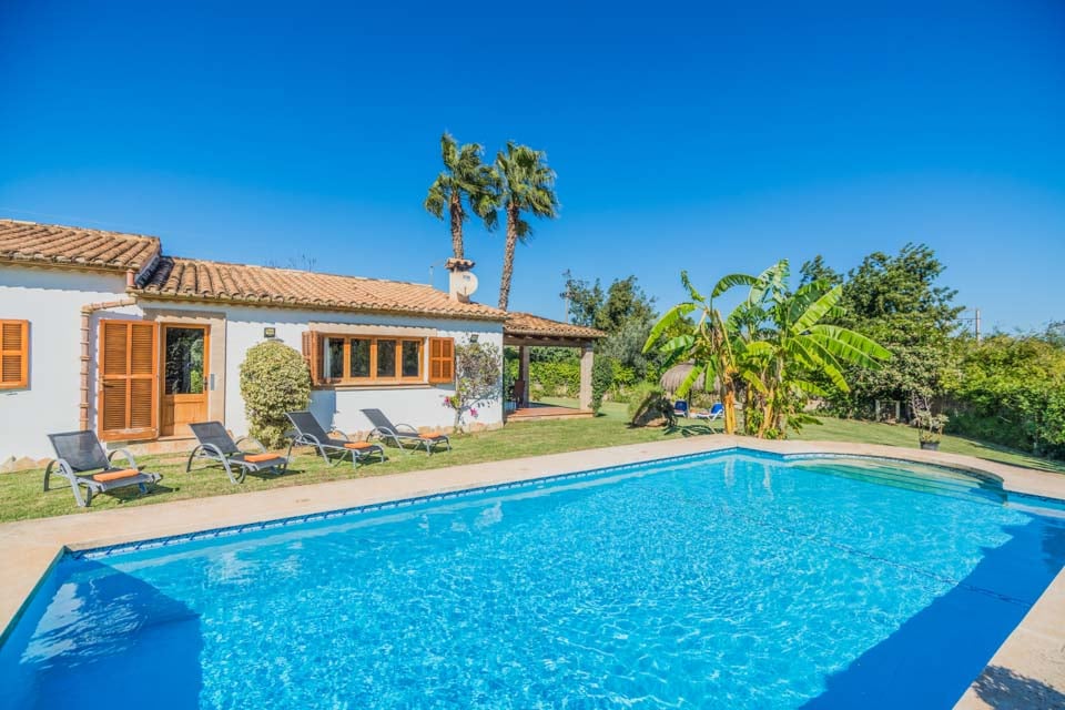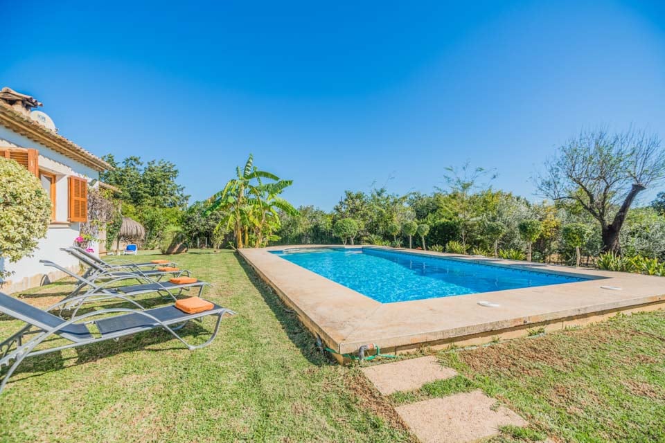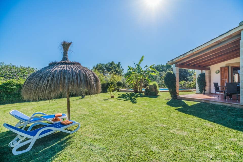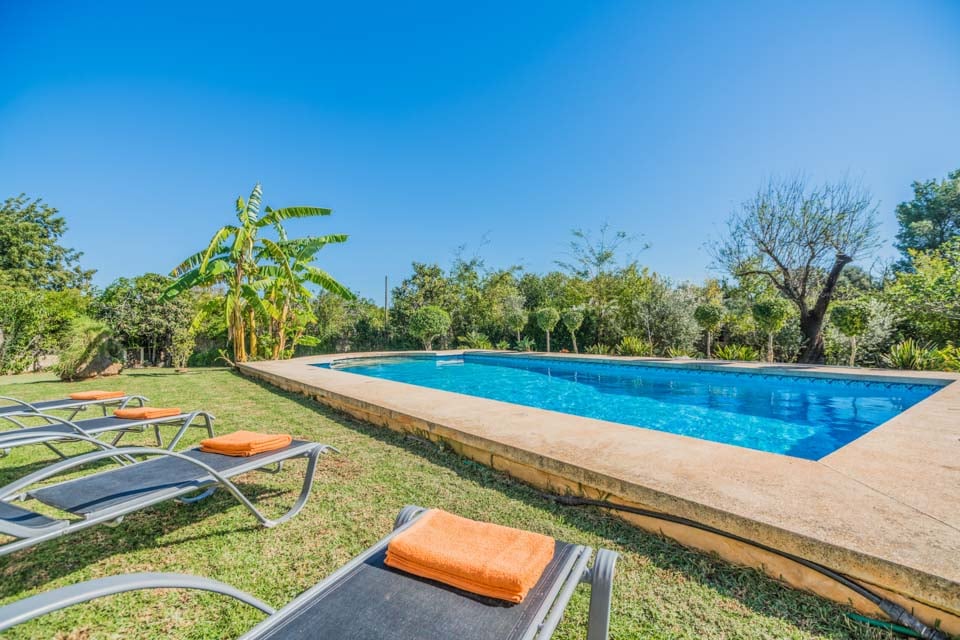 Det finns tre sovrum, ett dubbelrum med eget badrum och två tvåbäddsrum som delar ett komplett badrum. Alla sovrum har luftkonditionering. Båda badrummen är utrustade med badkar/dusch, toalett och bidé. Utomhus i trädgården finns en skuggig möblerad terrass med tegelgrill, perfekt för måltider utomhus. Den inbjudande poolen är omgiven av solstolar på den välskötta gräsmattan. Det finns också en täckt terrass för en omgång pingis. Det finns en spektakulär utsikt över bergen vilket gör denna villa idealisk för en avkopplande semester på Mallorca. Poolhanddukar ingår.
