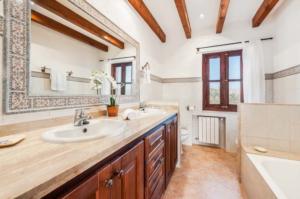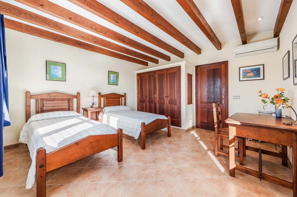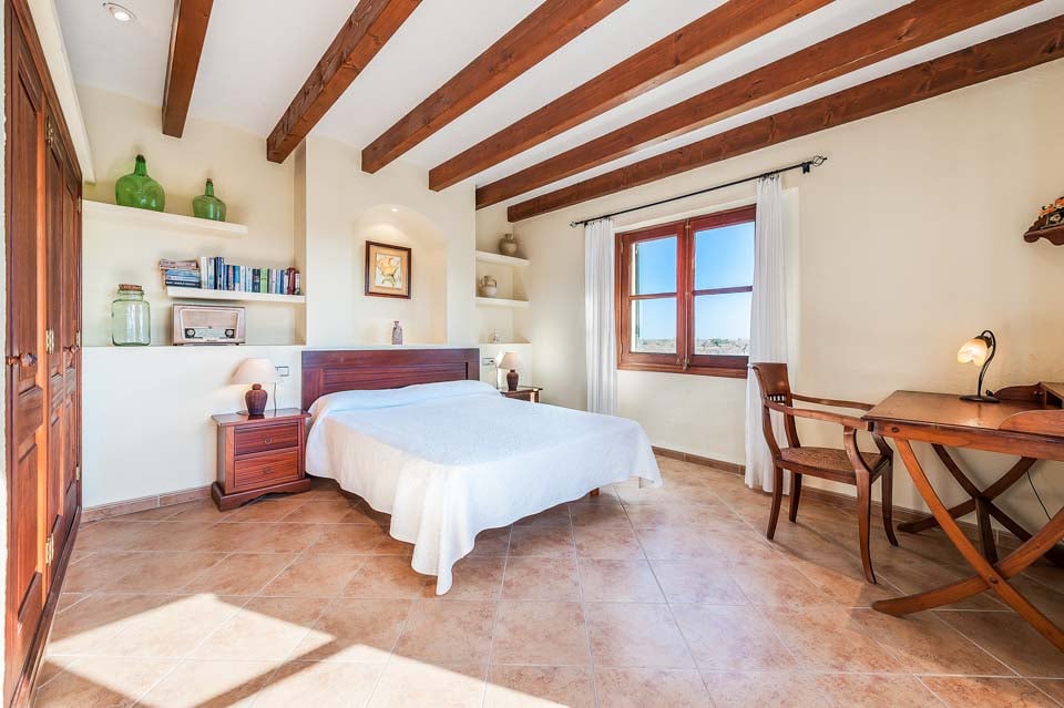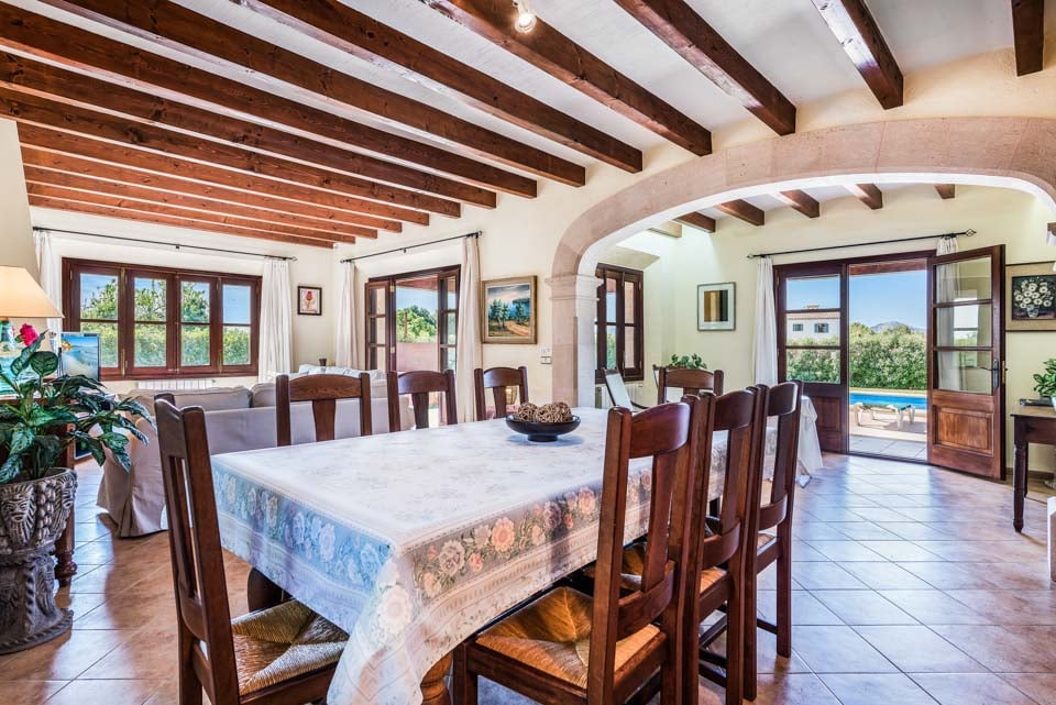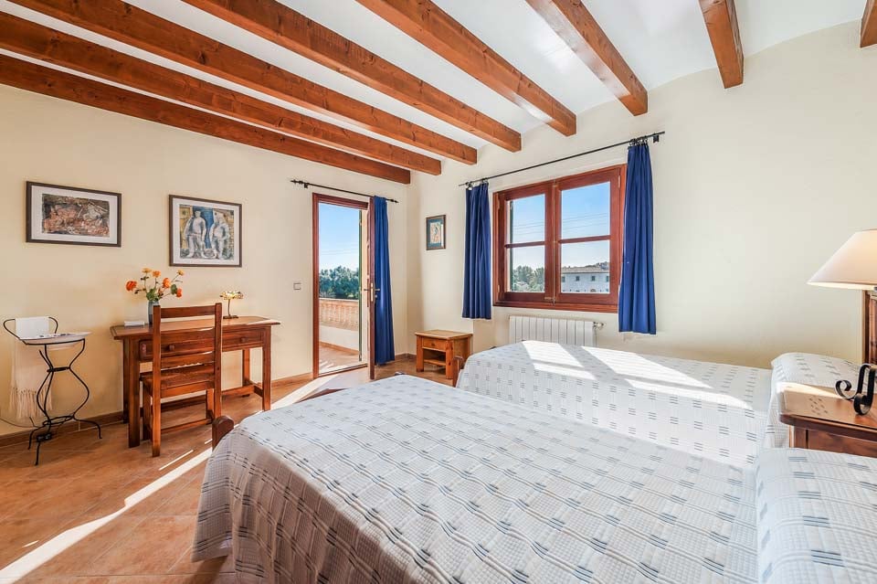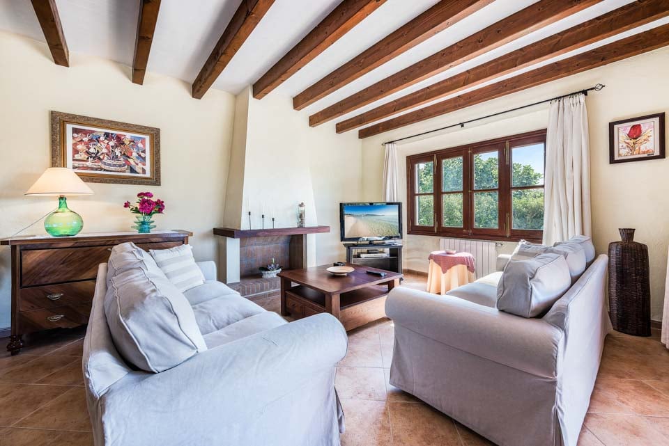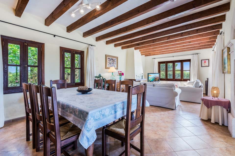 Den mallorcanska fincaen är ett traditionellt lanthus med träbjälkar som ger en unik touch och stora fönster med fantastisk utsikt över bergen.