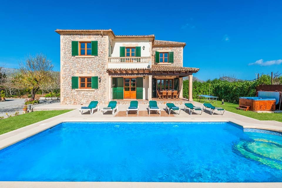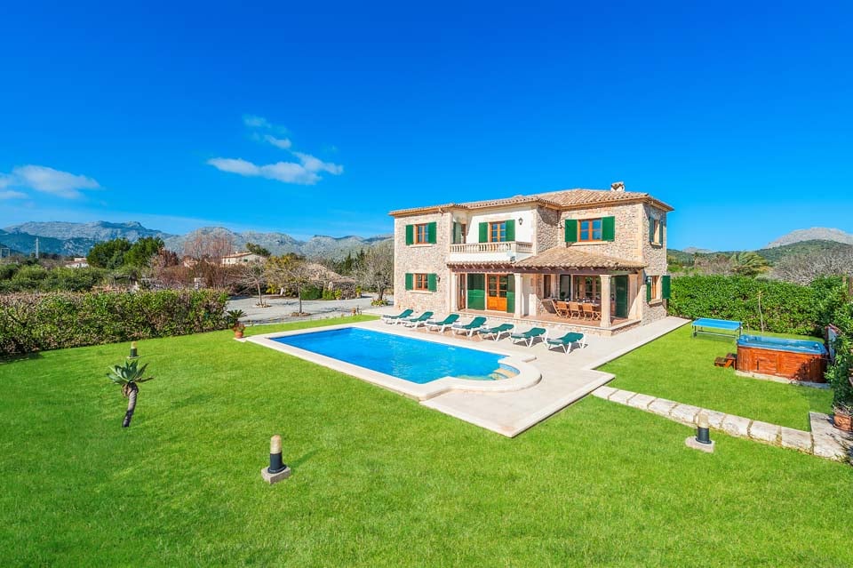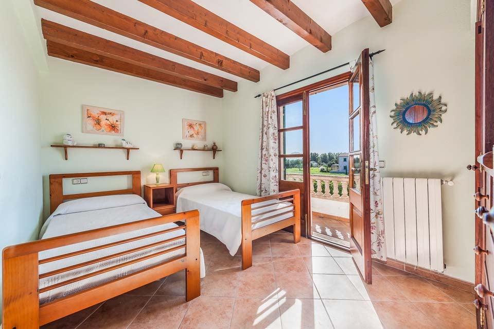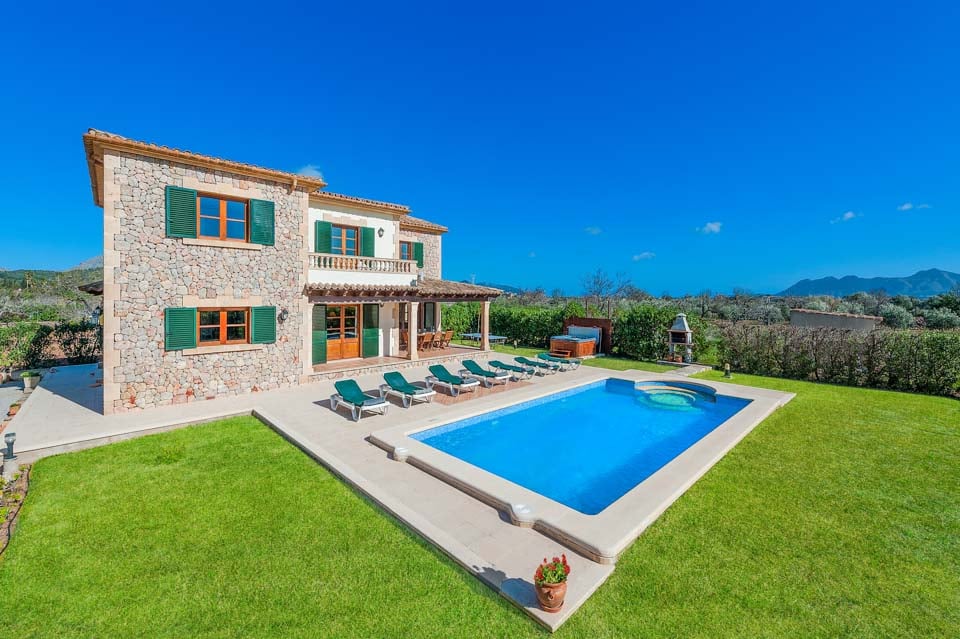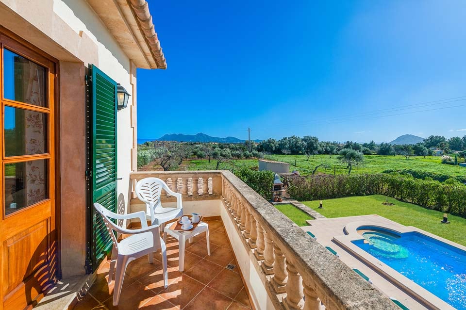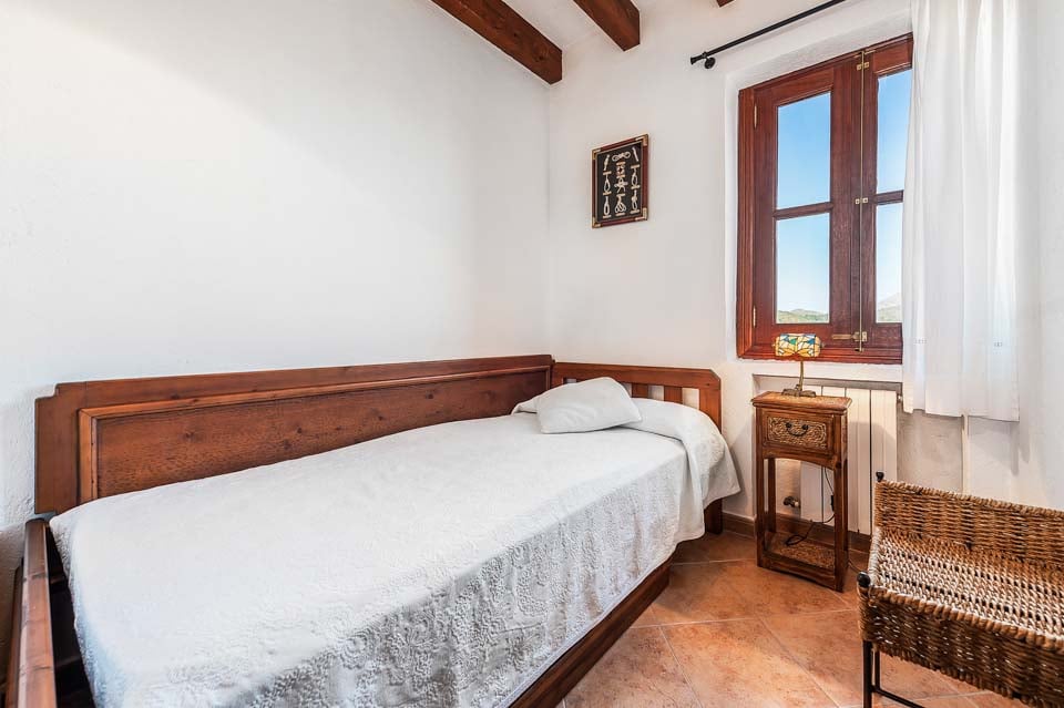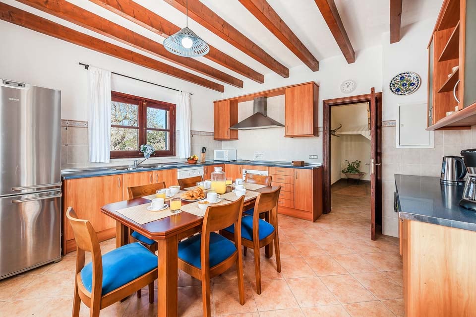 Den mallorcanska fincaen är ett traditionellt lanthus med träbjälkar som ger en unik touch och stora fönster med fantastisk utsikt över bergen.
