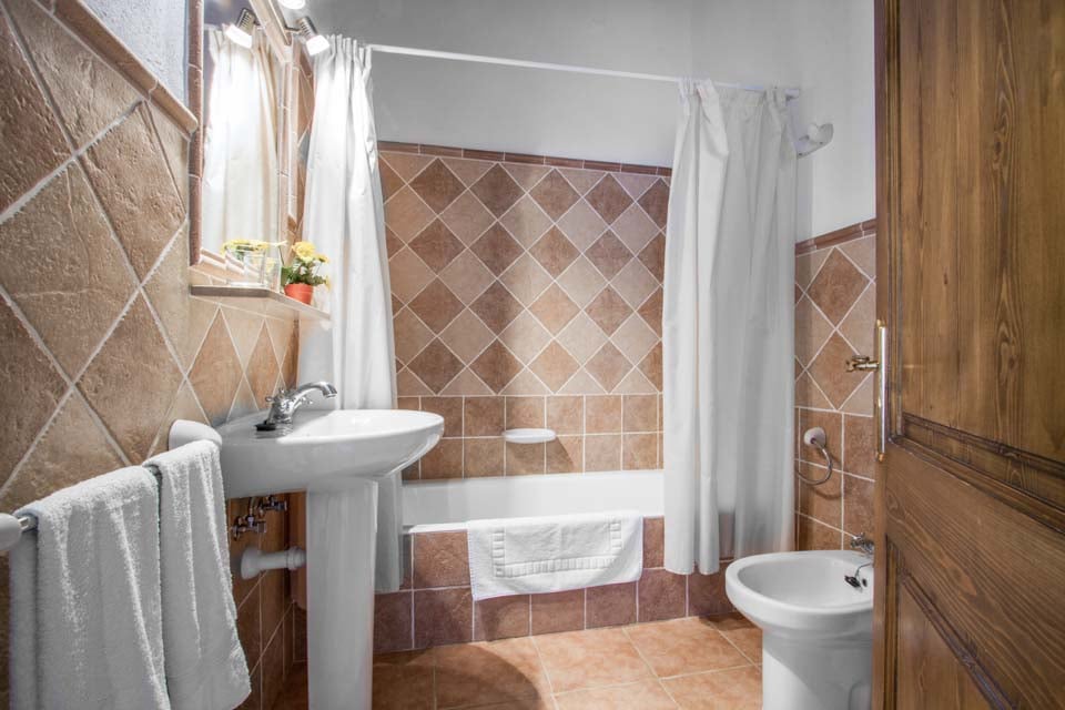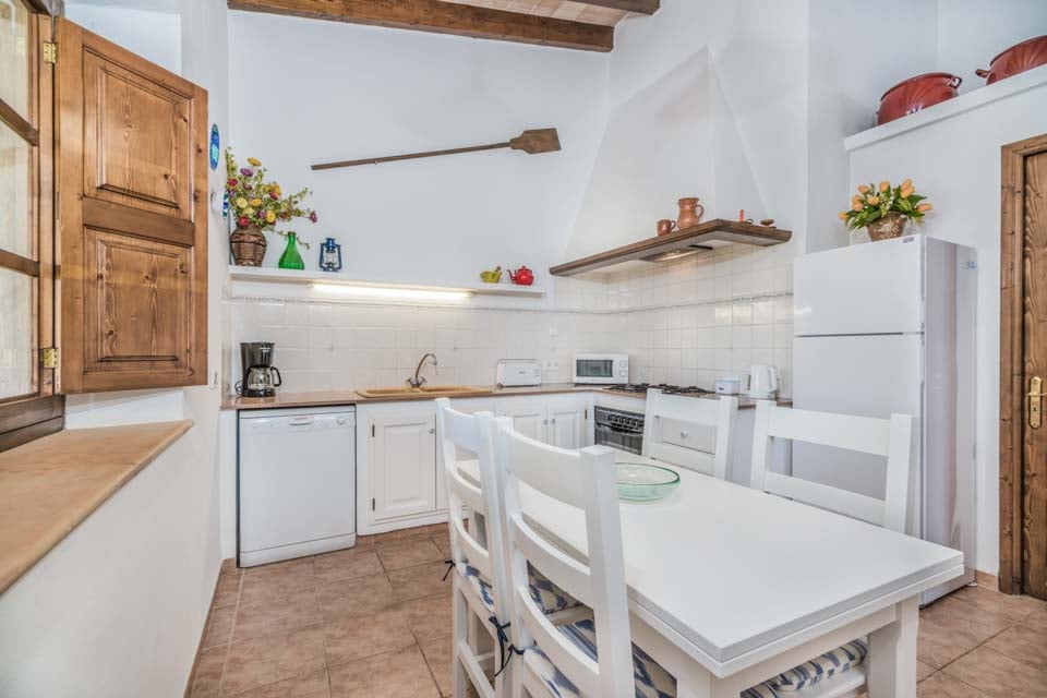 Inuti ligger alla rum på bottenvåningen. Det rymliga vardagsrummet och matsalen har platt-TV, luftkonditionering och leder till det ljusa och luftiga köket. Detta rum med sina vitkalkade väggar, eleganta skåp och matbord är perfekt för att laga mat inomhus. Med ugn, spishäll och mikrovågsugn finns allt du kan behöva för att göra din semester med självhushåll så enkel som möjligt. Det finns ett sovrum med dubbelsäng och två sovrum med två enkelsängar, vilket gör denna villa perfekt för både par och familjer.