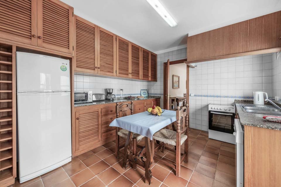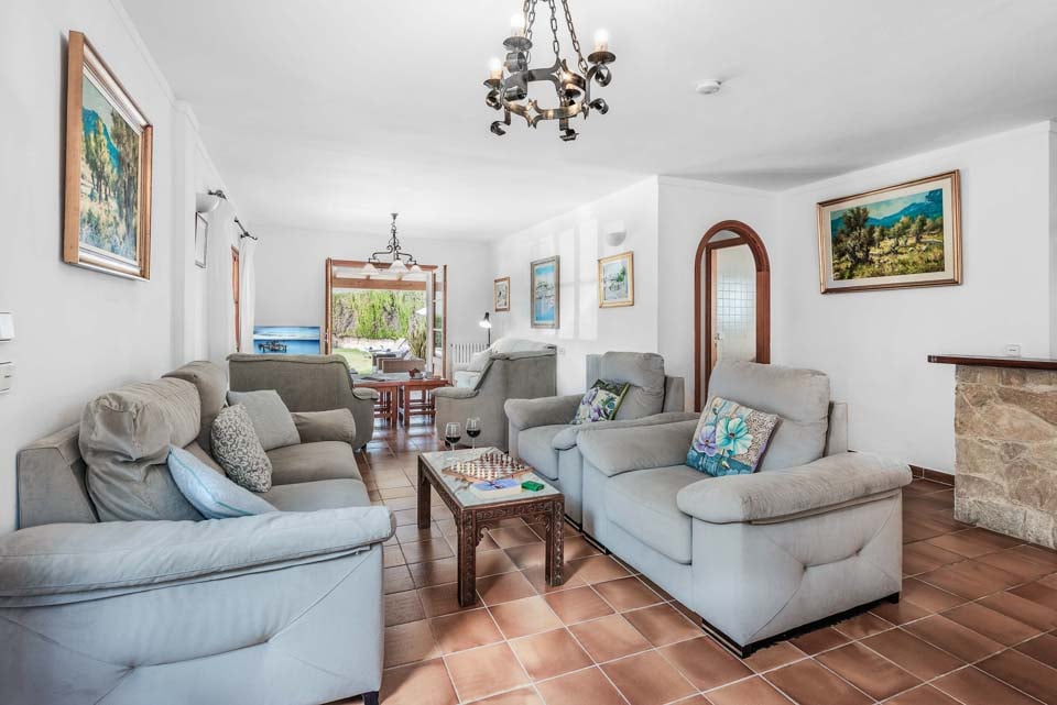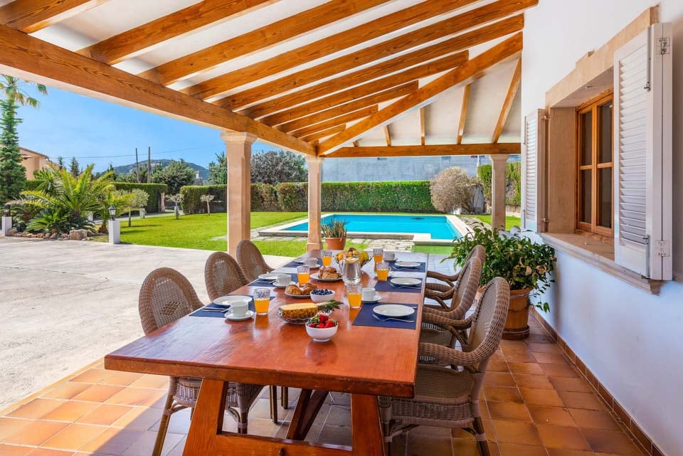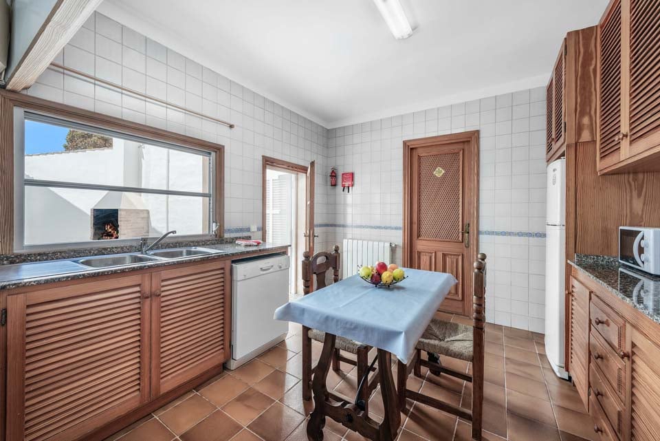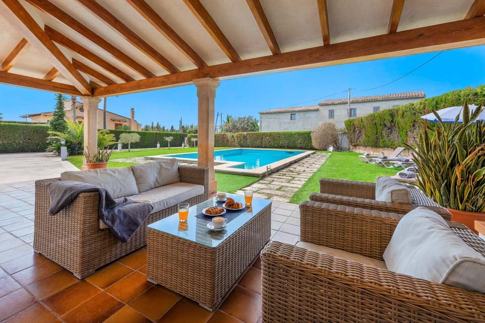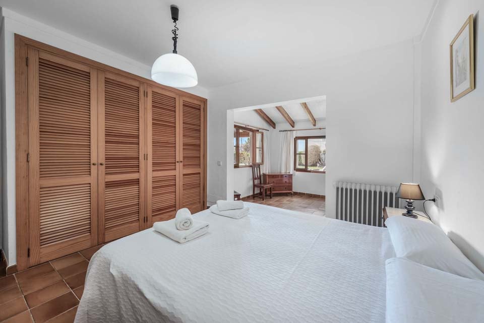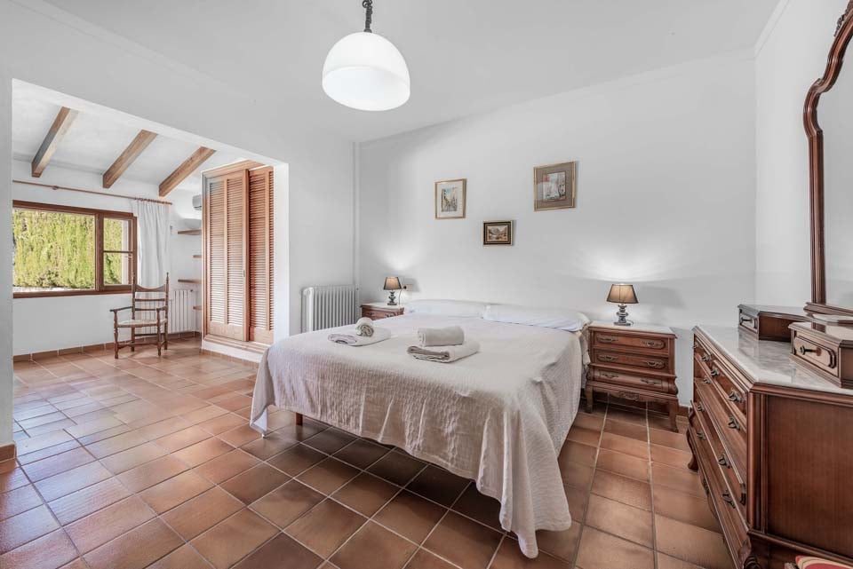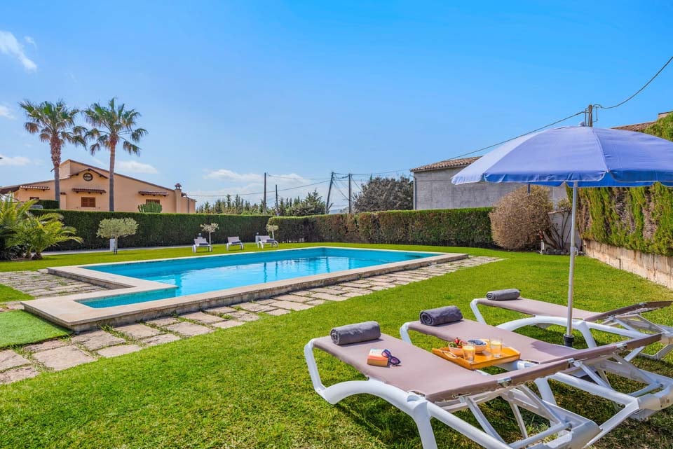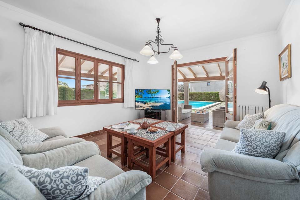 Villan har en fantastisk, azurblå pool och en välskött gräsmatta. Med solstolar vid poolen och ett parasoll har du knappast någon ursäkt för att gå in alls. Njut av solen i den här delen av Balearerna. När du inte solar kan du tända kolen och grilla färsk fisk på den öppna grillen och njuta av den i skuggan av verandan som omsluter huset. Själva villan ligger på en hörntomt och utstrålar den där traditionella, spanska charmen. Det känns som ett riktigt spanskt hem inuti, med dekorativa tallrikar på väggarna, bekväma lounger och gott om matplats. Det finns två dubbelrum och ett tvåbäddsrum.