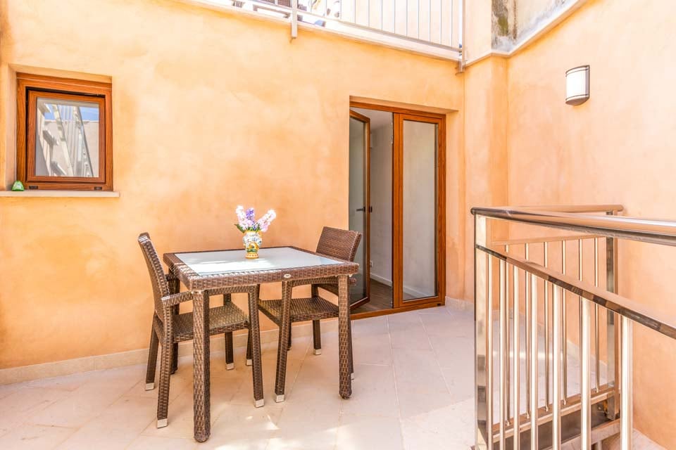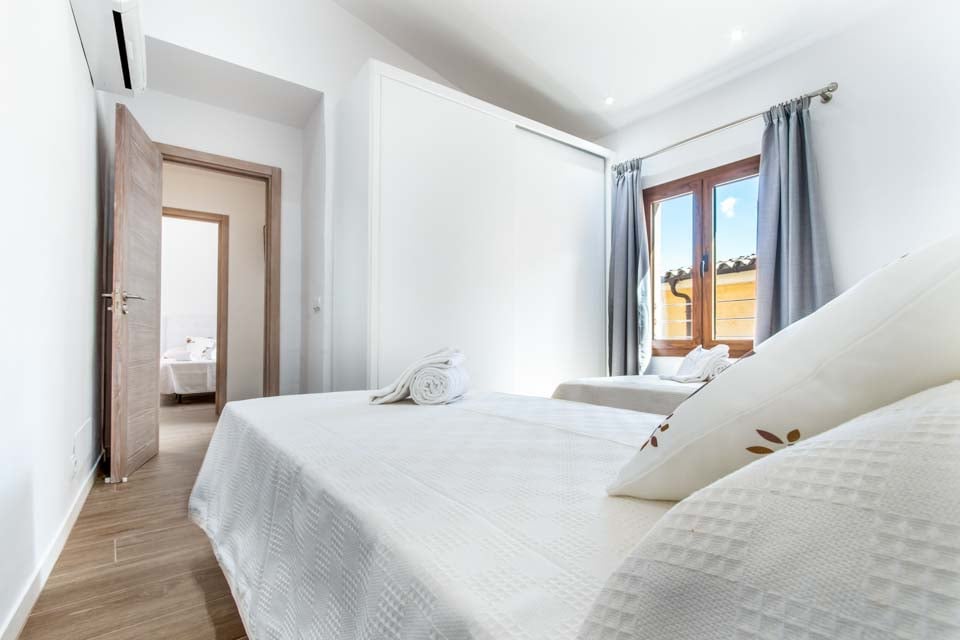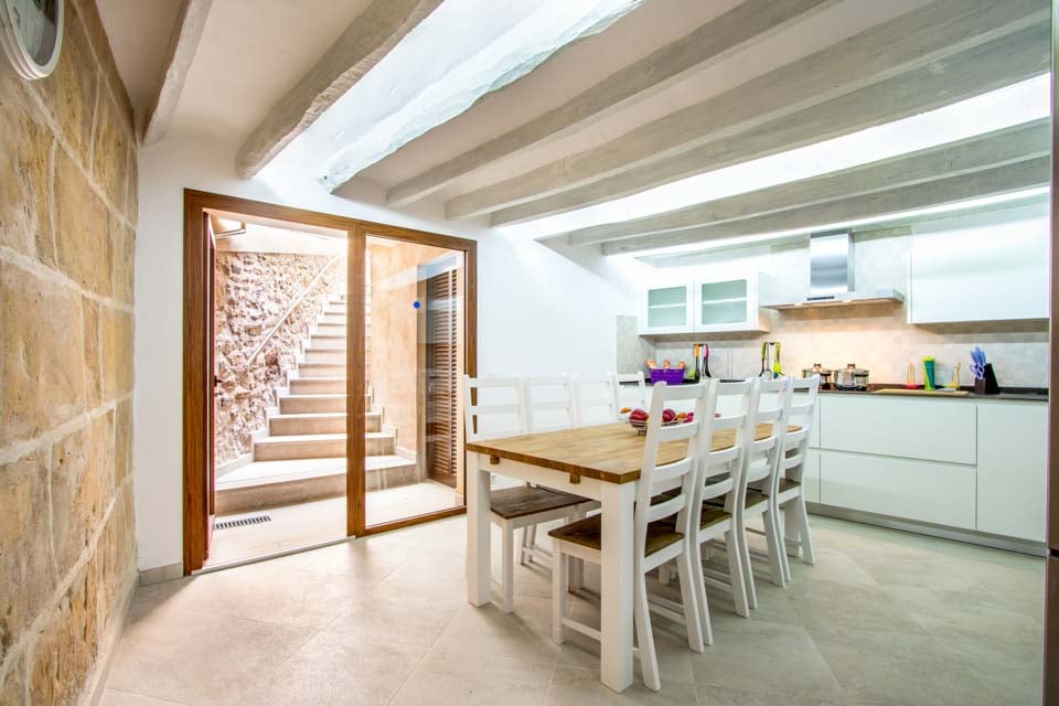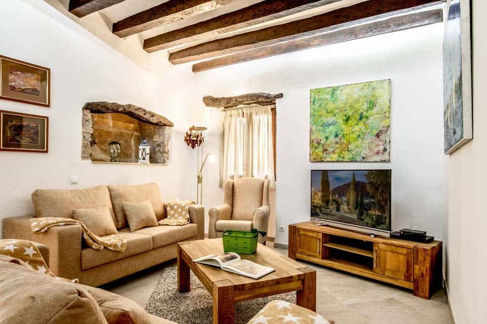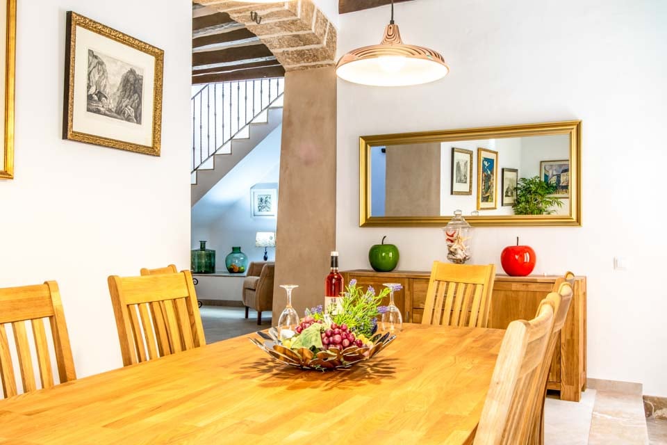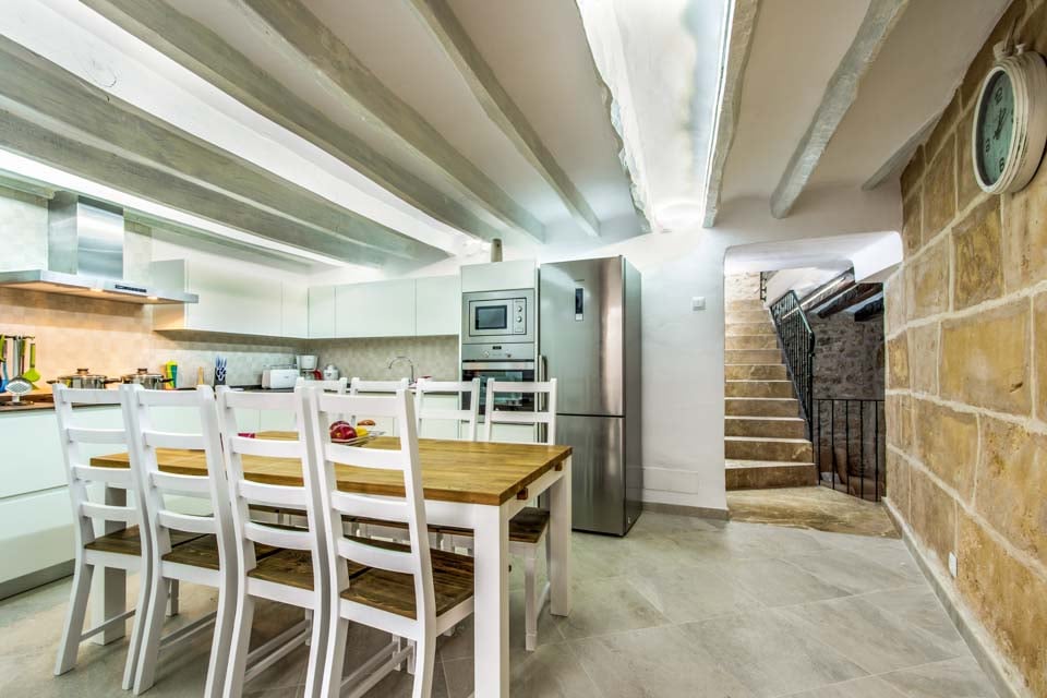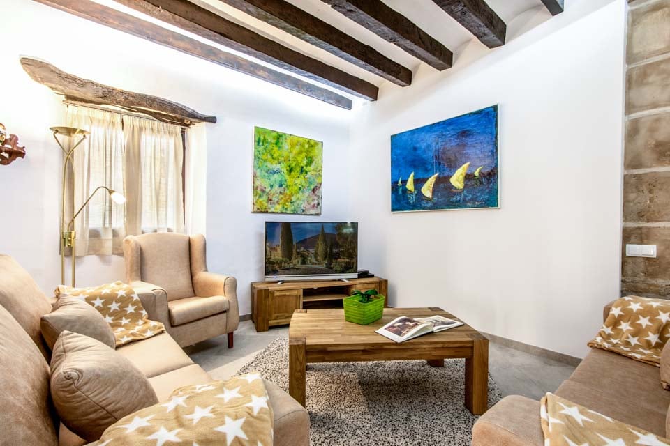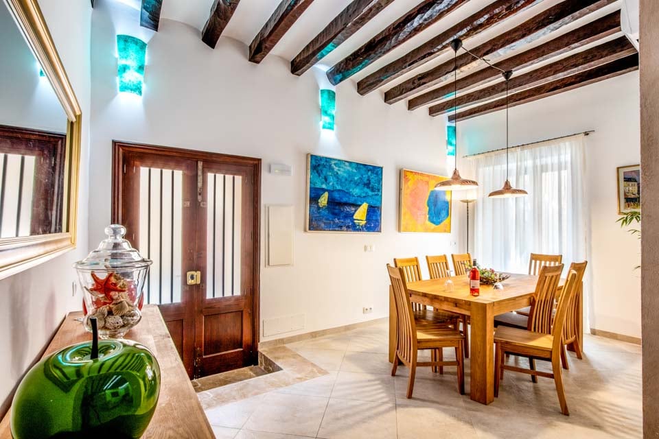 Inbäddat bland bakgatorna i Pollensas gamla stadskärna är detta charmiga radhus ett måste att se! Beläget bara ett stenkast från radhuset som en gång ägdes av den berömda målaren Dionis Bennassar, är denna charmiga antika stad full av historia, kullerstensgator och medeltida kyrkor. Kantad av cypresser leder den berömda Calvario-trappan, hela 365 stycken, från torget och till det lilla Calvario-kapellet högst upp. Klättringen är väl värd ansträngningen! Om du inte känner för att vandra uppför dessa gamla trappsteg, håll dig då till marknadstorget, fyllt med traditionella restauranger som serverar läckra rätter och läckra tapas. Den bästa delen? Du är bara två minuters promenad bort.