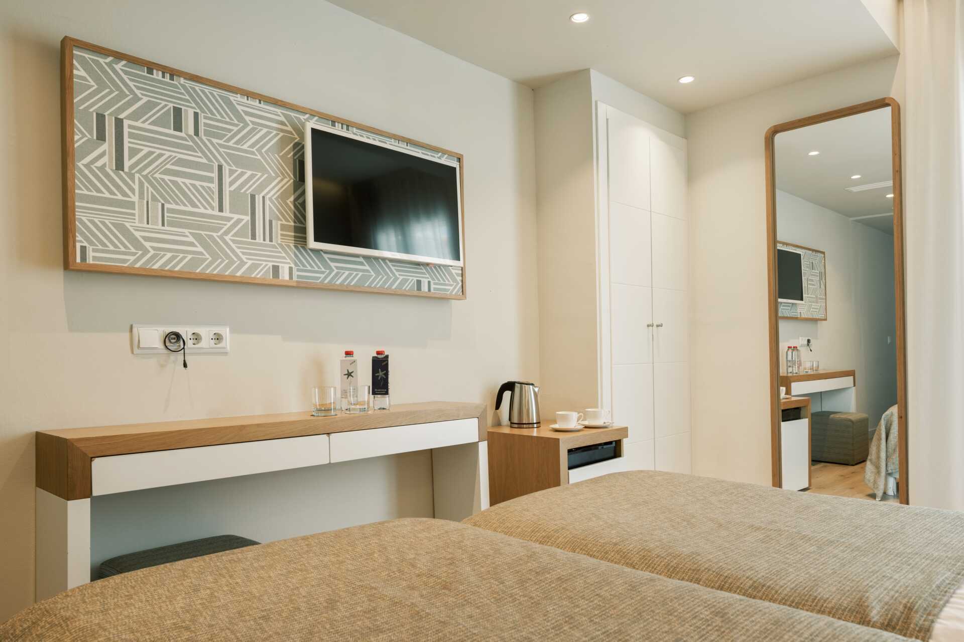 Standardrum, utan uteplats. Begränsad havsutsikt. En dubbelsäng eller två enkelsängar. Wifi, luftkonditionering och deponering ingår. Kylskåp. Vattenkokare samt kaffe och te. Tv med internationella kanaler. Hårtork. Badrum med dusch och wc. Städning 7 ggr/vecka.