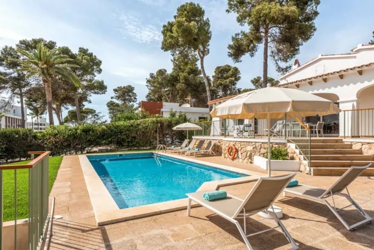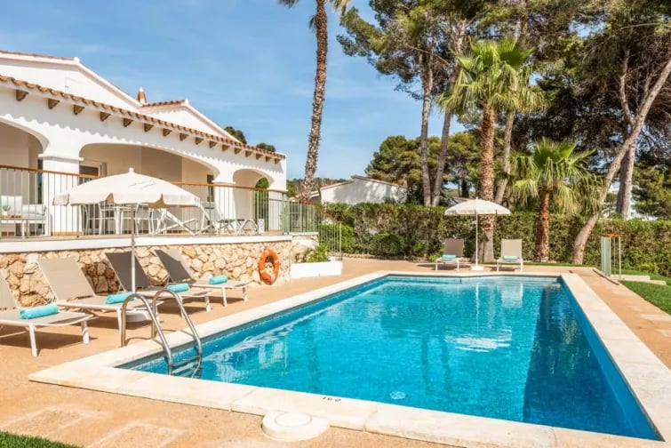 Belägen 240 meter från den gyllene sandstranden i Santo Tomas, är denna vitkalkade villa på Menorca ett utmärkt val om du letar efter en avkopplande semester. Denna charmiga enplansvilla ligger inbäddad mellan palmer och har en härlig modern känsla på insidan. Med sin egen privata pool kan du dagligen koppla av i villan eller en kort promenad till den vackra stranden.
