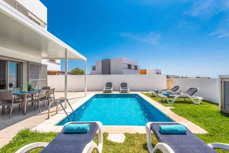 Denna moderna, vitkalkade villa har ett mycket önskvärt läge inom bekvämt gångavstånd från de många butikerna och restaurangerna som trängs runt den vackra Lago of Cala en Bosch. Den vackra sandstranden ligger nära till hands för sandslottstävlingar och den gamla, historiska huvudstaden Ciutadella ligger bara tio minuter med bil eller lokalbuss, där du kan tillbringa stämningsfulla kvällar med att äta middag längs hamnen, vandra på gatumarknaderna och njuta av ett avslappnat nattliv .