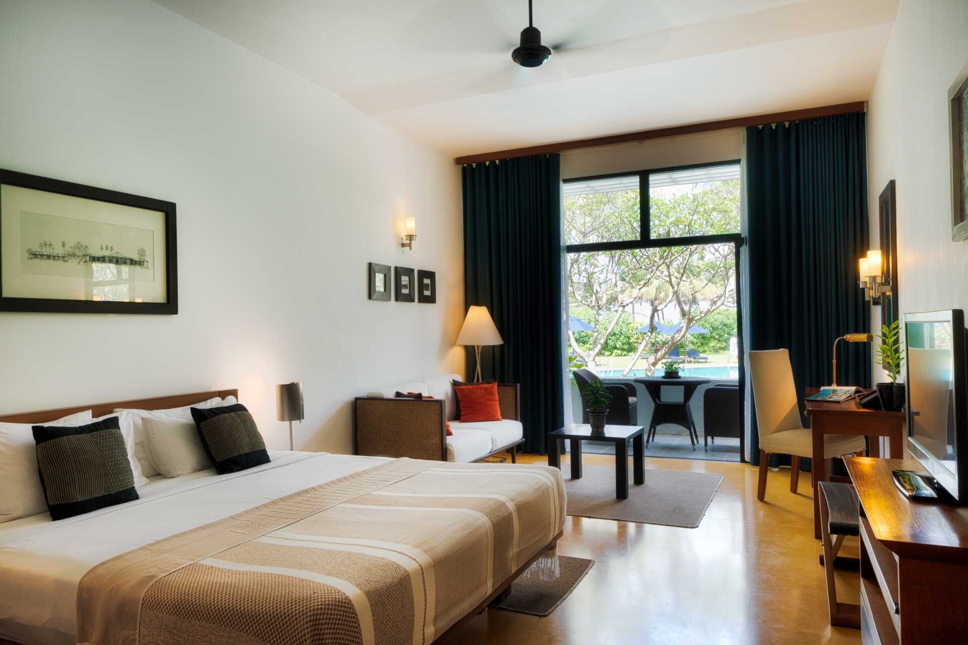Deluxerum med balkong eller terrass och begränsad havsutsikt. En dubbelsäng eller två enkelsängar. Möjlighet till extrabädd för en person. Wifi, luftkonditionering och deponering ingår. Vattenkokare samt kaffe och te. Tv med internationella kanaler. Badrockar och tofflor. Badrum med badkar och separat dusch samt wc. Städning 7 ggr/vecka.