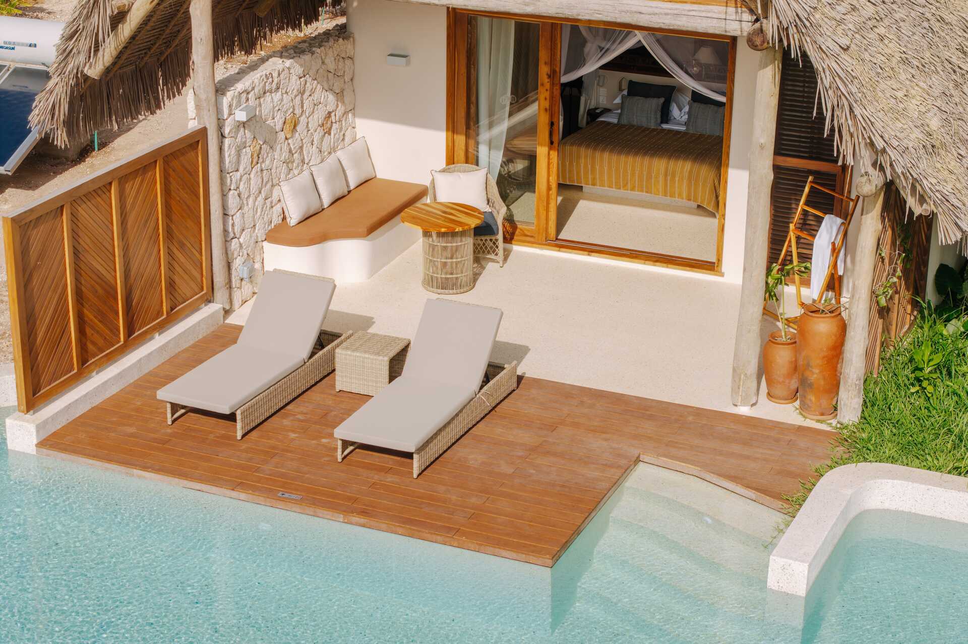 Villa deluxe med en privat poolmarkterrass med en privat pool. Rummen ligger på en ca 5 minuters promenad från stranden. Ett trädäck med två solstolar och en terrass med bord och stolar. Wifi, luftkonditionering och deponering ingår. Takfläkt. Minibar. Vattenkokare samt kaffe och te. Hårtork. Badrum med två handfat, två duschar och en separat wc. Städning 7 ggr/vecka.