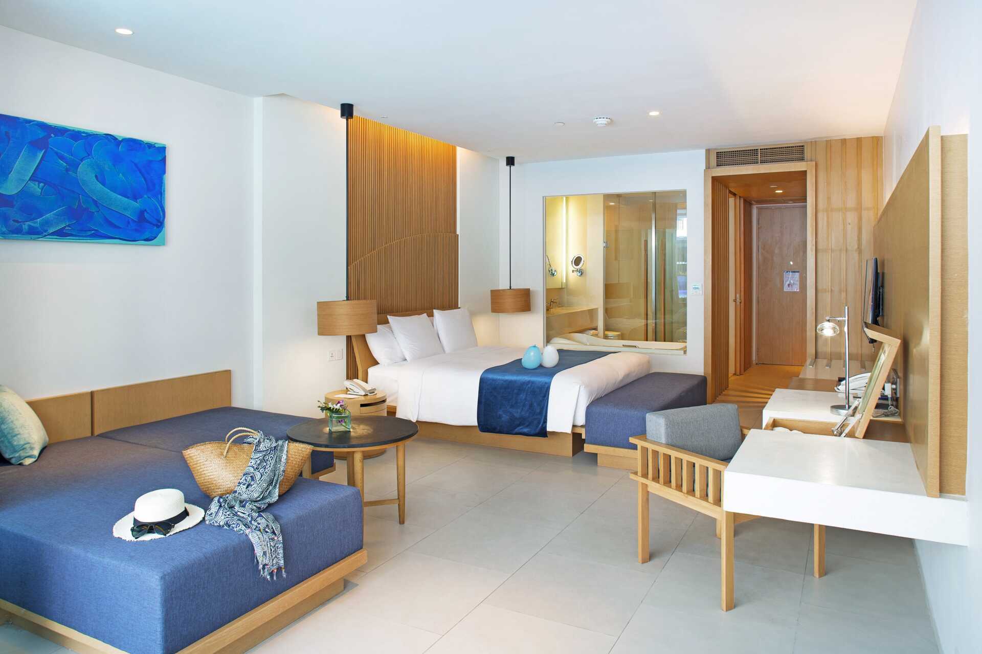 Superiorrum med balkong eller terrass. Två bredare enkelsängar. Möjlighet till extrabädd i bäddsoffa/dagbädd. Wifi, luftkonditionering och deponering ingår. Kylskåp - två flaskor med vatten ingår och fylls på varje dag. Vattenkokare samt kaffe och te. Tv med internationella kanaler. Paraply. Badrockar och tofflor. Strykjärn och strykbräda. Hårtork. Badrum med badkar, separat dusch samt wc. Städning 7 ggr/vecka.