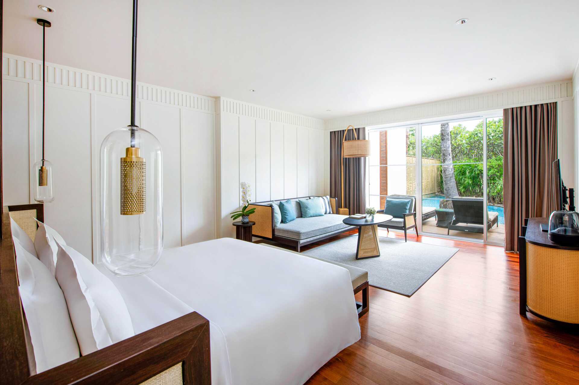 Poolsvit med privat pool på uteplatsen. På uteplatsen finns solstolar. Sviterna liger i Beach wing. En dubbelsäng eller två enkelsängar. Möjlighet till extrabädd för en person. Wifi, luftkonditionering och deponering ingår. Minibar, en flaska vatten per dag ingår. Vattenkokare samt kaffe och te. Tv med internationella kanaler. Strykjärn och strykbräda. Badrockar och tofflor. Hårtork. Badrum med badkar, separat dusch samt wc. Städning 7 ggr/vecka. Barn under två år räknas in i max antal personer i rummet.