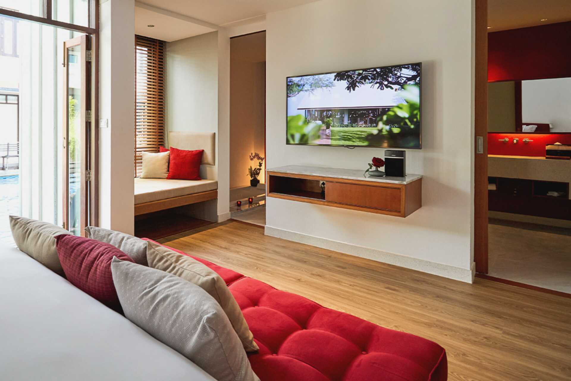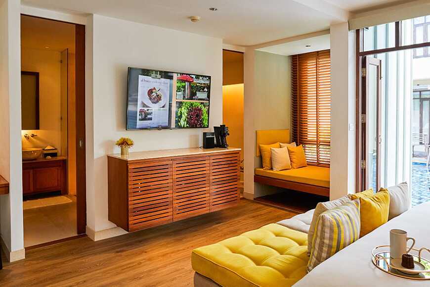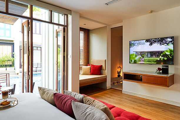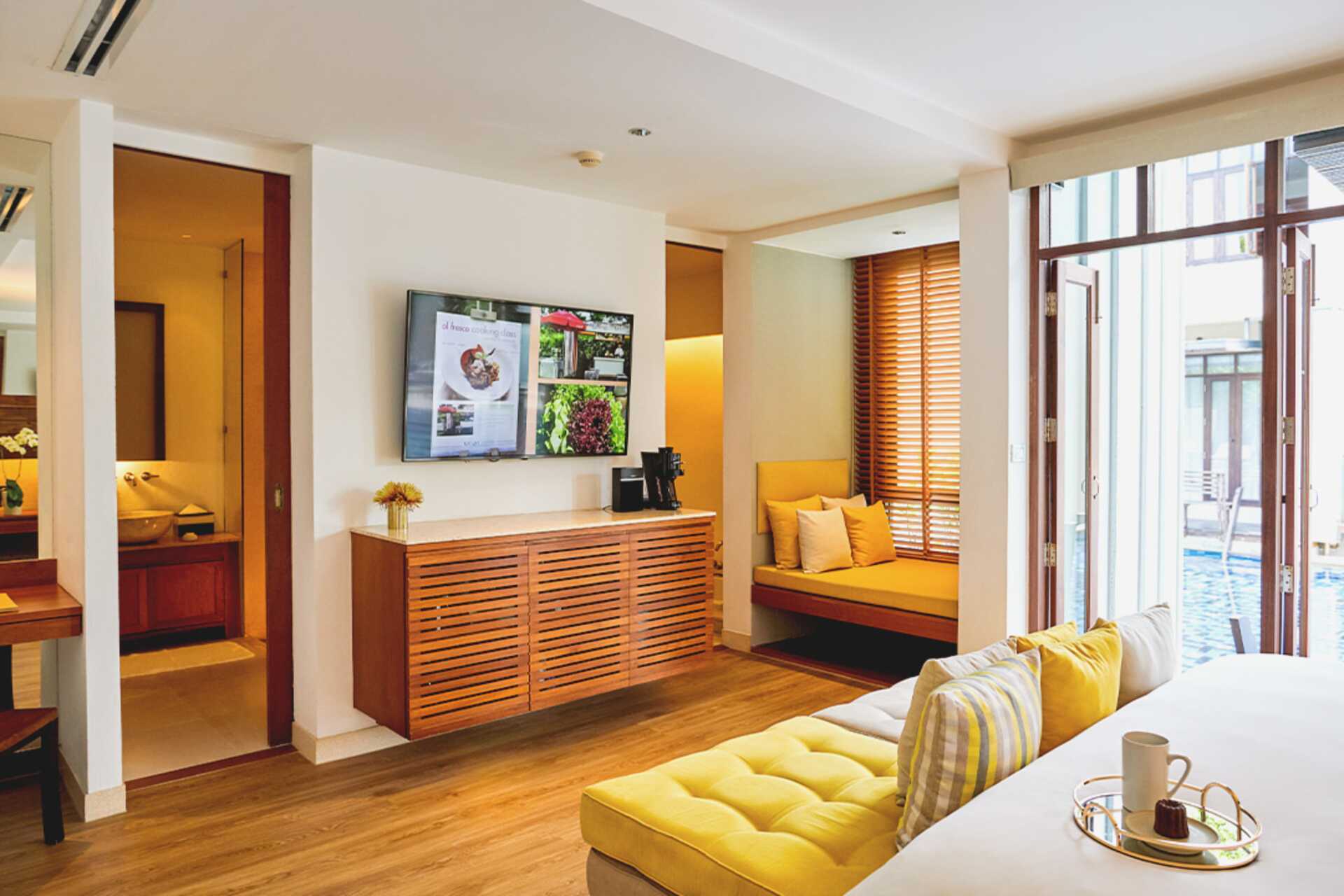 Poolsvit med uteplats till en gemensam delad pool. En dubbelsäng eller två enkelsängar. Möjlighet till extrabädd. Wifi, luftkonditionering och deponering ingår. Minibar. Kaffemaskin. Vattenkokare samt kaffe och te. Tv med internationella kanaler. Strykjärn och strykbräda. Badrockar och tofflor. Hårtork. Badrum med jacuzzi, separat dusch samt wc. Städning 7 ggr/vecka.