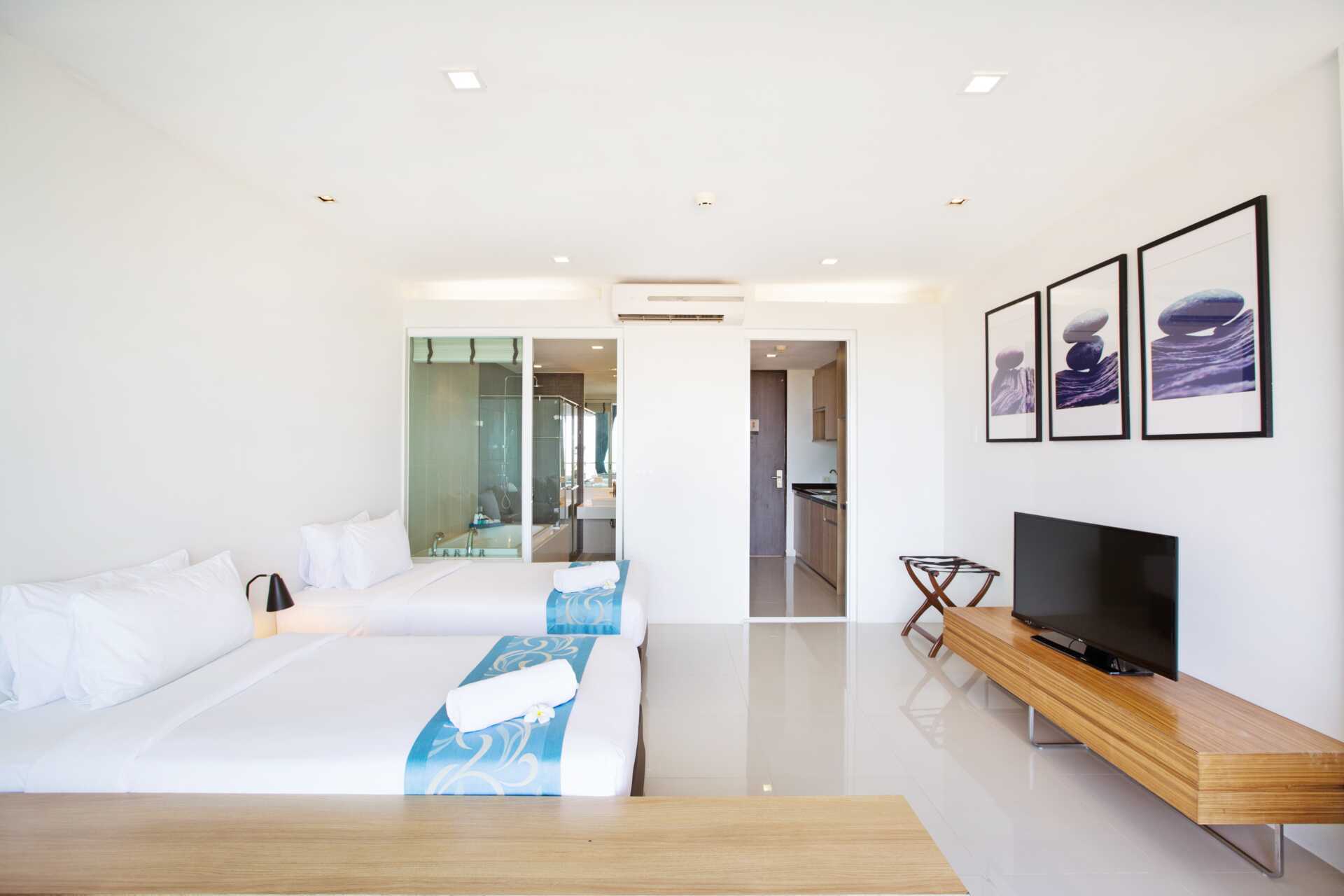 Familjerum med balkong eller terrass. Familjerummet består av två sovrum som skiljs åt av en skjutdörr. Några rum har en nivåskillnad med ett trappsteg. En dubbelsäng eller två enkelsängar i varje sovrum. Wifi, luftkonditionering och deponering ingår. Kylskåp - två flaskor med vatten ingår per dag. Vattenkokare samt kaffe och te. Tv med internationella kanaler. Badrockar och tofflor. Hårtork. Badrum med badkar, dusch samt wc. Städning 7 ggr/vecka.