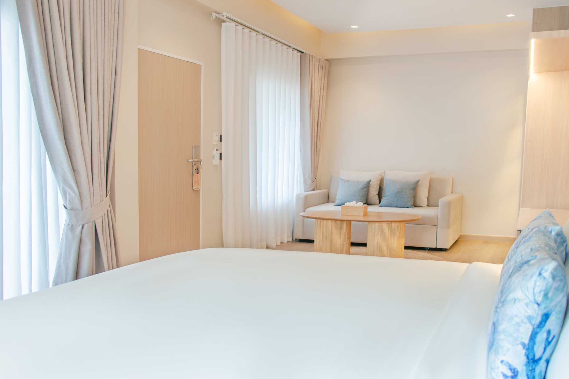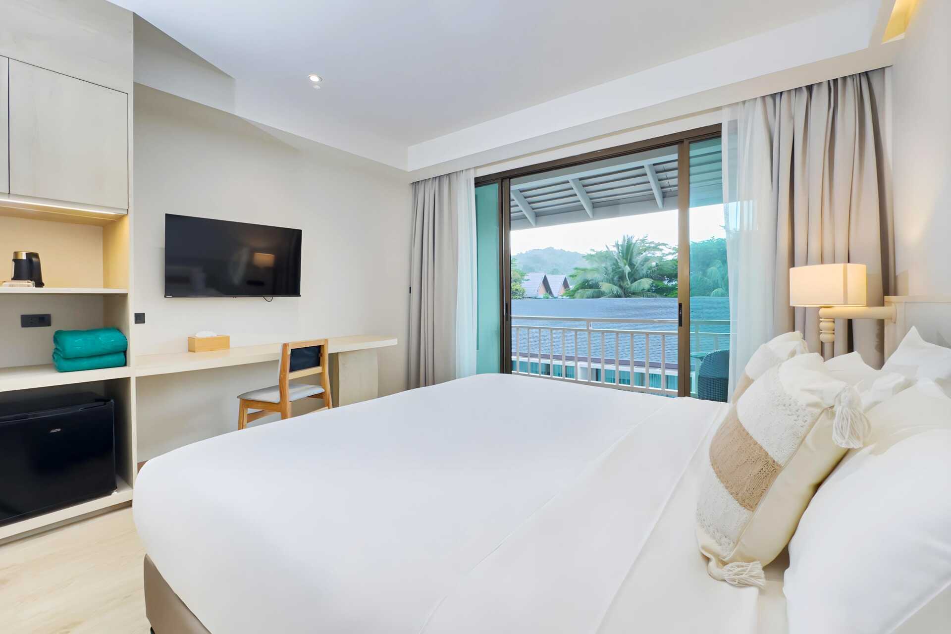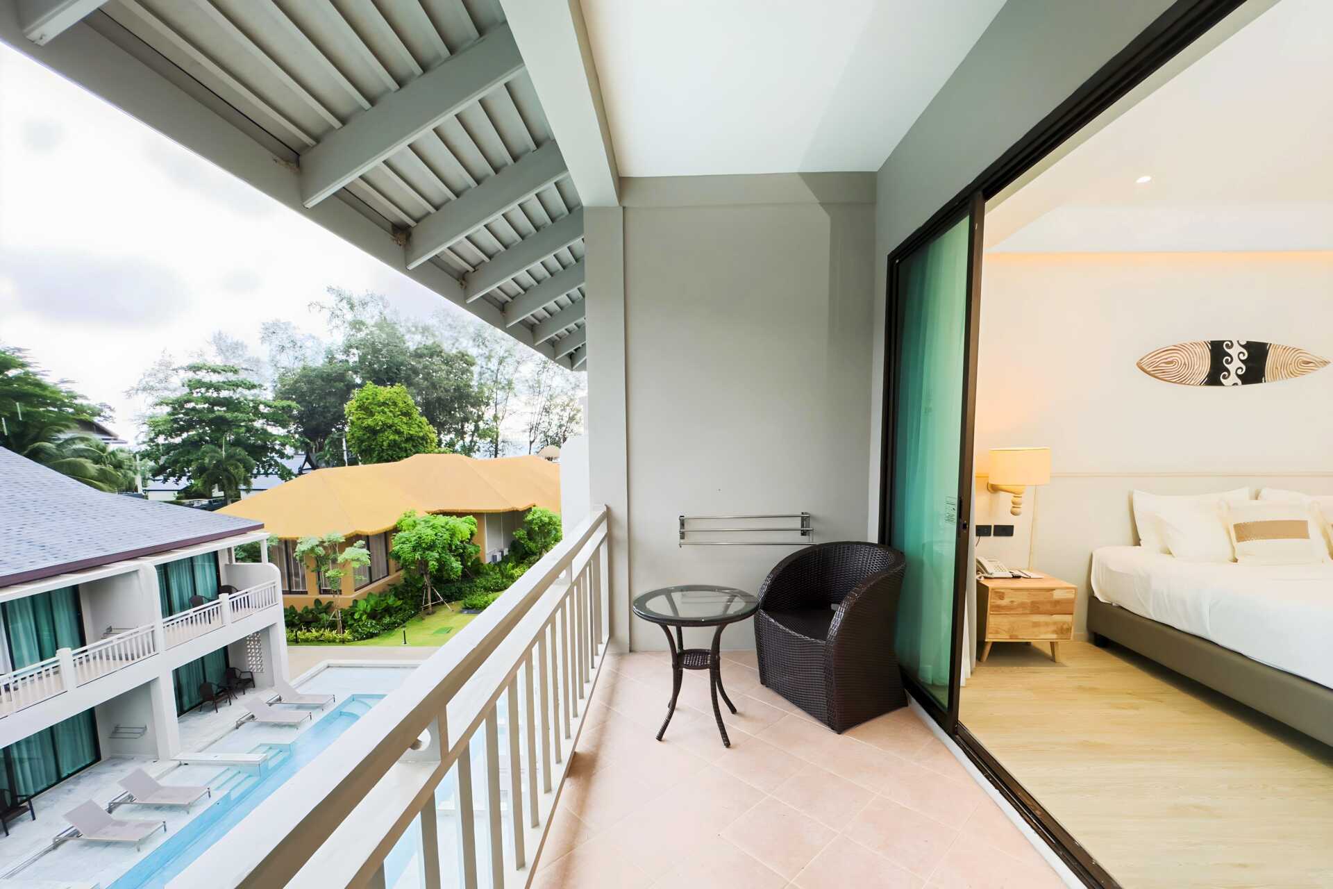 Deluxerum med balkong. En dubbelsäng eller två enkelsängar. Möjlighet till extrabädd i bäddsoffa. Wifi, luftkonditionering och deponering ingår. Kylskåp. Vattenkokare samt kaffe och te. Tv med internationella kanaler. Hårtork. Badrockar och tofflor. Badrum med badkar och wc. Städning 7 ggr/vecka. Barn under två år räknas in i max antal personer i rummet.
