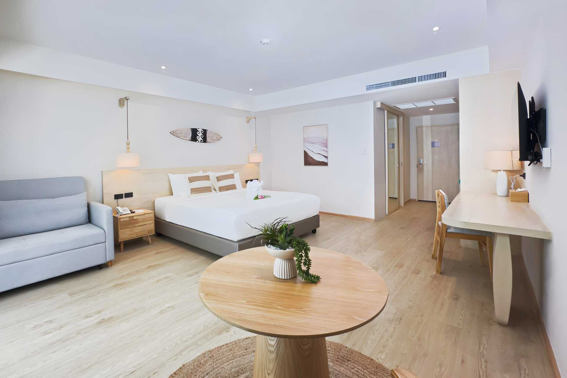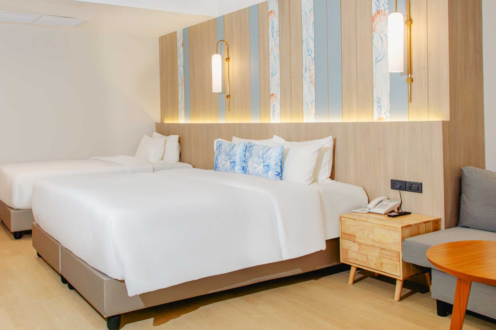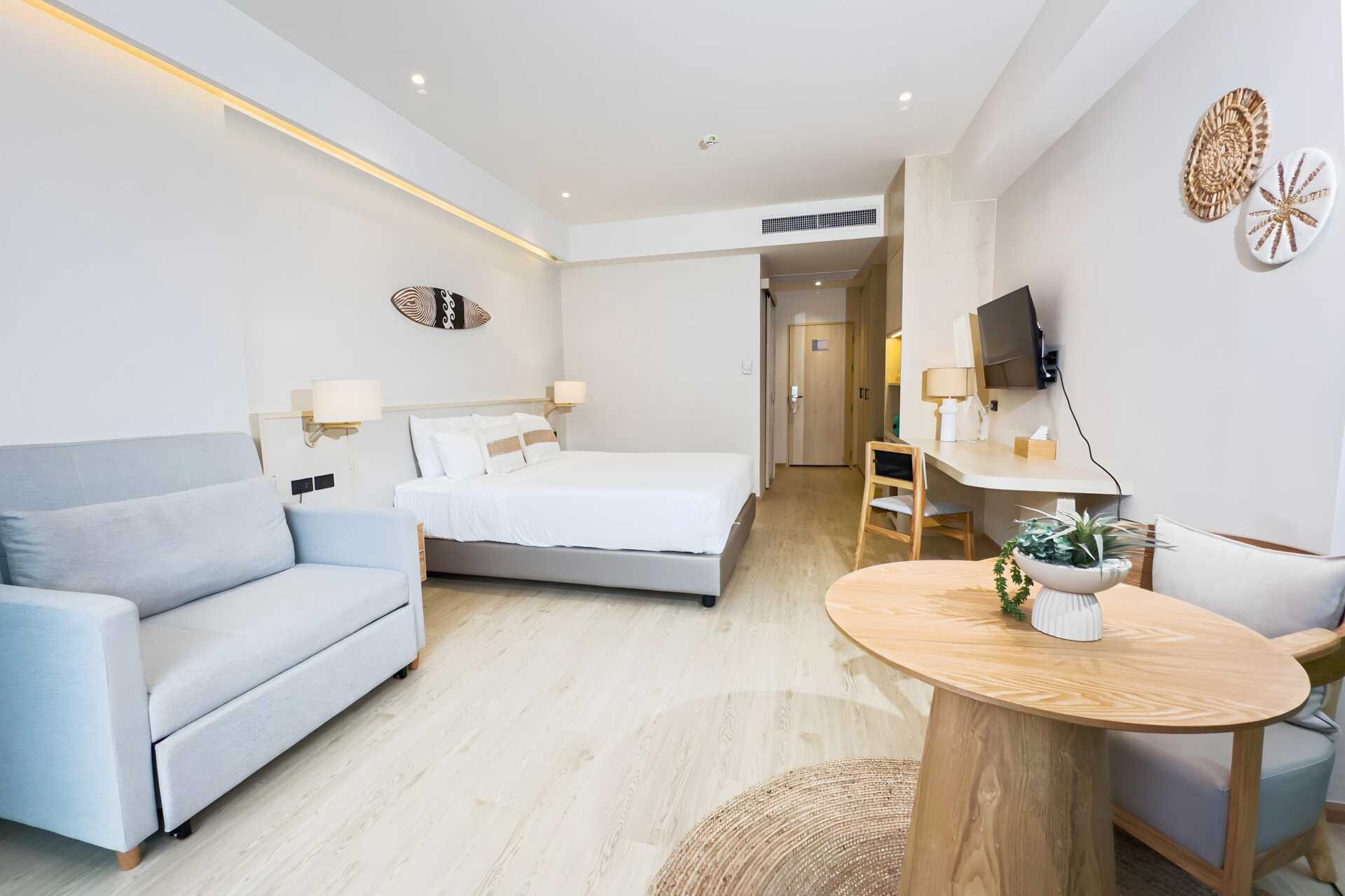 Familjerum med balkong. En dubbelsäng eller två enkelsängar. Möjlighet till extrabädd i en enkelsäng eller i bäddsoffa. Fjärde person sover i befintliga sängar eller i bäddsoffa. Wifi, luftkonditionering och deponering ingår. Kylskåp. Vattenkokare samt kaffe och te. Tv med internationella kanaler. Hårtork. Badrock och tofflor. Badrum med badkar och wc. Städning 7 ggr/vecka. Barn under två år räknas in i max antal personer i rummet.
