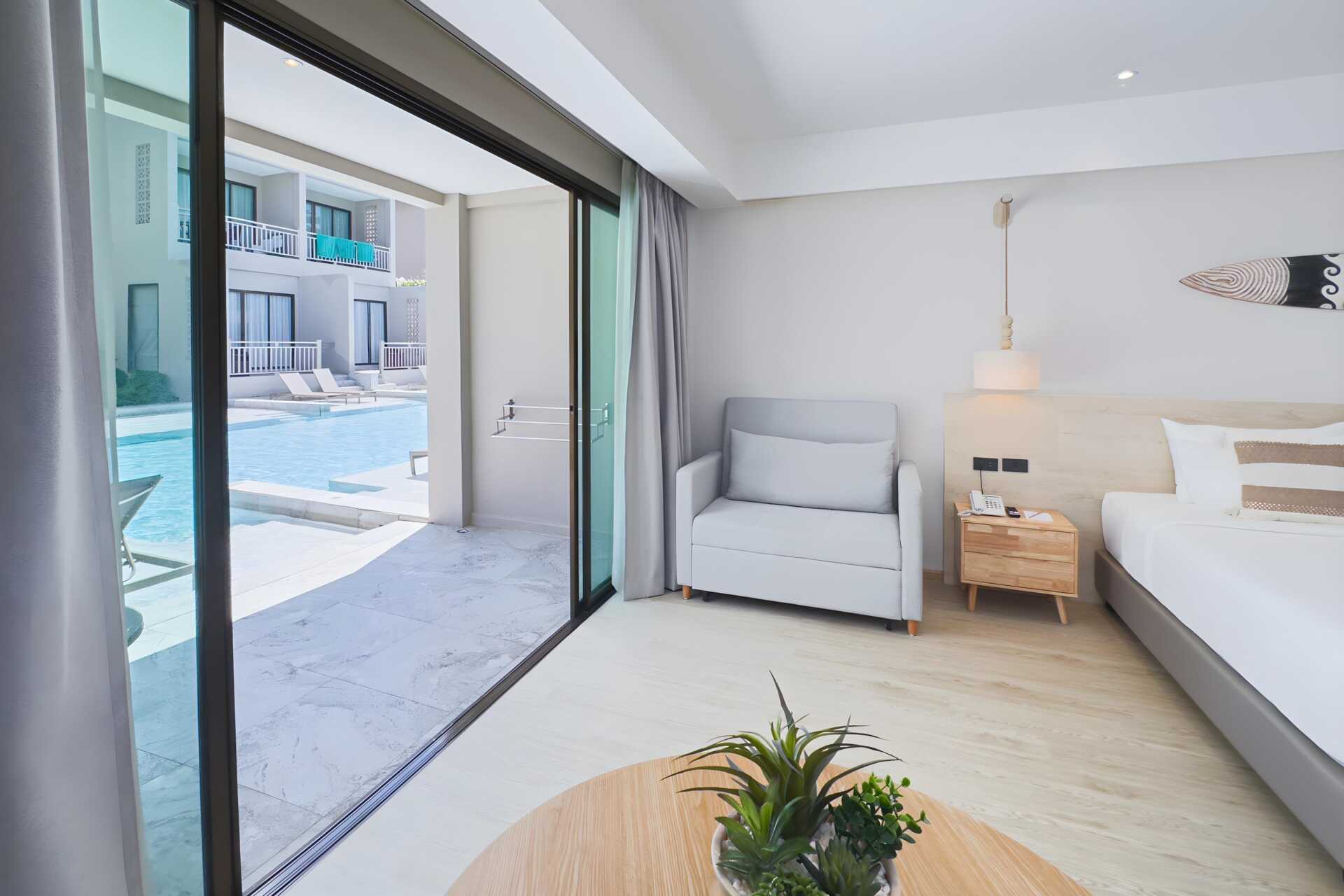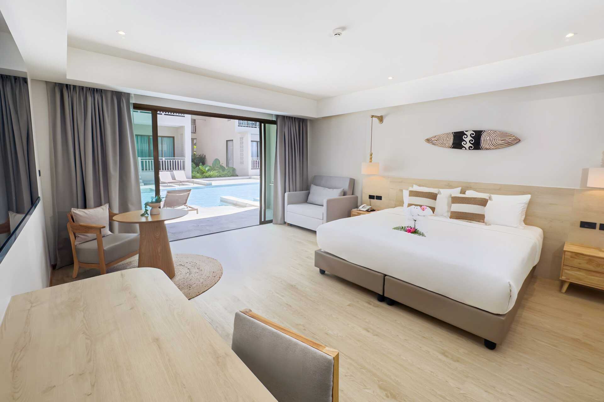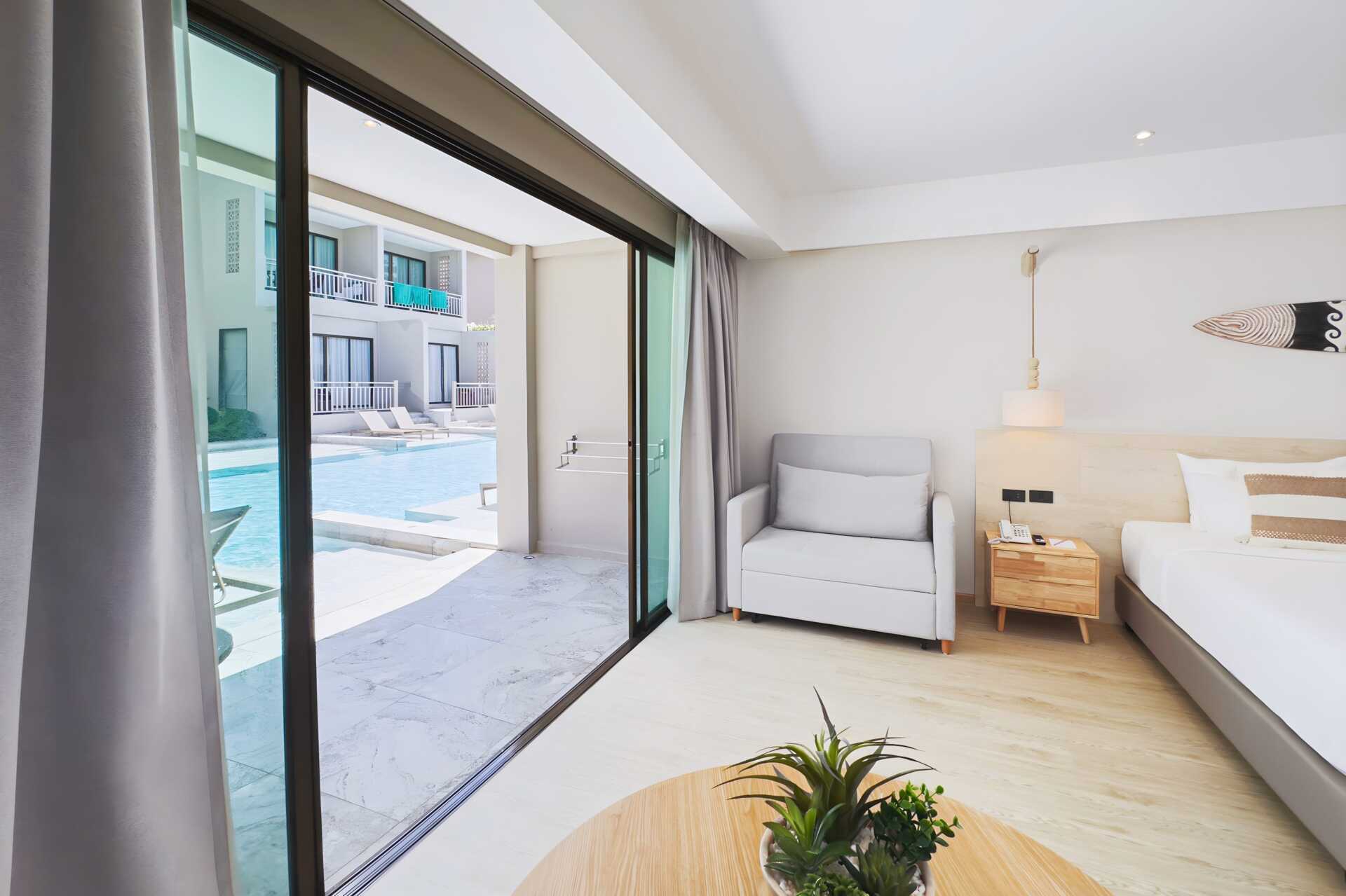 Dubbelrum med utgång till gemensam pool från markterrassen. På terrassen finns två solstolar samt bord och stolar samt. Rummen ligger i hotelldelen Hive Wing. En dubbelsäng. Möjlighet till extrabädd i bäddbar soffa. Wifi, luftkonditionering och deponering ingår. Kylskåp. Vattenkokare samt kaffe och te. Tv med internationella kanaler. Hårtork. Badrockar och tofflor. Badrum med badkar och wc. Städning 7 ggr/vecka. Barn under två år räknas in i max antal personer i rummet.