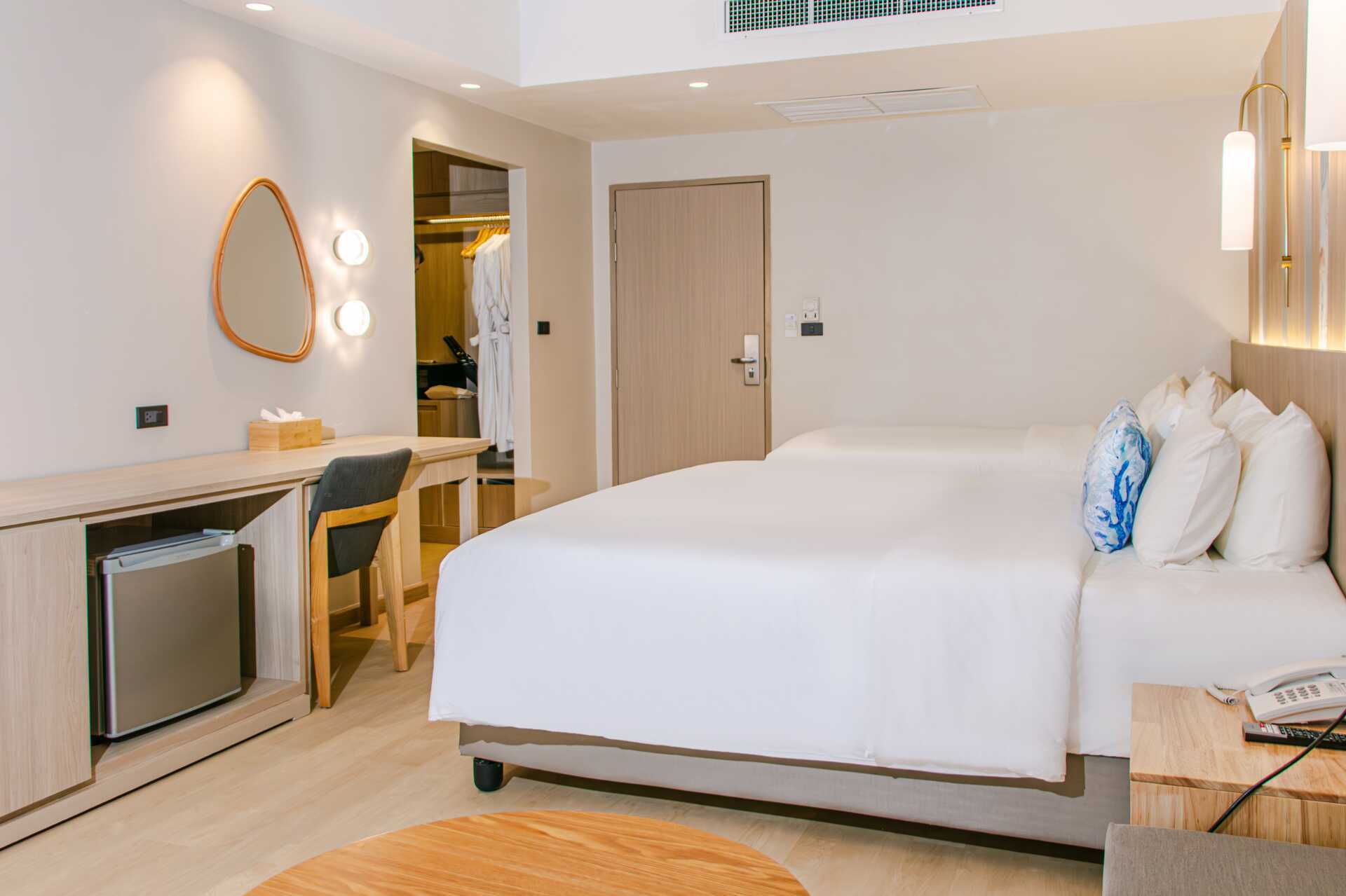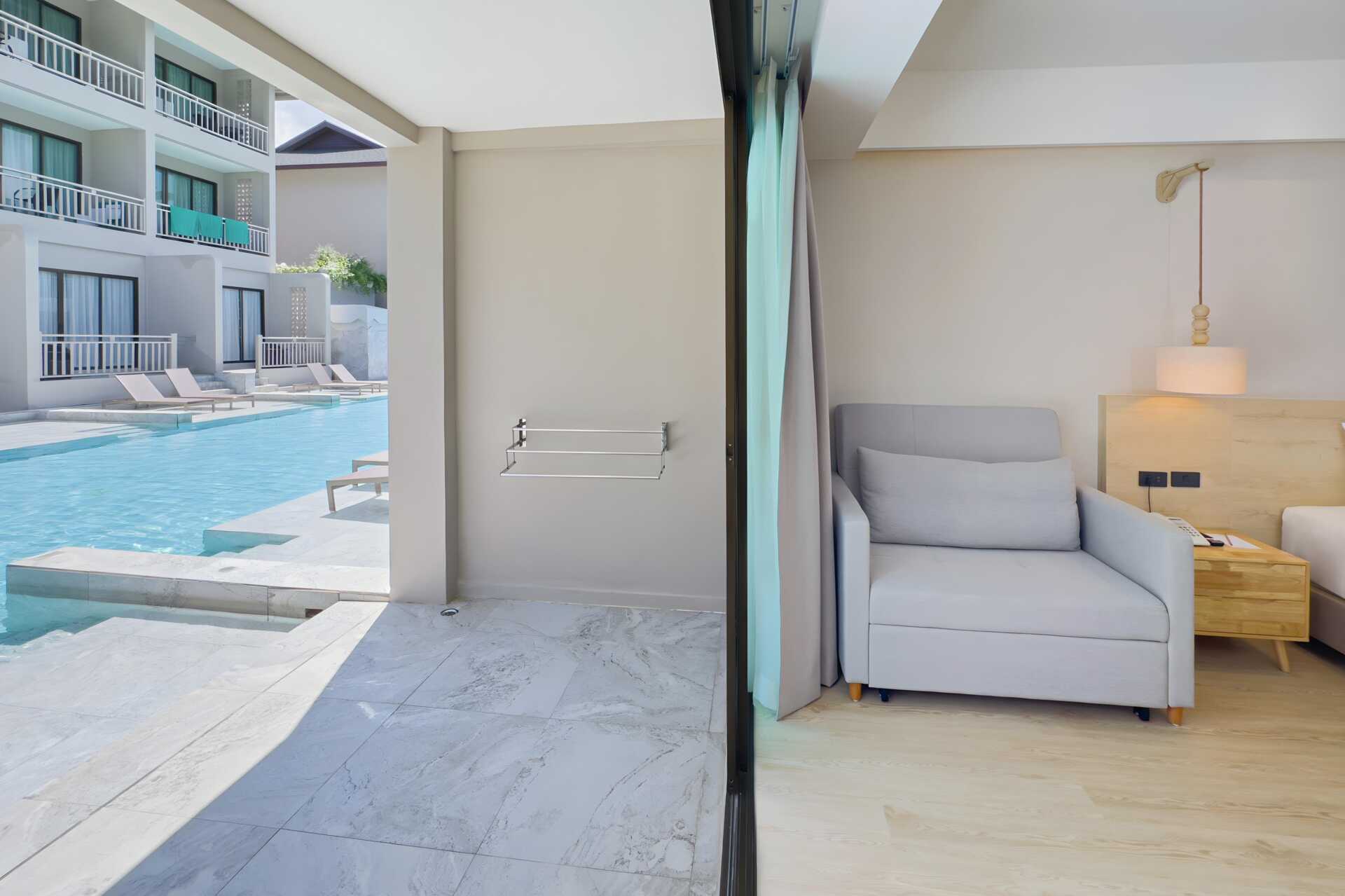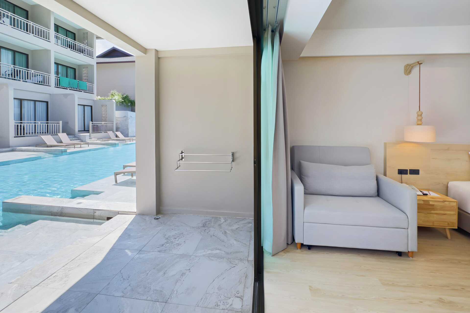 Dubbelrum med utgång till gemensam pool från markterrassen. På terrassen finns två solstolar samt bord och stolar samt. Rummen ligger i hotelldelen Hive Wing. En dubbelsäng. Möjlighet till extrabädd i bäddbar soffa. Wifi, luftkonditionering och deponering ingår. Kylskåp. Vattenkokare samt kaffe och te. Tv med internationella kanaler. Hårtork. Badrockar och tofflor. Badrum med badkar och wc. Städning 7 ggr/vecka. Barn under två år räknas in i max antal personer i rummet.
