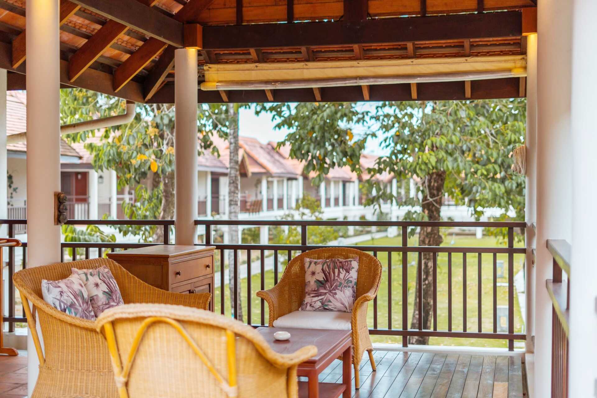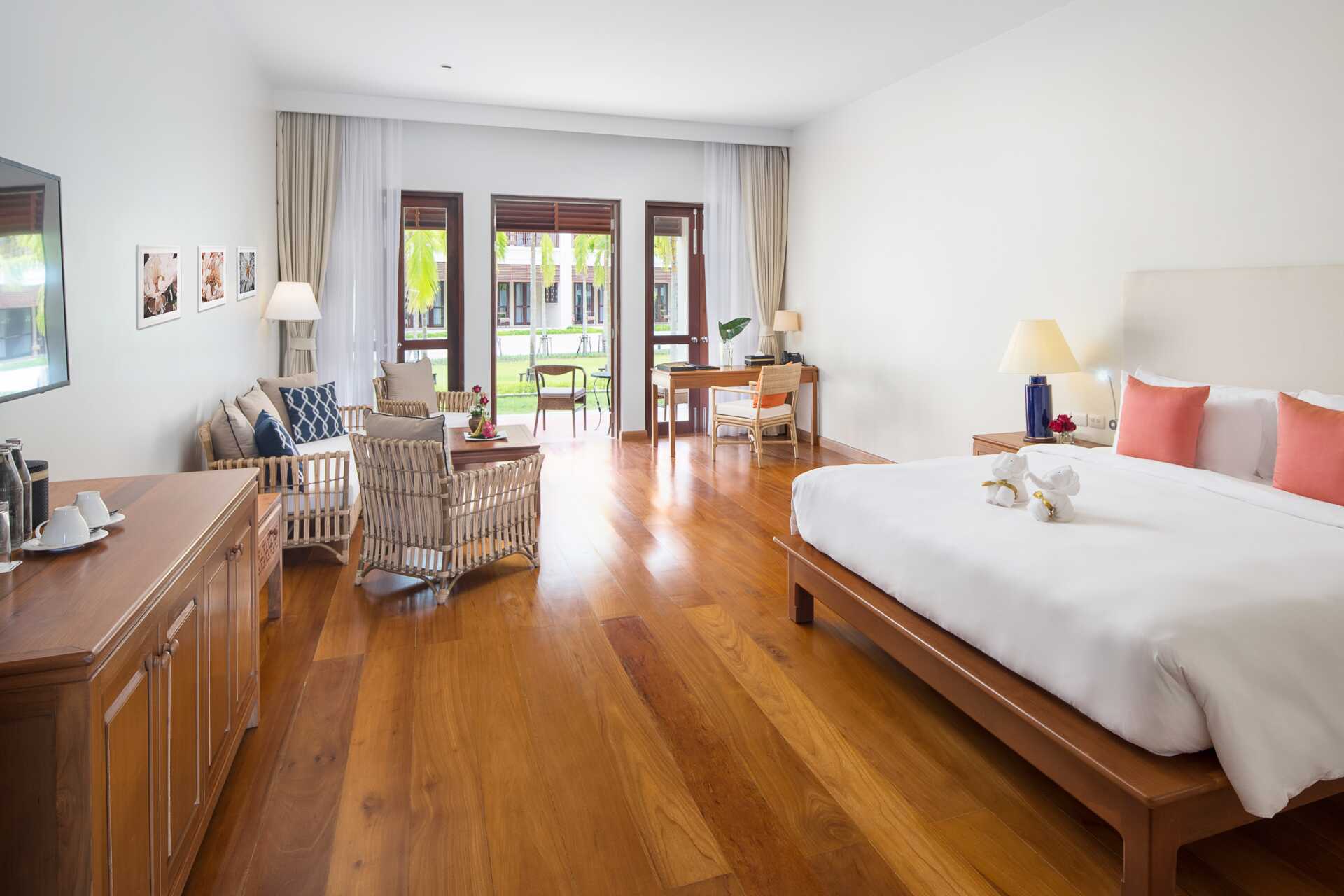 Deluxerum i bungalow med balkong eller terrass. Trappa upp till entrén till rummen. På uteplatsen finns bord och stolar. En bredare enkelsäng och en dubbelsäng. Möjlighet till extrabäddar i befintliga sängar. Wifi, luftkonditionering och deponering ingår. Minibar mot avgift. Vattenkokare. Tv med internationella kanaler. Badrockar och tofflor. Hårtork. Badrum med badkar, separat dusch samt wc. Städning 7 ggr/vecka.