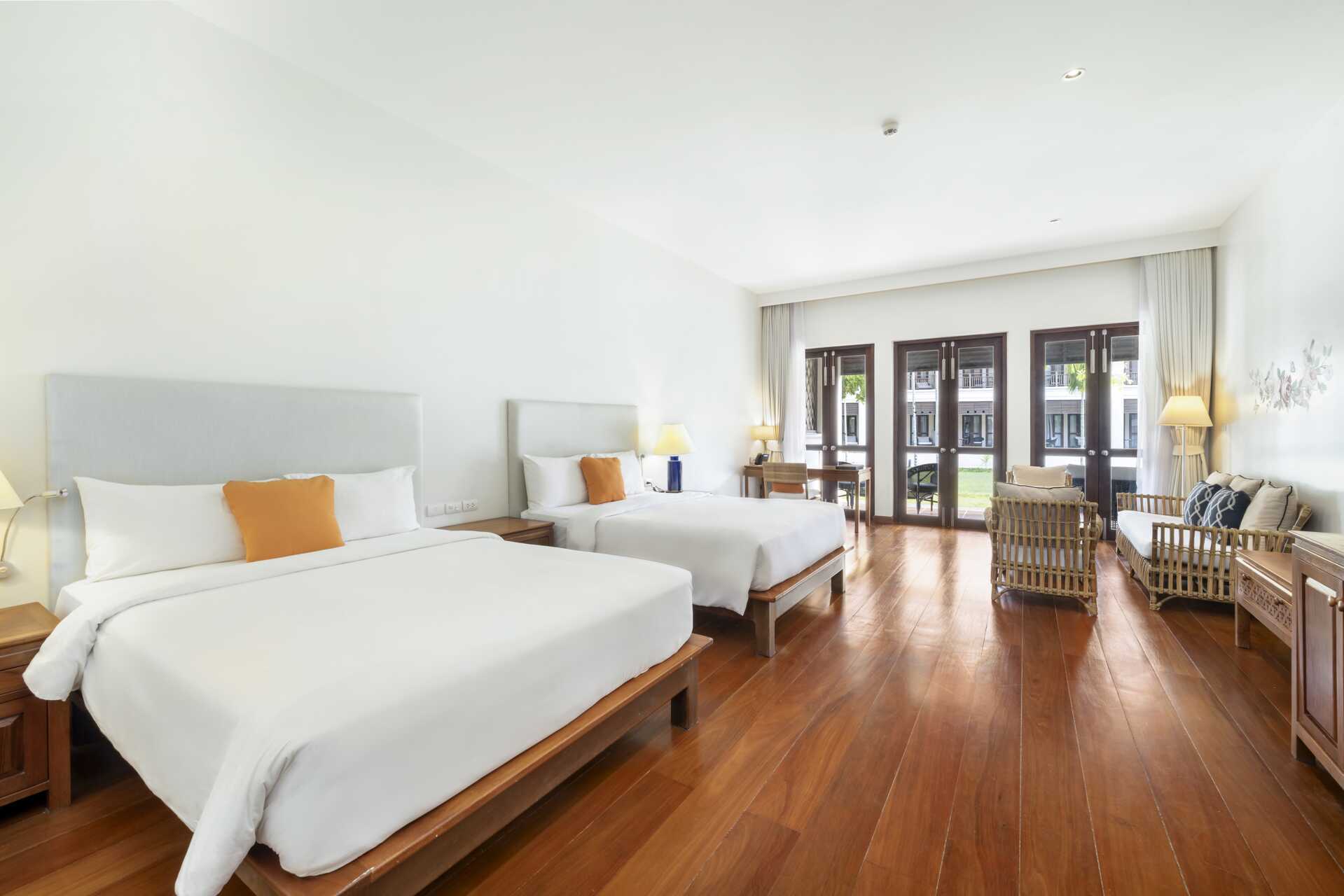 Deluxerum med balkong. En dubbelsäng eller två breda enkelsängar alternativt tre breda enkelsängar. Möjlighet till extrabädd i enkelsäng. Wifi, luftkonditionering och deponering ingår. Minibar mot avgift. Vattenkokare. Walk-in closet. Tv med internationella kanaler. Badrockar och tofflor. Hårtork. Badrum badkar, separat dusch samt wc. Städning 7 ggr/vecka.