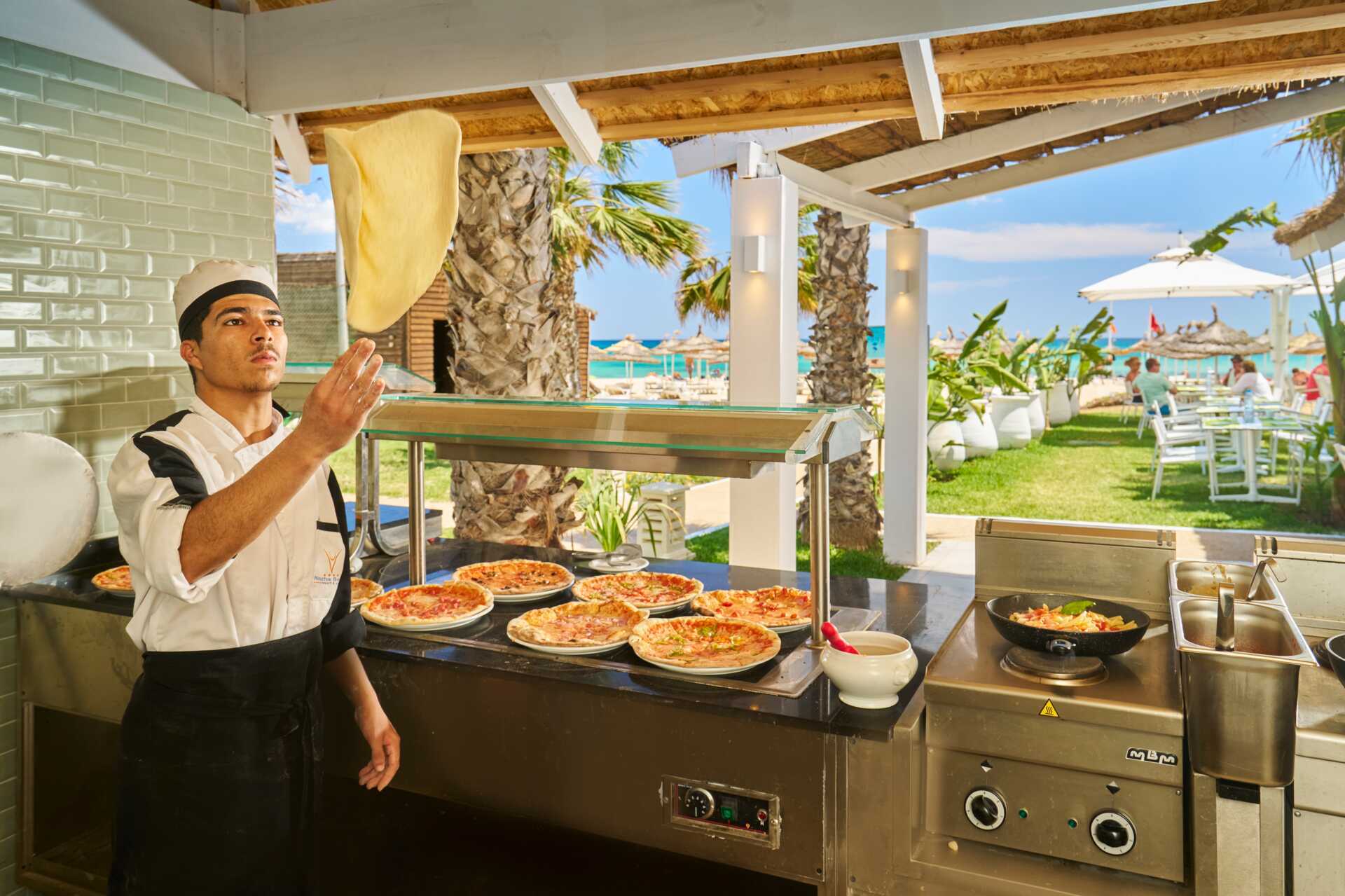 Nozha Beach Resort & Spa har en bufférestaurang och två à la carte-restauranger med rätter från köken runt Medelhavet respektive det tunisiska köket. Bordsreservation krävs i à la carte-restaurangerna som har öppet sex kvällar per vecka. Vårdad klädsel vid middagarna. Det finns även en strandbar/restaurang och en poolbar i perioden 1 juni till 15 september. I poolbaren serveras pannkakor, pizza, smörgåsar, donuts och glass till barnen. Bar i lobbyn och ett moriskt café.