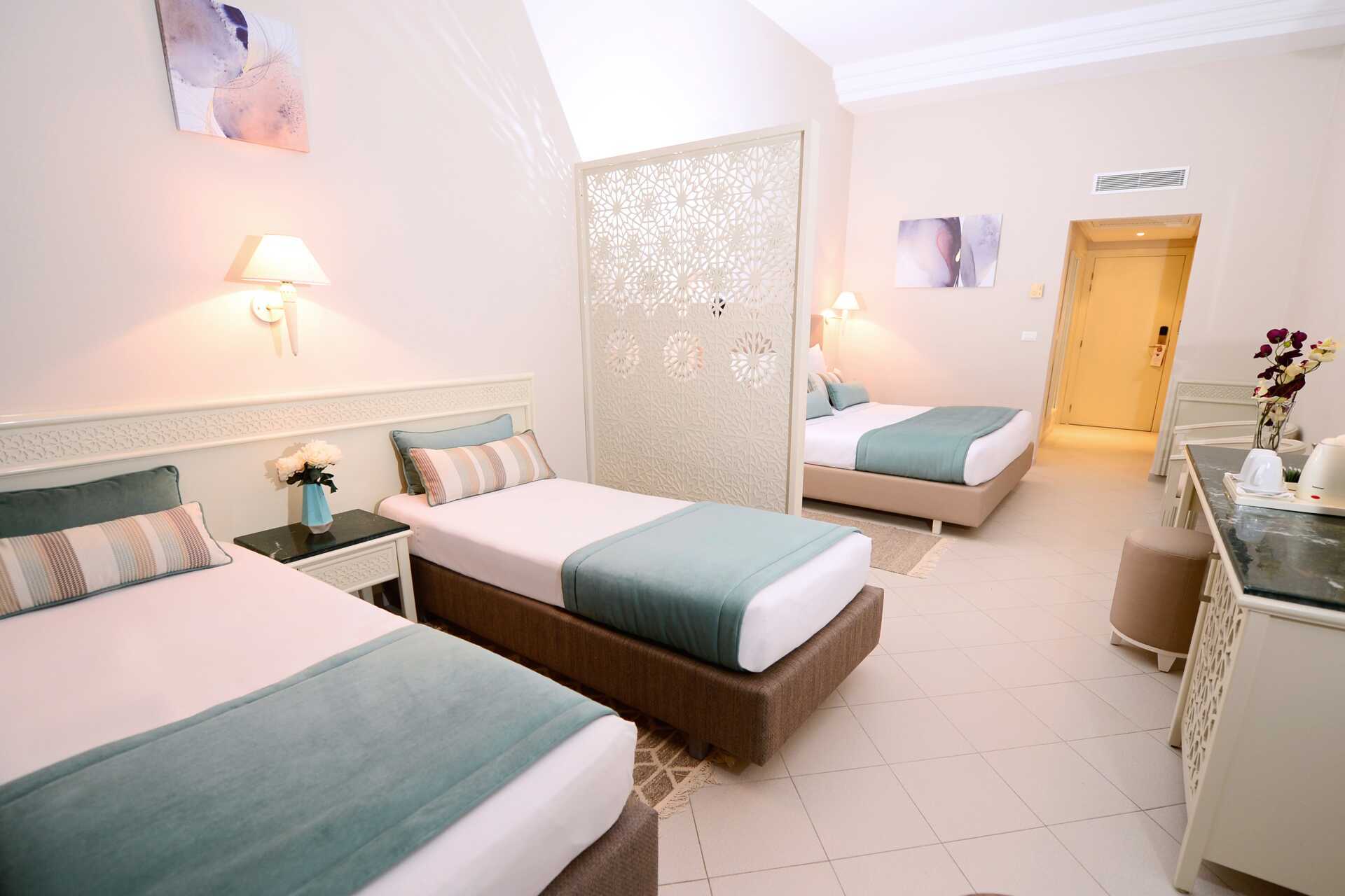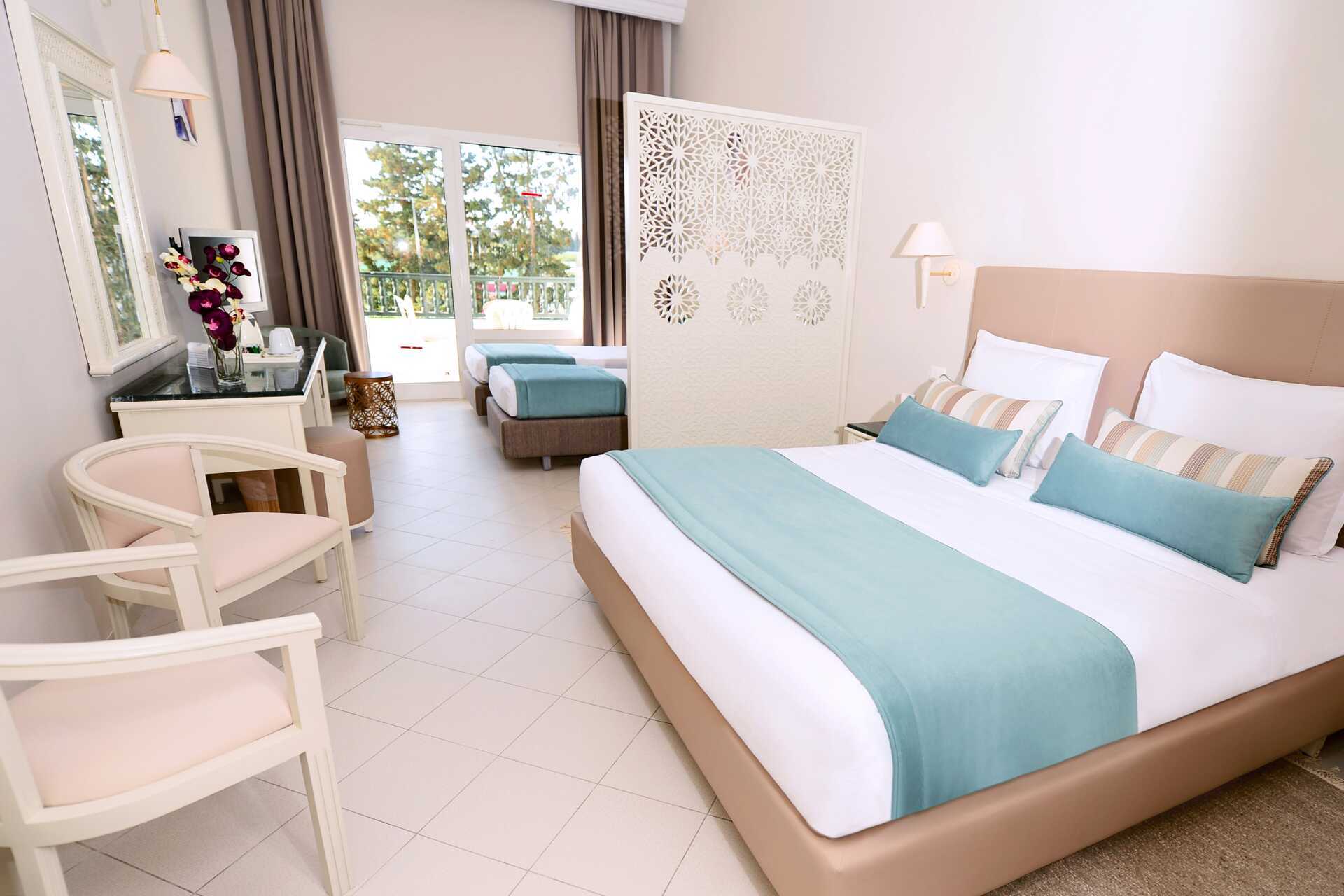Familjerum med balkong eller terrass. En dubbelsäng och två enkelsängar. Möjlighet till extrabäddar i befintliga sängar. Wifi och deponering ingår. Luftkonditionering ingår i perioden 11 juni till 15 september. Kylskåp. Tv med internationella kanaler. Hårtork. Badrum med badkar eller dusch samt wc. Städning 7 ggr/vecka. Barn under två år räknas in i maxantalet personer i rummet.