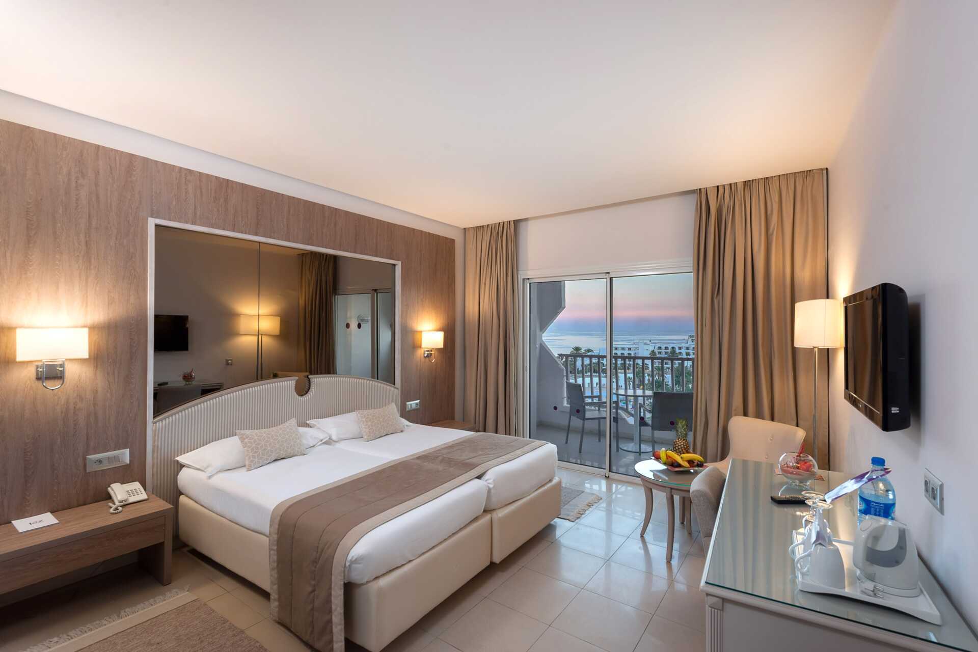 Deluxerum med balkong och havsutsikt. Deluxerummet består av en sovrumsdel och en vardagsrumsdel med soffa, bord och stolar. En dubbelsäng. Möjlighet till extrabädd i hopfällbar säng. Wifi, luftkonditionering och deponering ingår. Minibar mot avgift, en flaska vatten ingår och fylls på varje dag. Tv med internationella kanaler. Hårtork. Badrum med dusch och wc. Städning 7 ggr/vecka.