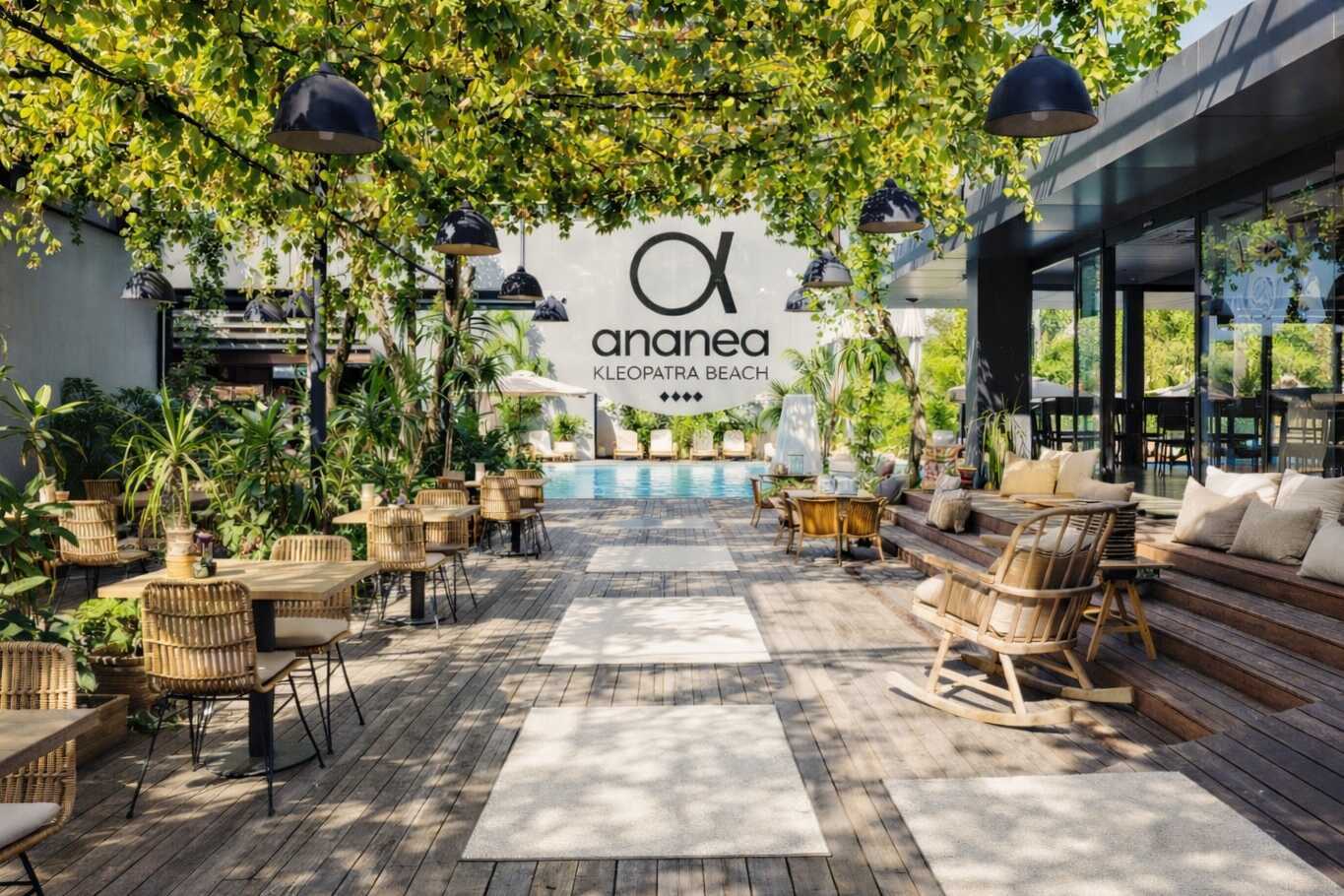 ananea Kleopatra Beach, ett modernt hotell med trendig miljö där bra mat och snygga cocktails erbjuds från morgon till kväll. Hotellet består av flera byggnader och Apollo har rum i alla byggnader. Receptionen och huvudbyggnaden ligger på ena sidan av huvudvägen och förbinds med resterande hotellområde via en gångtunnel under vägen.