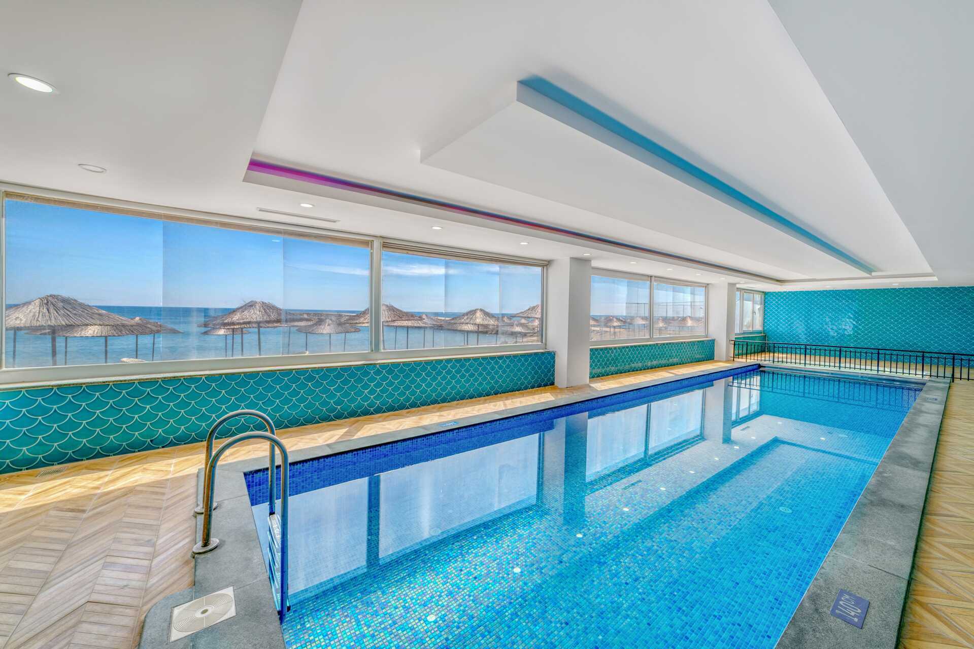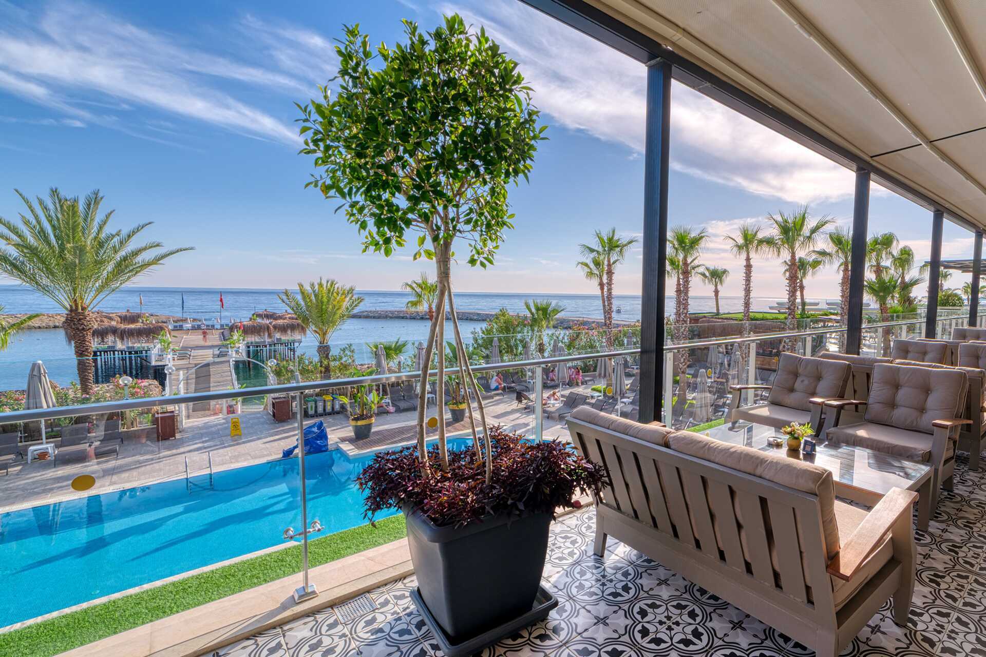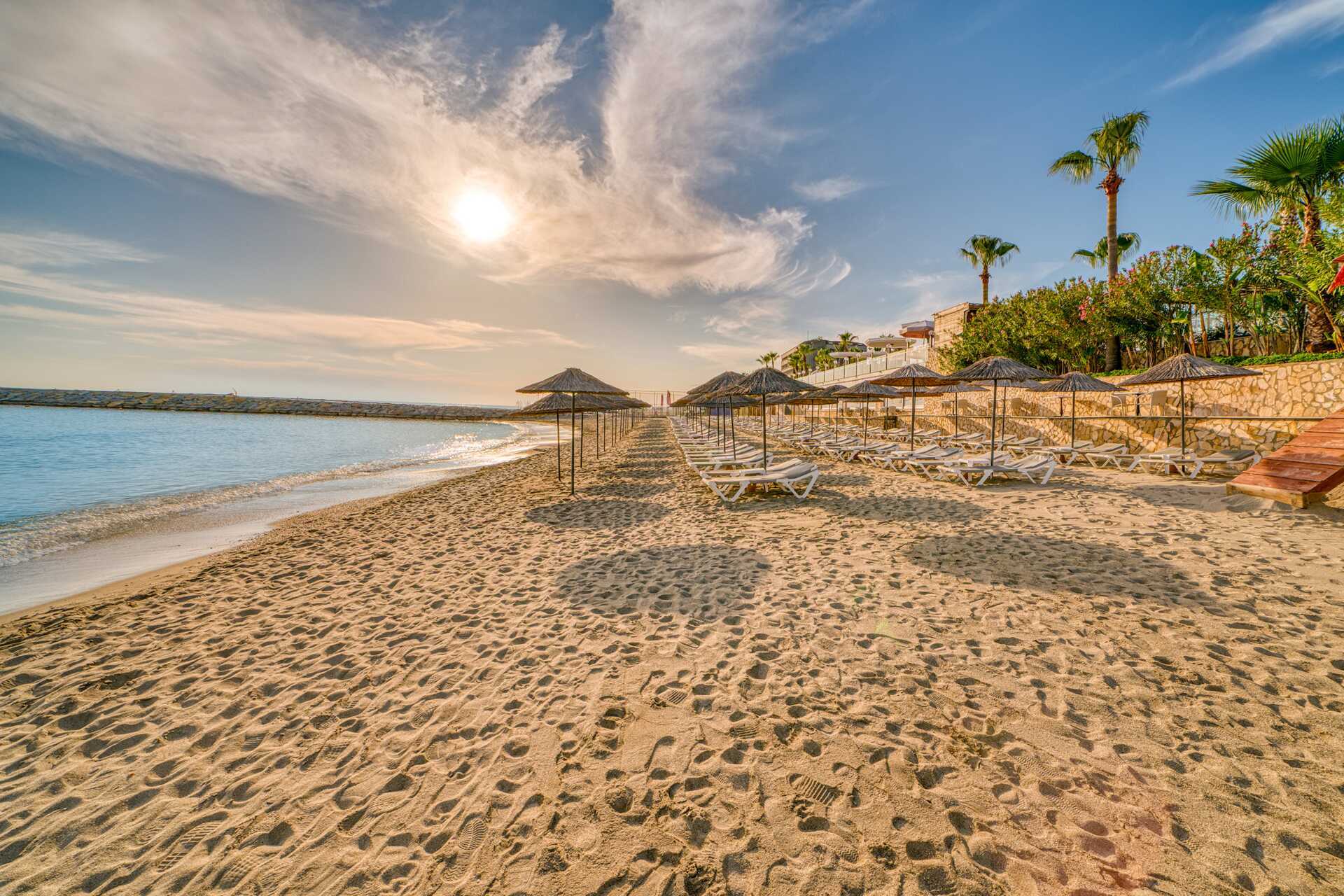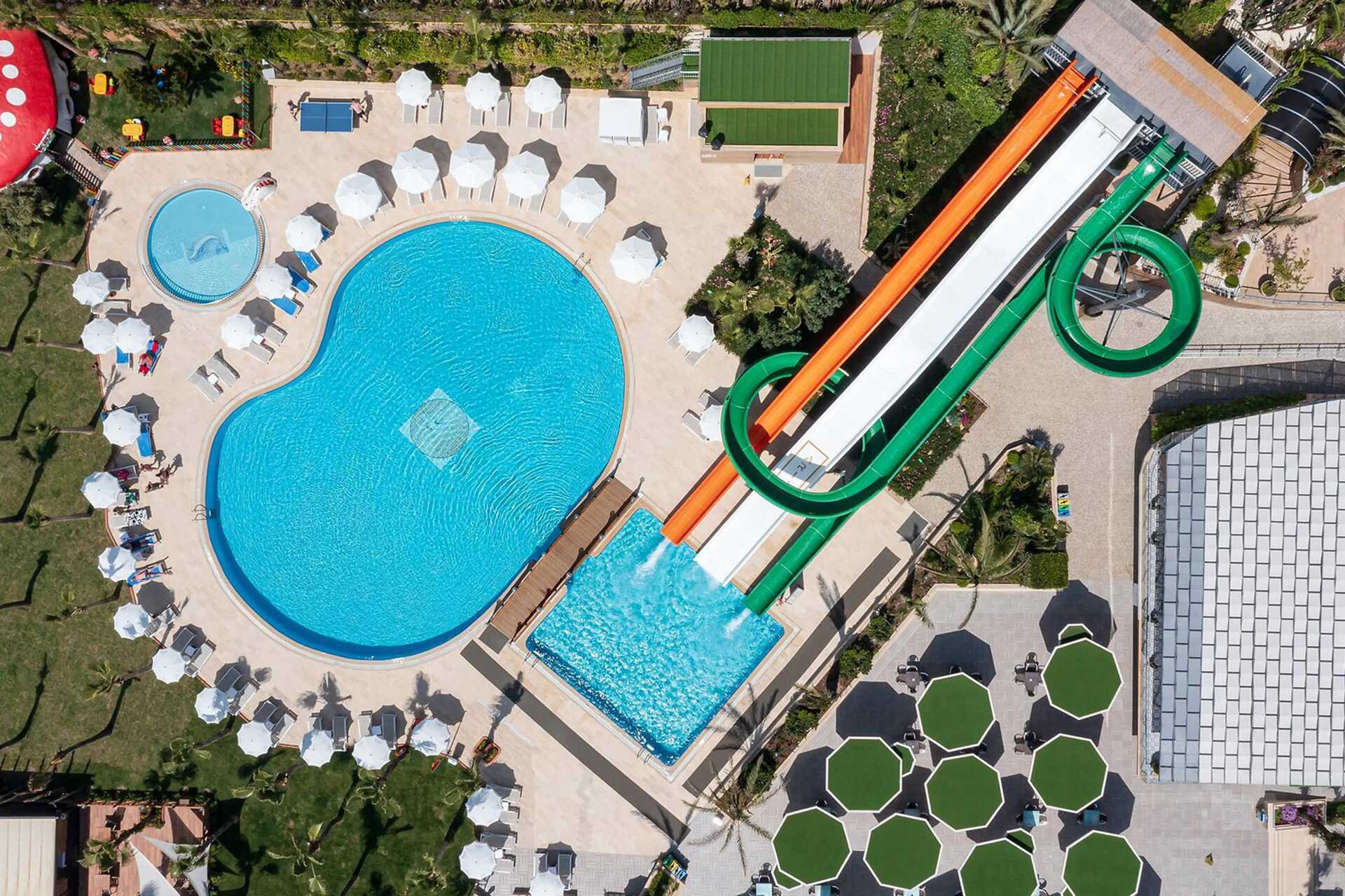 Poolområden med totalt tre pooler, vara en separat barnpool. Tre vattenrutschkanor öppna 10.00-12.00 och 14.00-16.00. Tänk på att alltid ha barnen under uppsikt när de åker i vattenrutschkanorna. Hotellets privata 250 meter långa strand är belönad med Blå Flagg för sin goda vattenkvalitet. Vid stranden, liksom vid poolerna finns solstolar och parasoller att låna. Poolhanddukar finns att låna vid spa-centret och kan bytas var tredje dag.