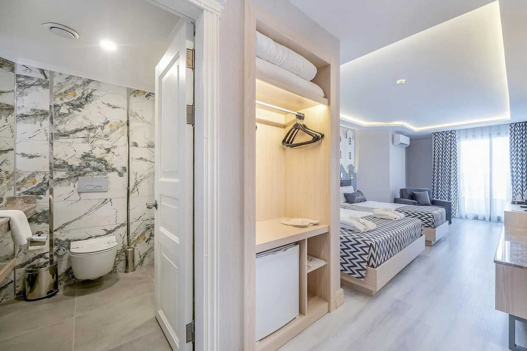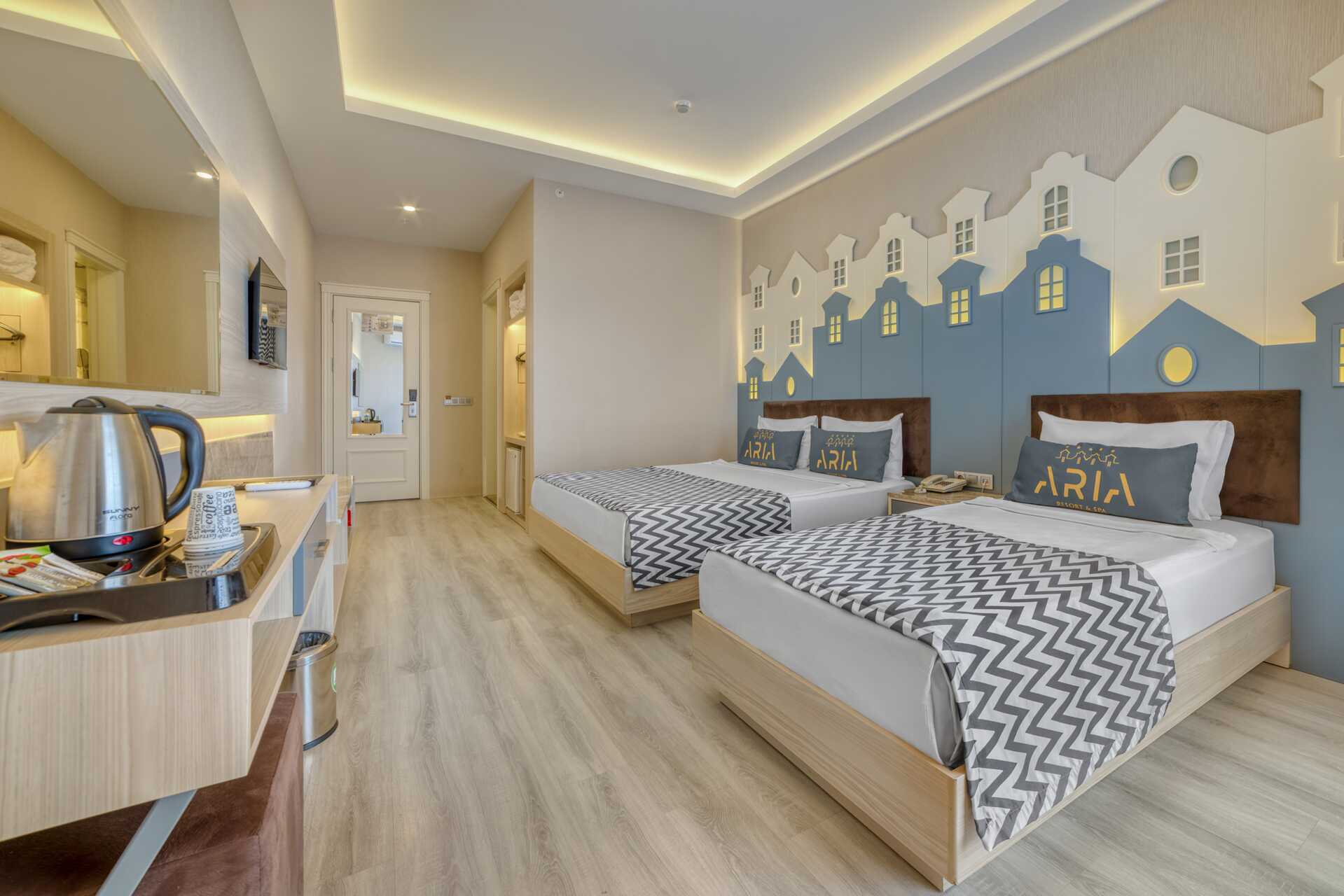 Familjerum med balkong. Två rum med en dubbelsäng och en enkelsäng i varje rum. Wifi, luftkonditionering och deponering ingår. Minibar som dagligen fylls med läsk och vatten. Vattenkokare samt kaffe och te. Tv med internationella kanaler. Tofflor. Hårtork. Två badrum med dusch och wc. Städning 7 grr/vecka.