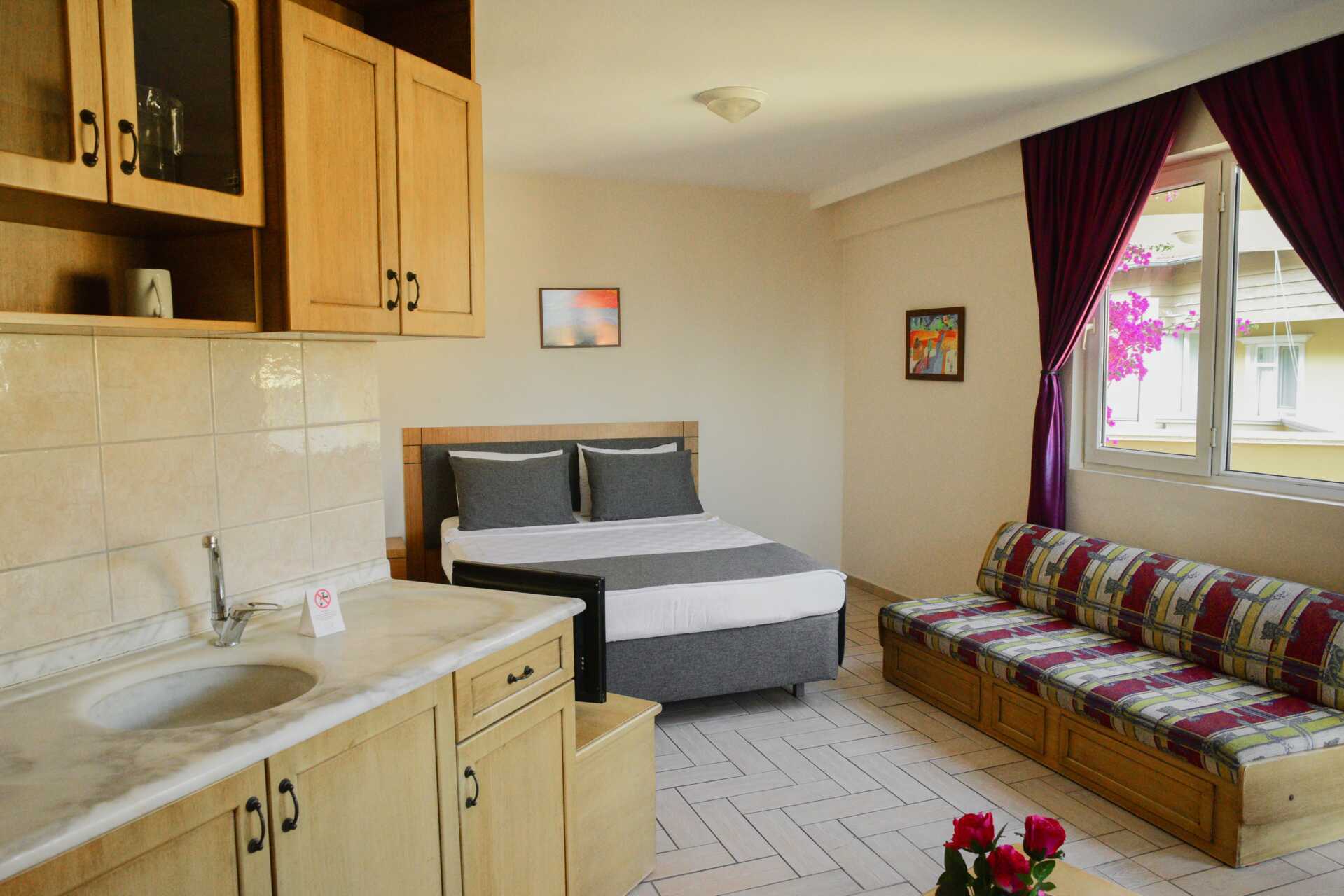 Tvårumslägenhet med balkong. Sovrum och kombinerat vardagsrum med minikök. En dubbelsäng eller två enkelsängar. Möjlighet till extrabäddar i bäddsoffa och enkelsäng. Wifi ingår. Luftkonditionering i vardagsrummet och deponering mot avgift. Minikök med kylskåp, kokplattor, vattenkokare och enkel köksutrustning. Hårtork. Badrum med dusch och wc. Städning 7 ggr/vecka.