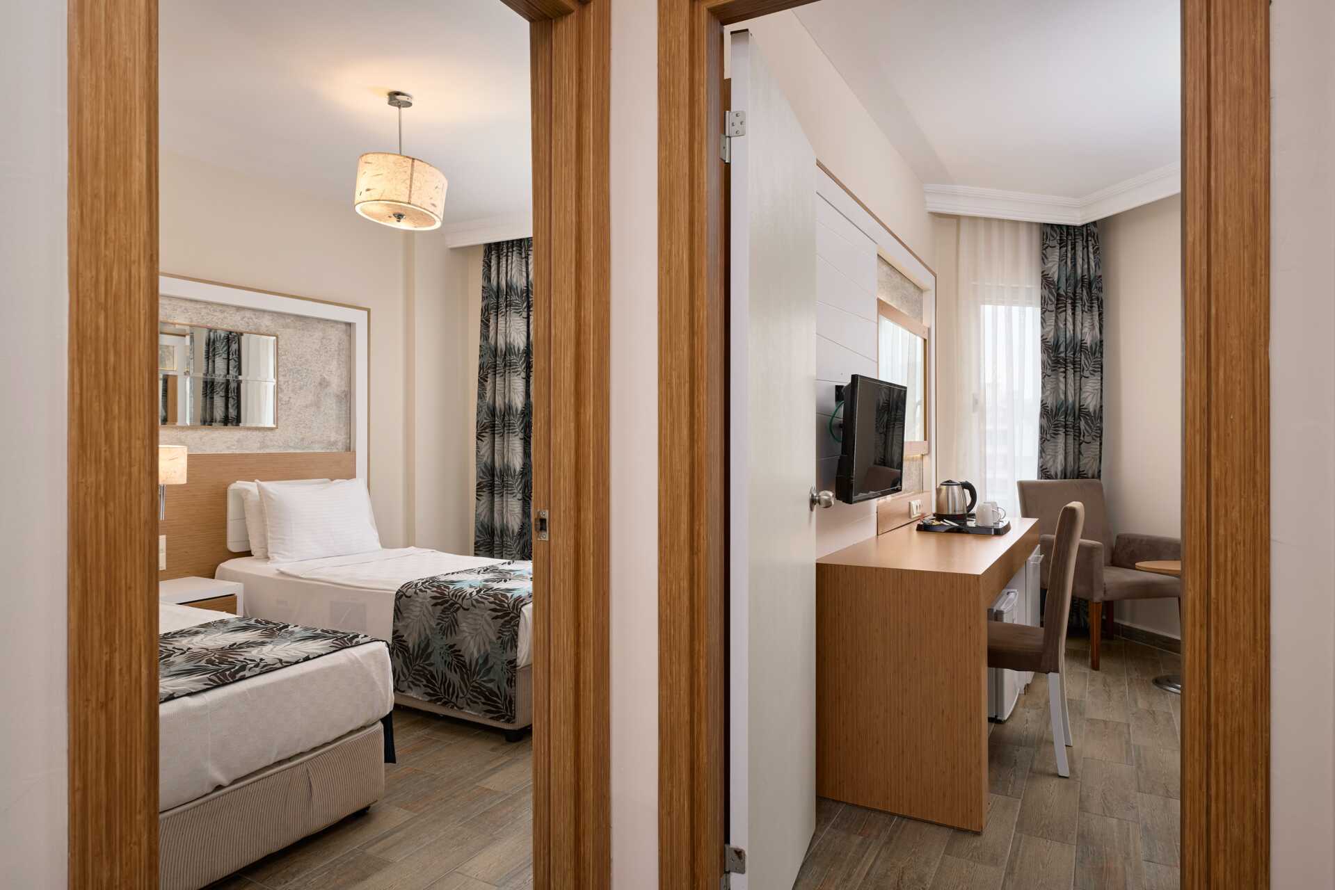 Familjerum med balkong. Familjerummet består av två sovrum. Ett sovrum med en dubbelsäng och ett sovrum med två enkelsängar. Möjlighet till extrabädd i bäddbar fåtölj eller hopfällbar säng. Wifi och luftkonditionering ingår. Deponering mot avgift. Minibar. Vattenkokare samt kaffe och te. Tv med internationella kanaler. Hårtork. Badrum med dusch och wc. Städning 7 ggr/vecka. Barn under två år räknas in i maxantalet personer i rummet.