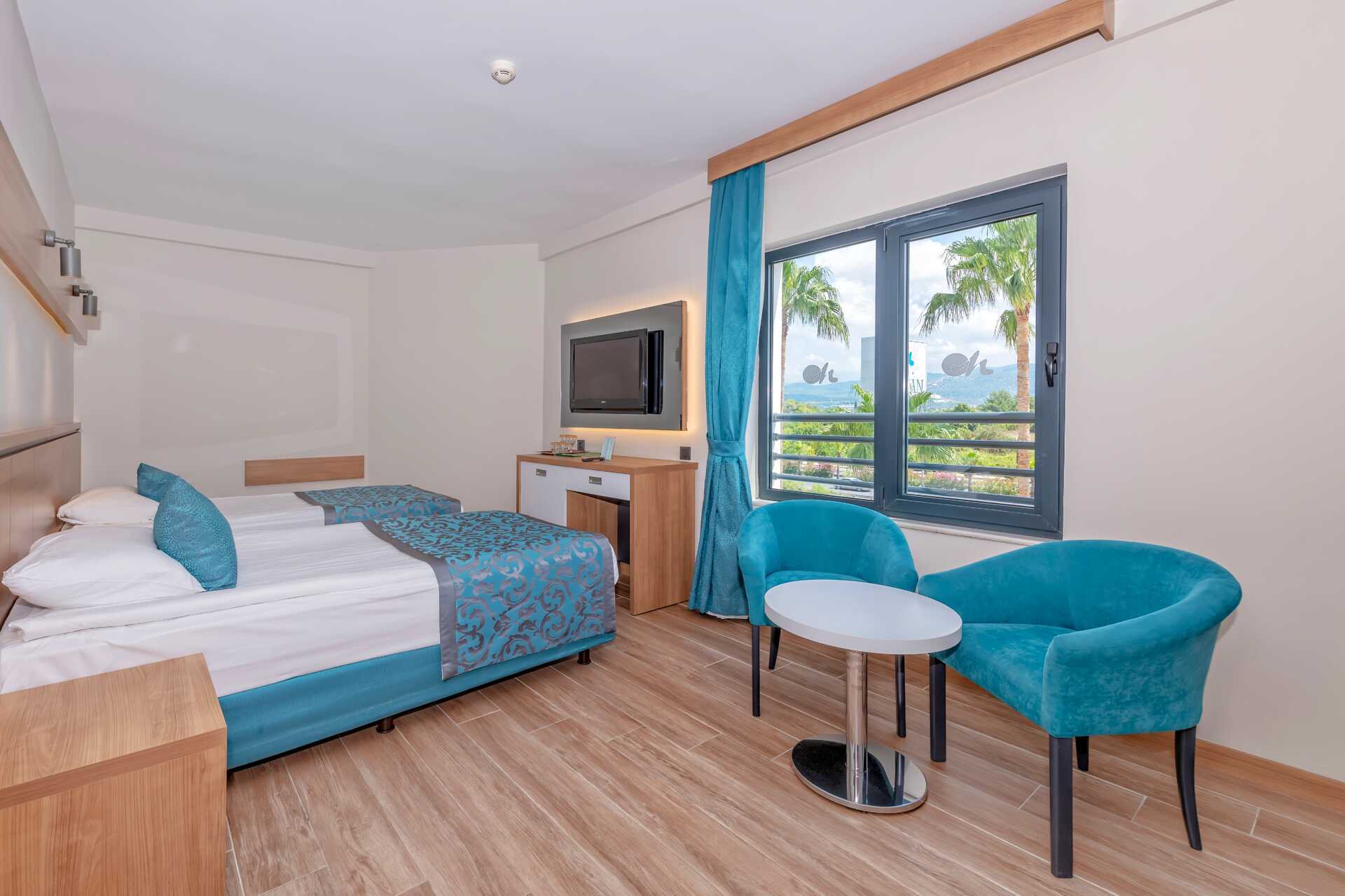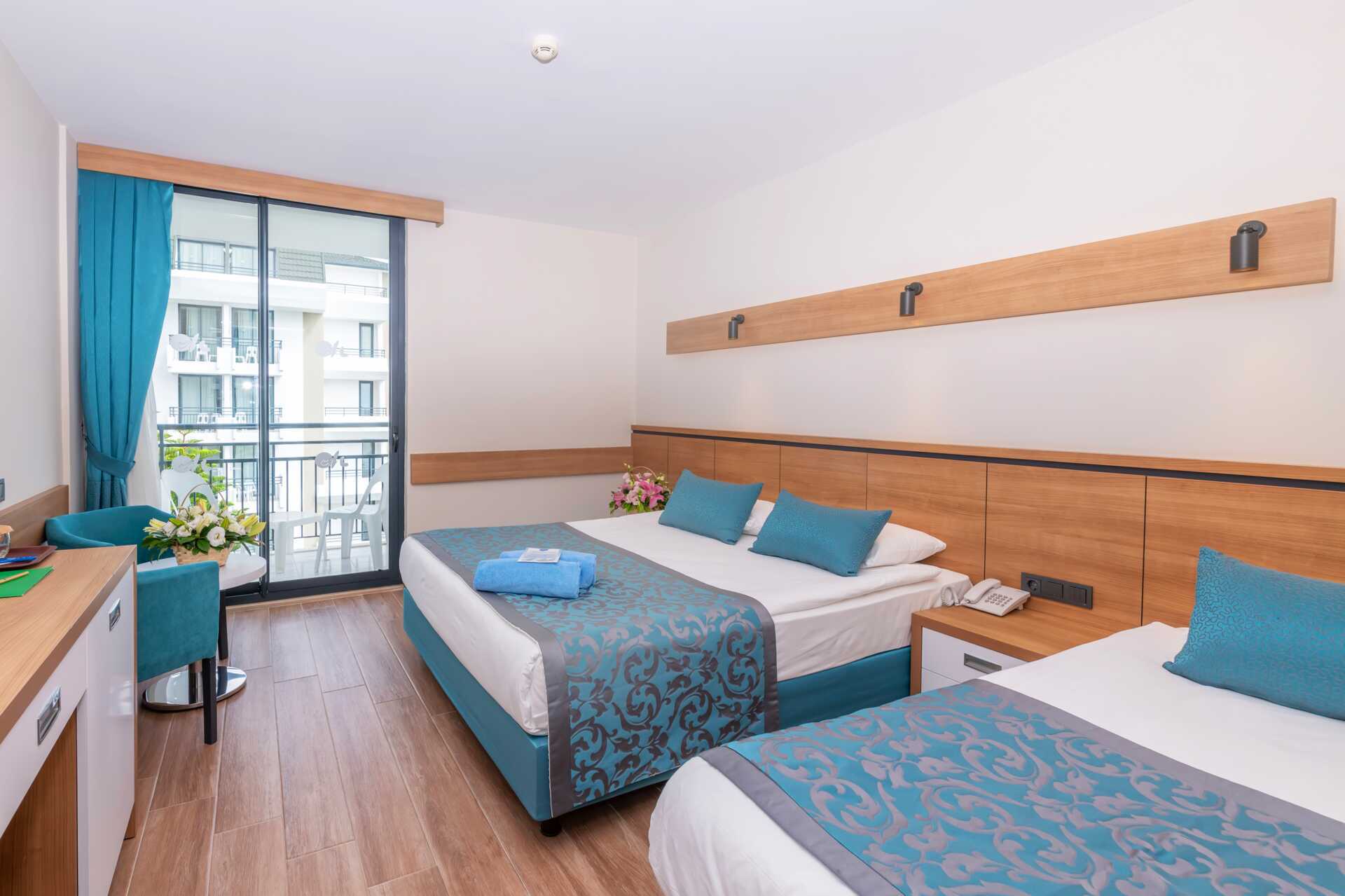 Familjerum med balkong. Familjerummet består av två sovrum. Ett sovrum med dubbelsäng och det andra med två enkelsängar. Vattenkokare med kaffe och te. Minibar. Wifi, luftkonditionering och deponering ingår. Tv med internationella kanaler. Hårtork. Badrockar. Badrum med dusch och wc. Städning 7 ggr/vecka.
