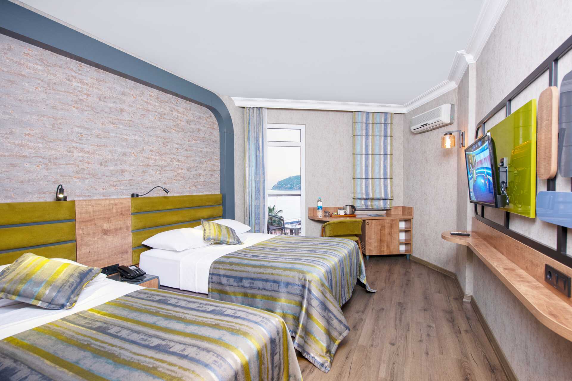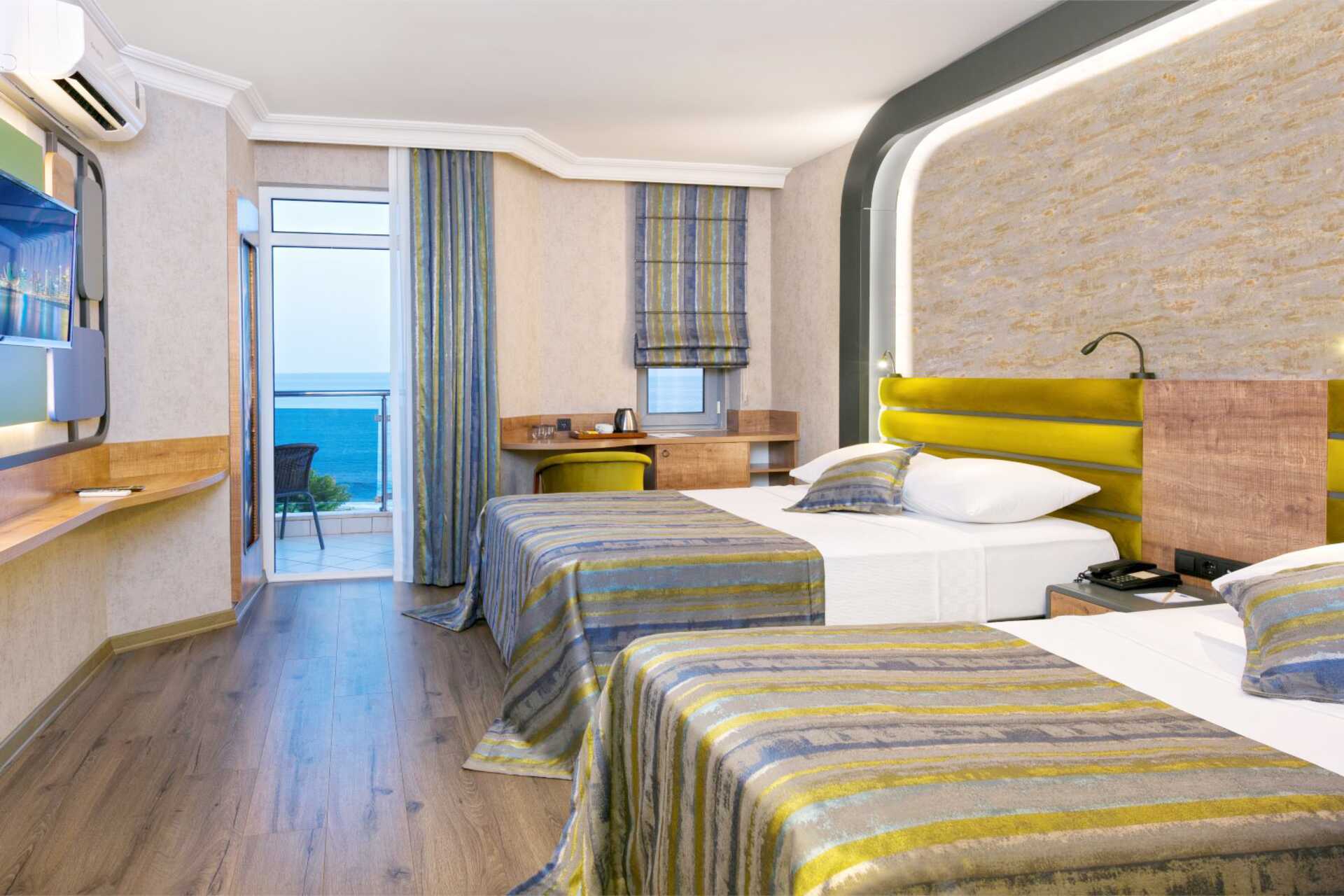 Superiorrum med balkong, vissa med begränsad havsutsikt och vissa med havsutsikt. Rummen ligger i byggnad A. En dubbelsäng eller två enkelsängar. Wifi, luftkonditionering och deponering ingår. Kylskåp. Vid ankomst är kylskåpet fyllt med läsk och flaskor med vatten. Vattenkokare samt kaffe och te. Tv internationella kanaler. Badrockar. Hårtork. Badrum med badkar eller dusch. Städning 7 ggr/vecka. Barn under två år räknas in i maxantalet personer i rummet.