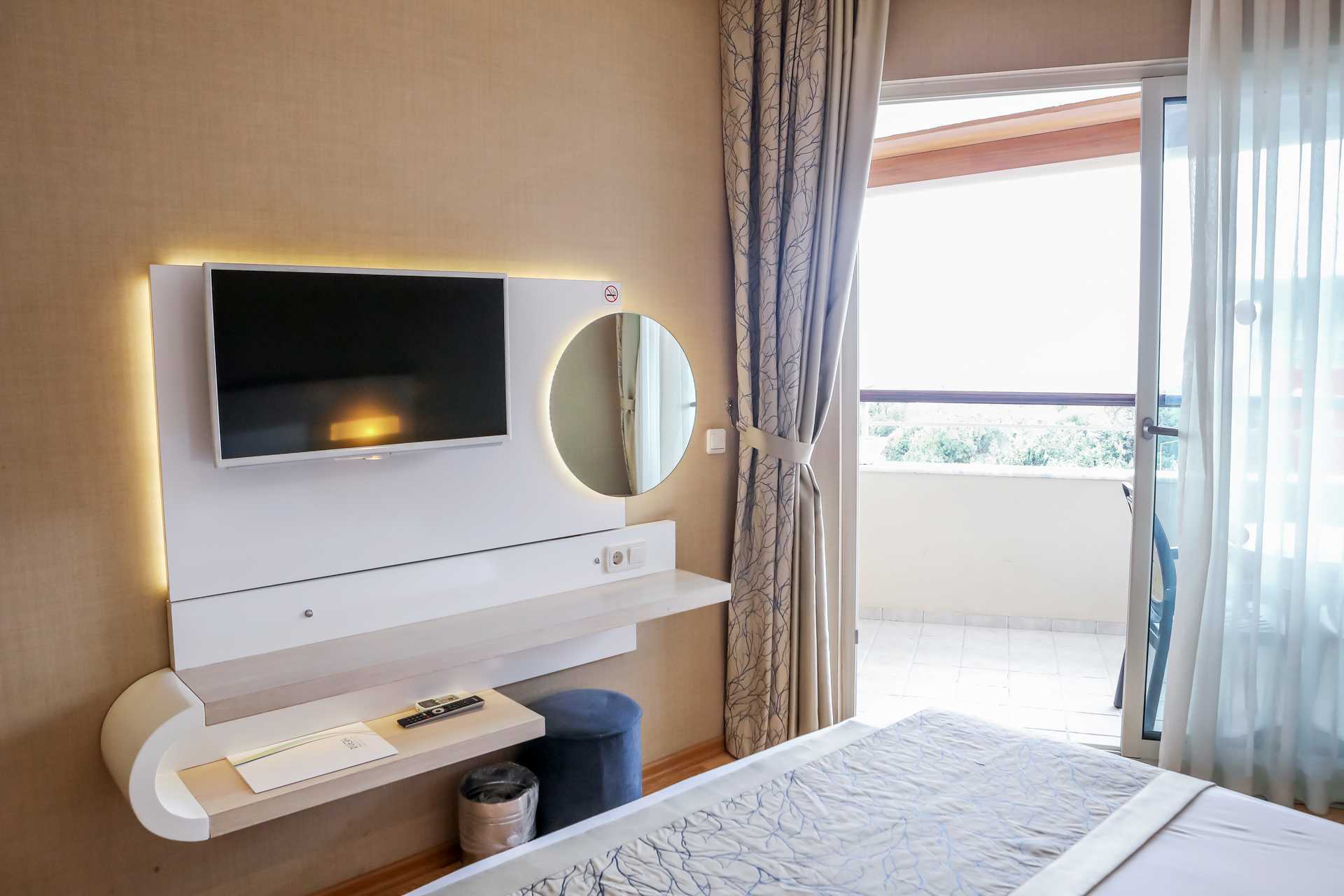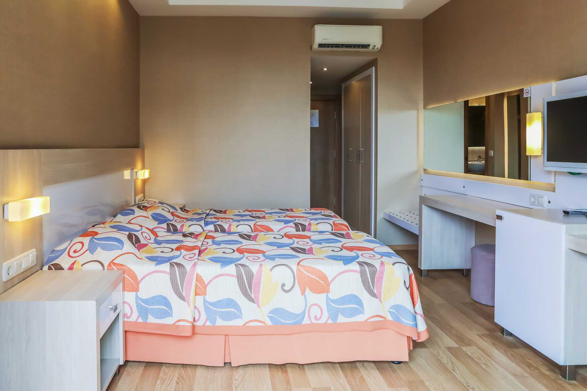 Dubbelrum med balkong i varierande storlekar, vissa med begränsad havsutsikt. Rummen finns i hotellets alla tre byggnader. En dubbelsäng eller två enkelsängar. Möjlighet till extrabädd i bäddsoffa. Luftkonditionering och wifi ingår. Deponering mot avgift. Minibar. Badrum med dusch och wc. Städning 7 ggr/vecka.