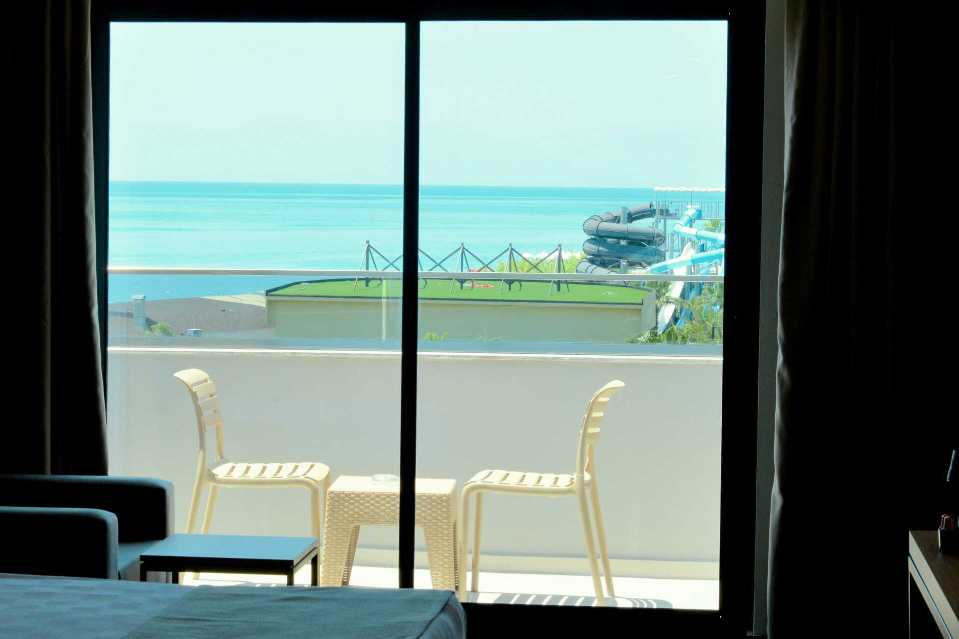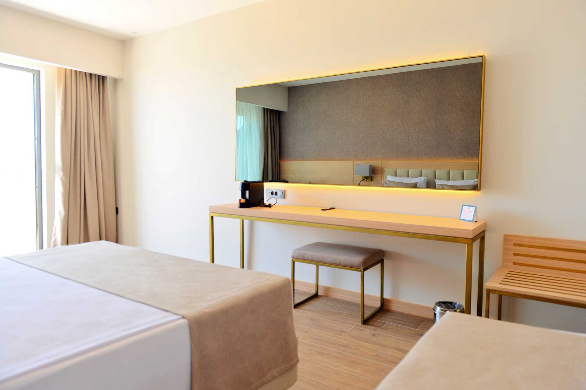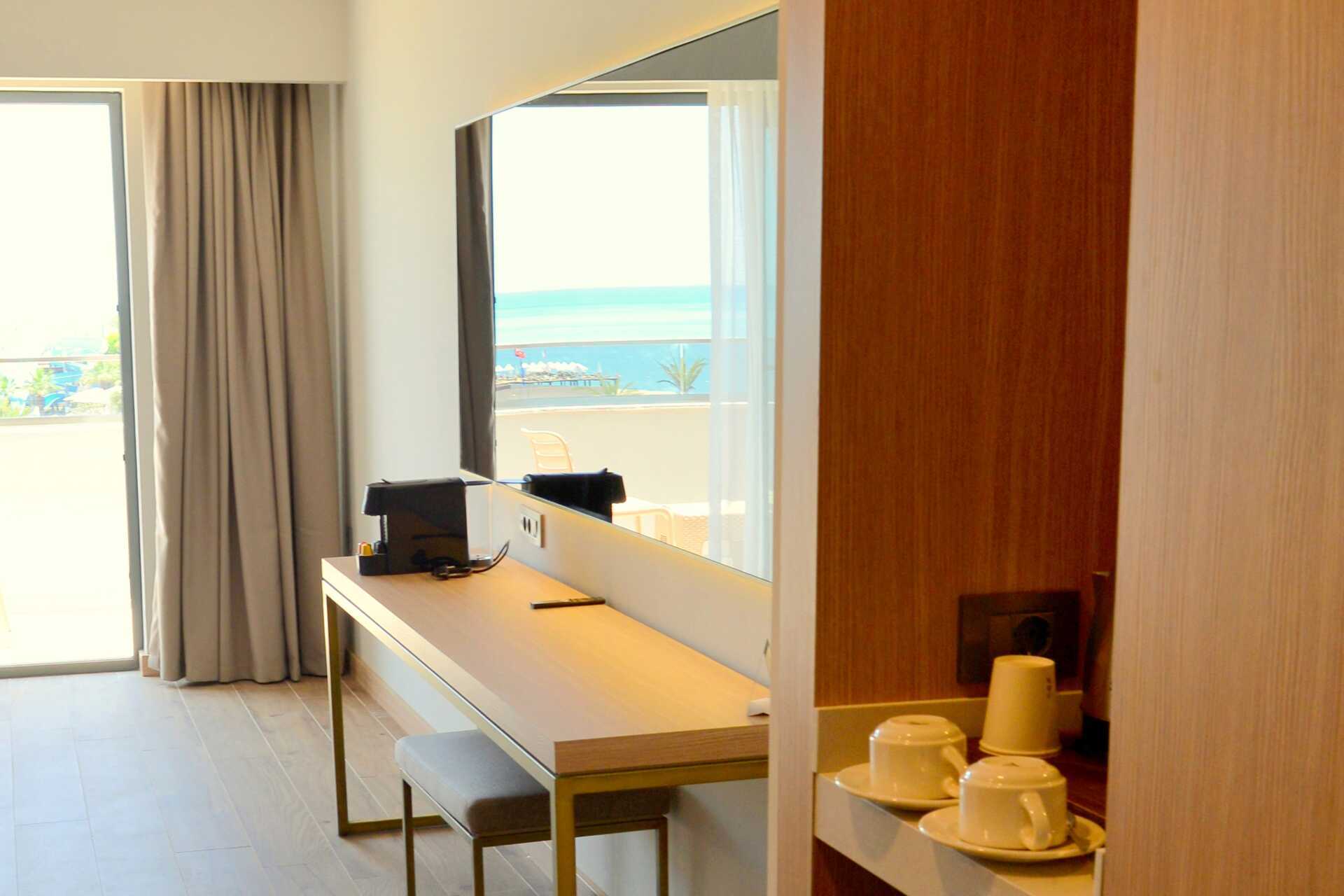 Deluxerum med balkong och havsutsikt. En dubbelsäng eller två enkelsängar. Möjlighet till extrabädd i enkelsäng. Wifi, luftkonditionering och deponering ingår. Minibar (fylls dagligen). Kapselmaskin för kaffe. Vattenkokare samt kaffe och te. Tv med internationella kanaler. Badrockar och tofflor. Hårtork. Badrum med dusch och wc. Städning 7 ggr/vecka. Barn under två år räknas in i max antal personer i rummet.