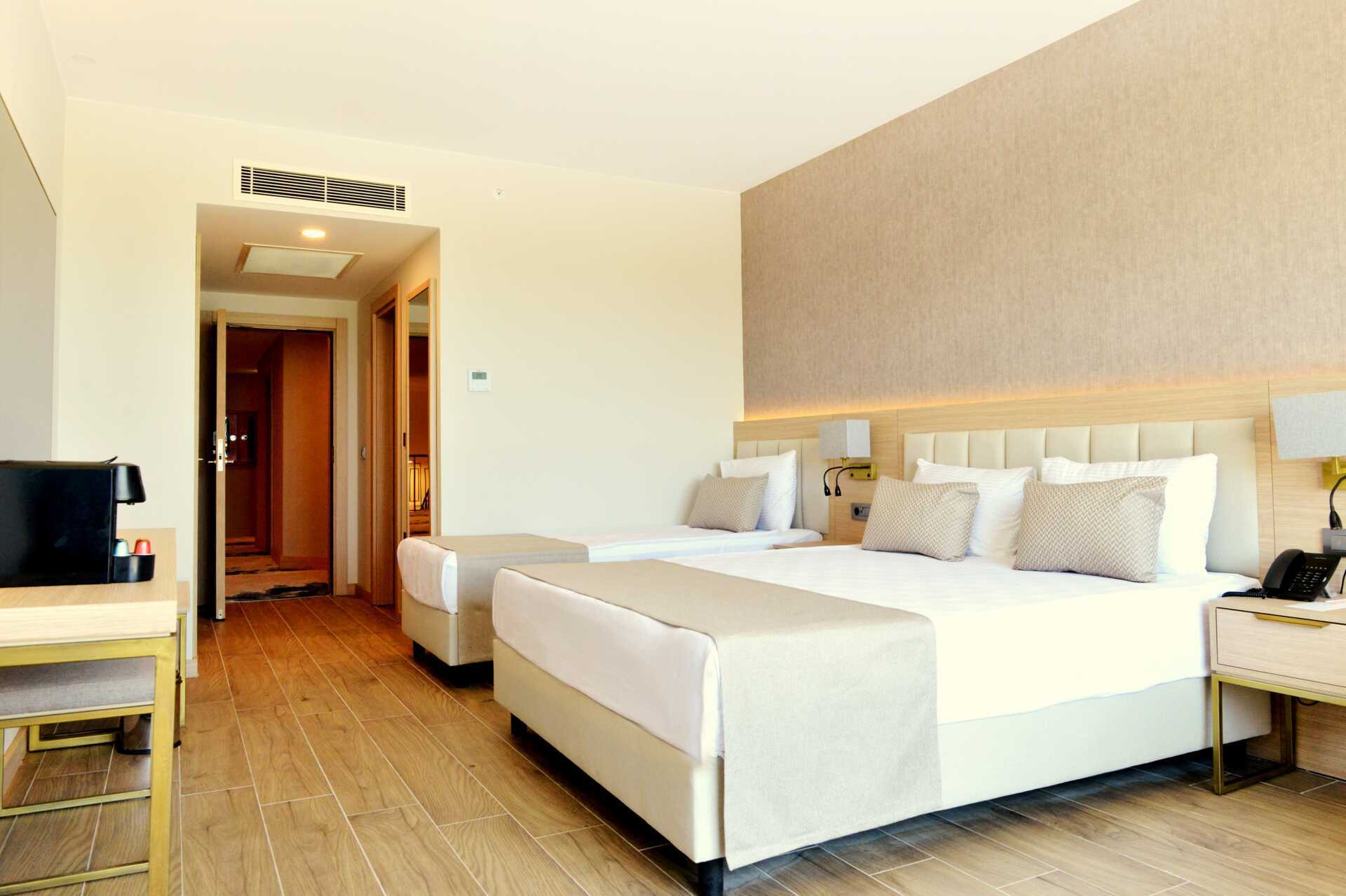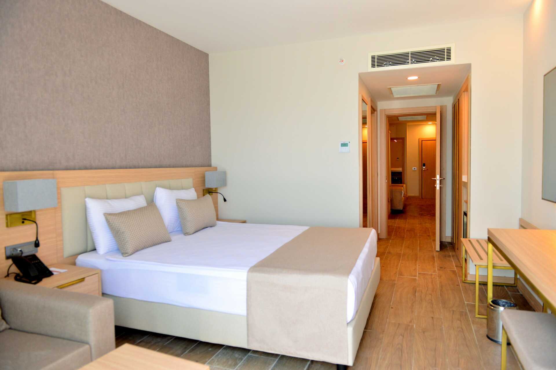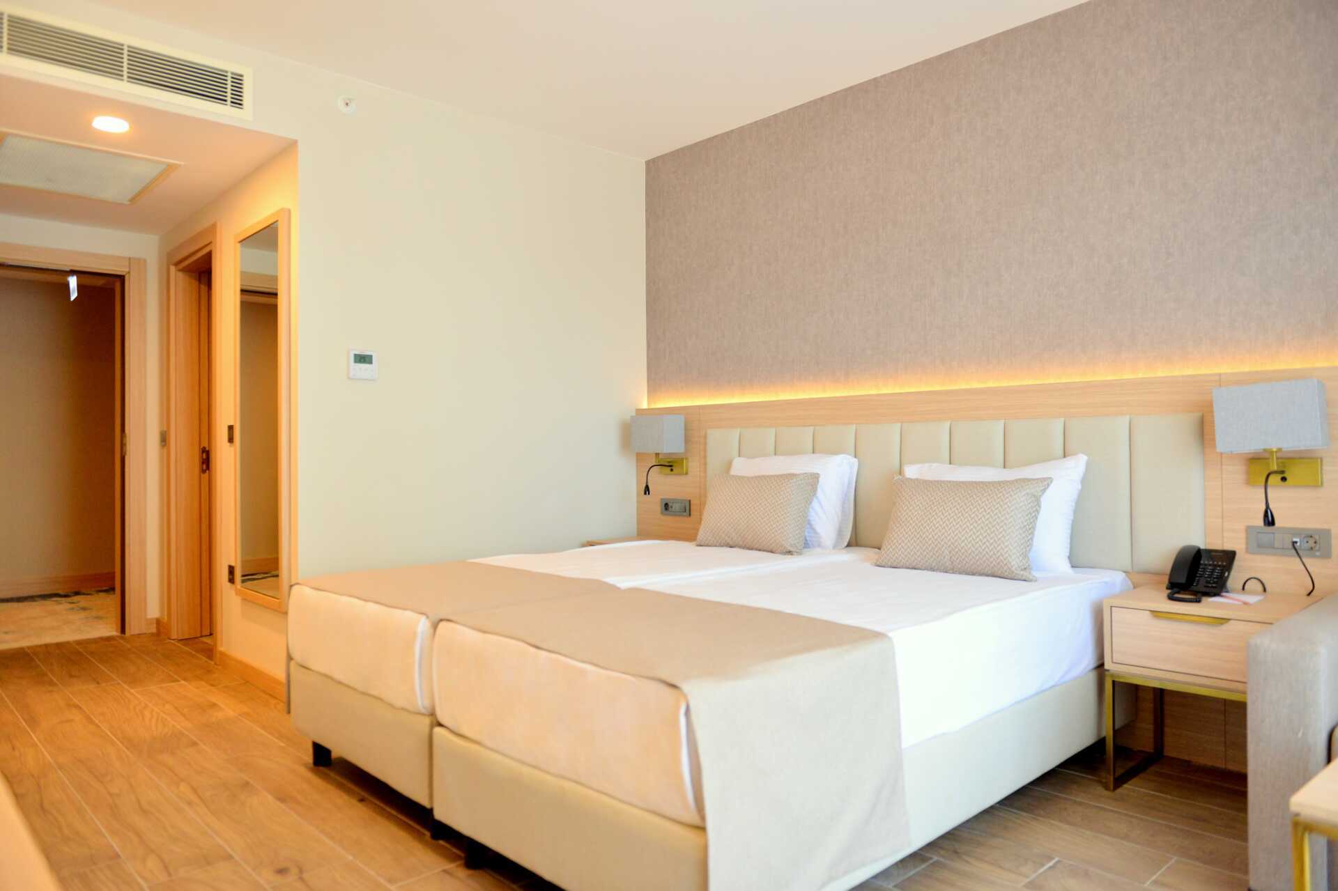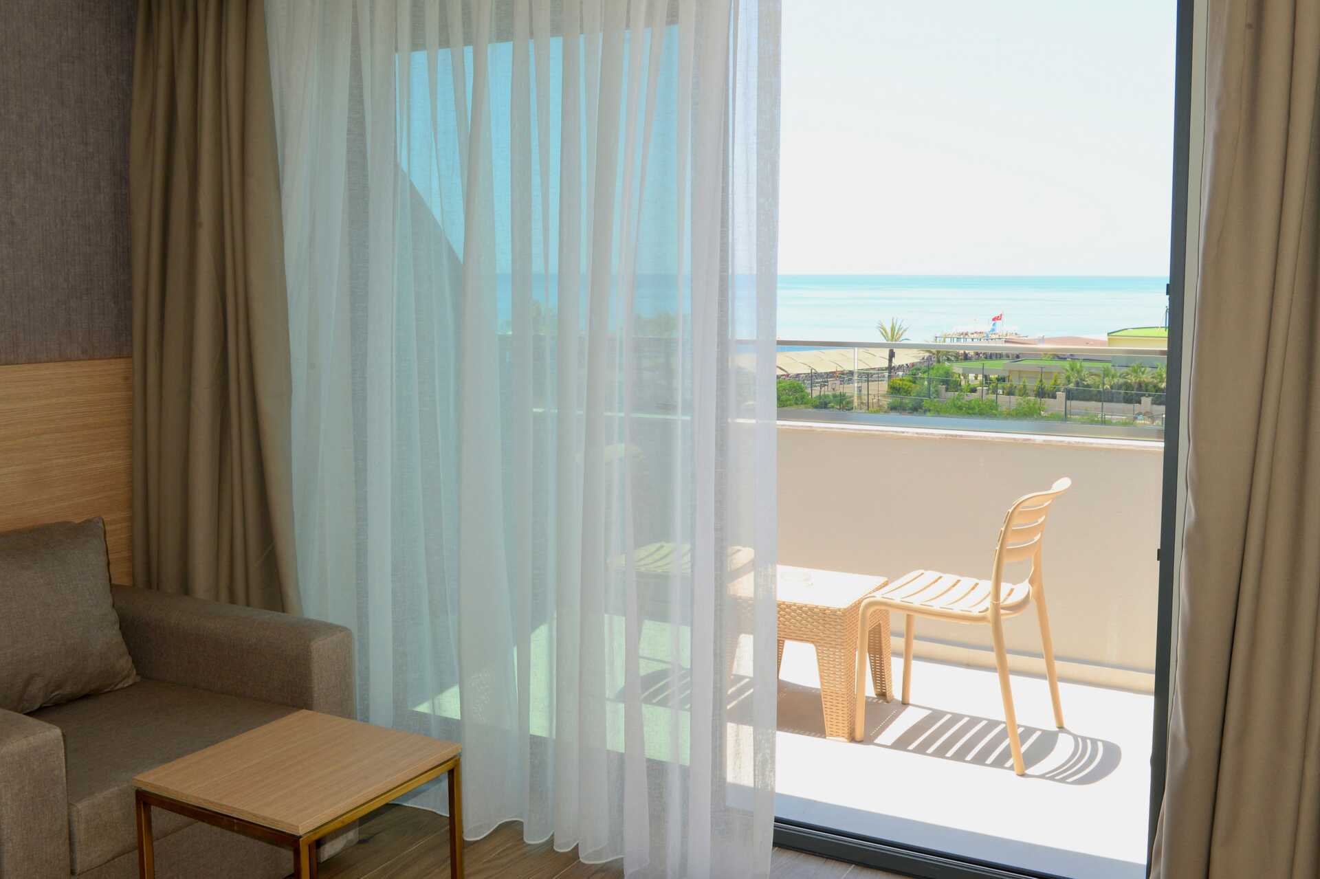 Deluxerum med balkong och havsutsikt. En dubbelsäng eller två enkelsängar. Möjlighet till extrabädd i enkelsäng. Wifi, luftkonditionering och deponering ingår. Minibar (fylls dagligen). Kapselmaskin för kaffe. Vattenkokare samt kaffe och te. Tv med internationella kanaler. Badrockar och tofflor. Hårtork. Badrum med dusch och wc. Städning 7 ggr/vecka. Barn under två år räknas in i max antal personer i rummet.