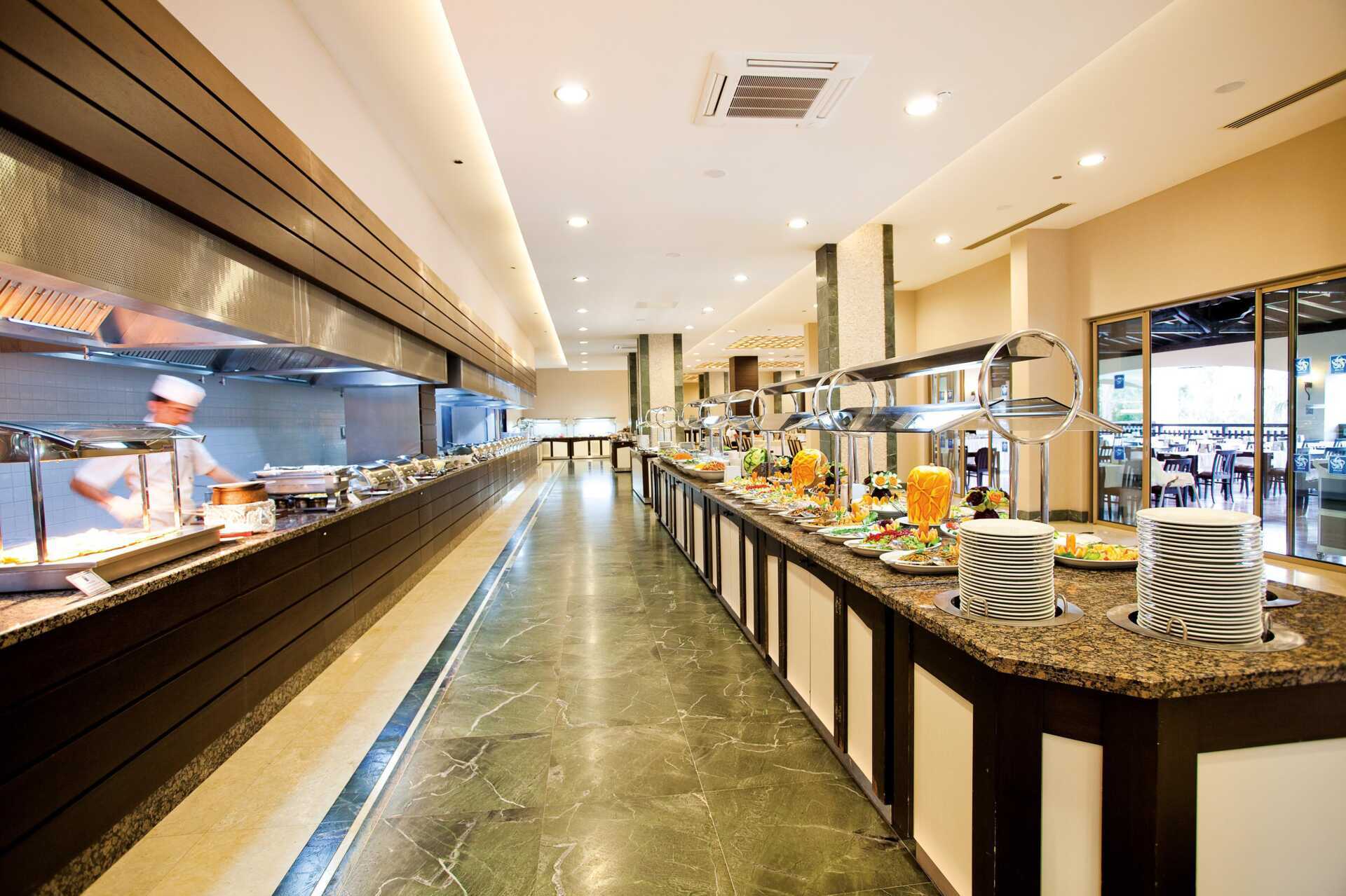 På hotellet finns en bufférestaurang samt tre à la carte-restauranger som serverar fisk, turkiska rätter och internationella rätter. Åldersgräns 9 år i à la carte-restaurangerna International Western och Eastern Cuisine Restaurant. À la carte-restaurangerna är en utomhusrestaurang som håller öppet beroende av väder. Bordsreservation krävs i à la carte-restaurangerna. Är du sugen på efterrätt kan du besöka hotellets patisserie.