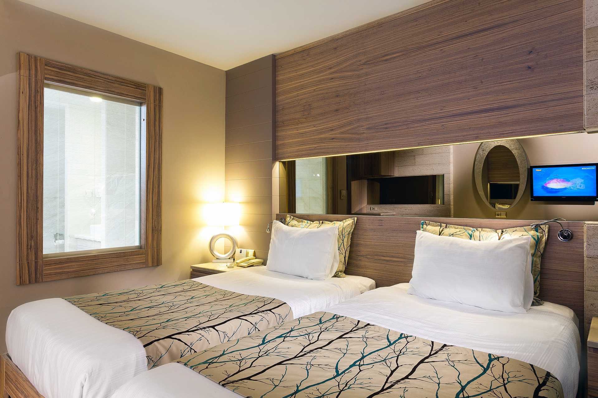 Dubbelrum med balkong, vissa med havsutsikt och vissa med begränsad havsutsikt. Två enkelsängar. Möjlighet till extrabäddar i bäddsoffa. Deponering, wifi och centralstyrd luftkonditionering (på/av olika tider beroende på vädret) ingår. Minibar. Vattenkokare samt kaffe och te. Tv med internationella kanaler. Tofflor. Hårtork. Badrum med dusch och wc. Städning 7 ggr/vecka. Barn under två år räknas in i maxantalet personer i rummet.