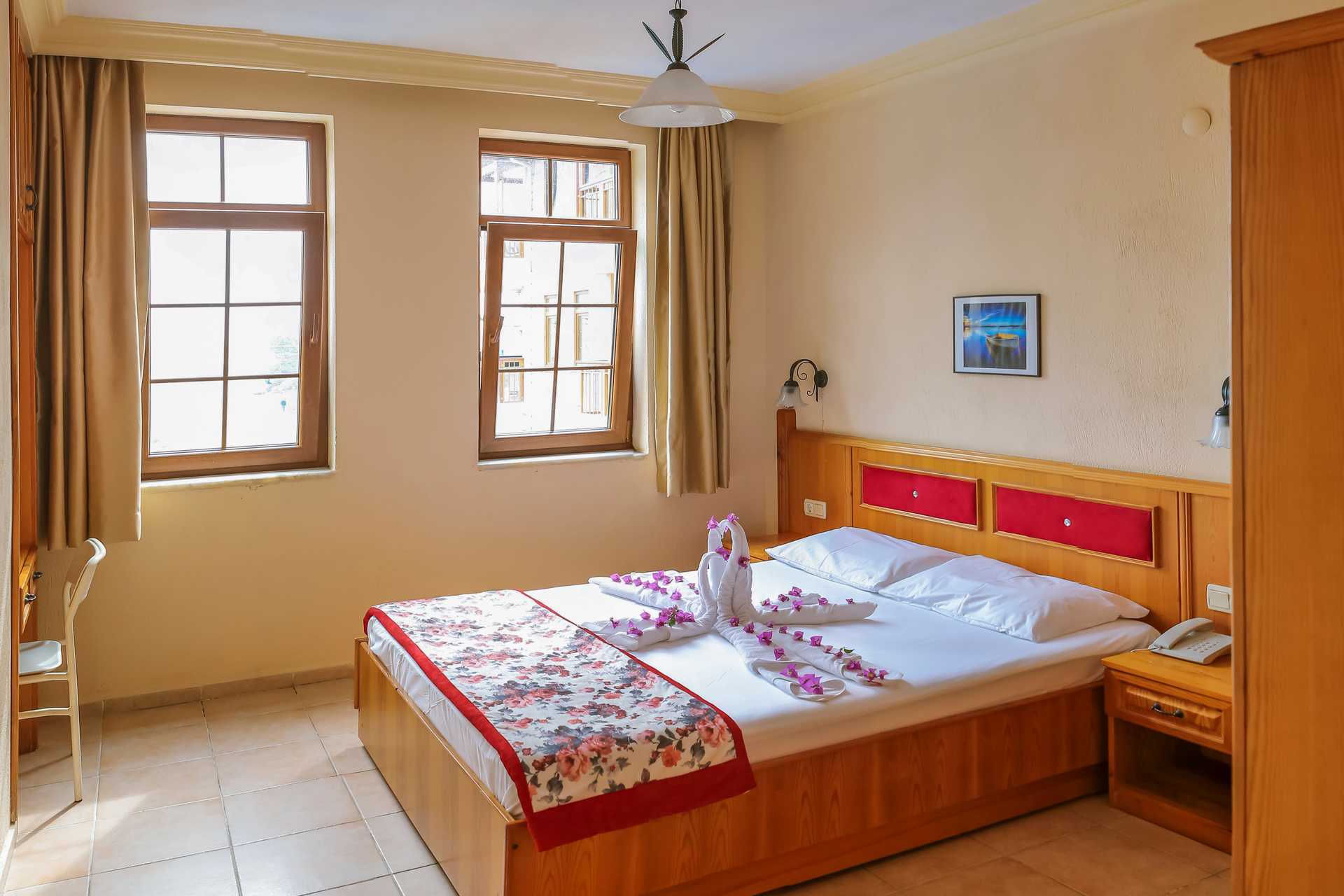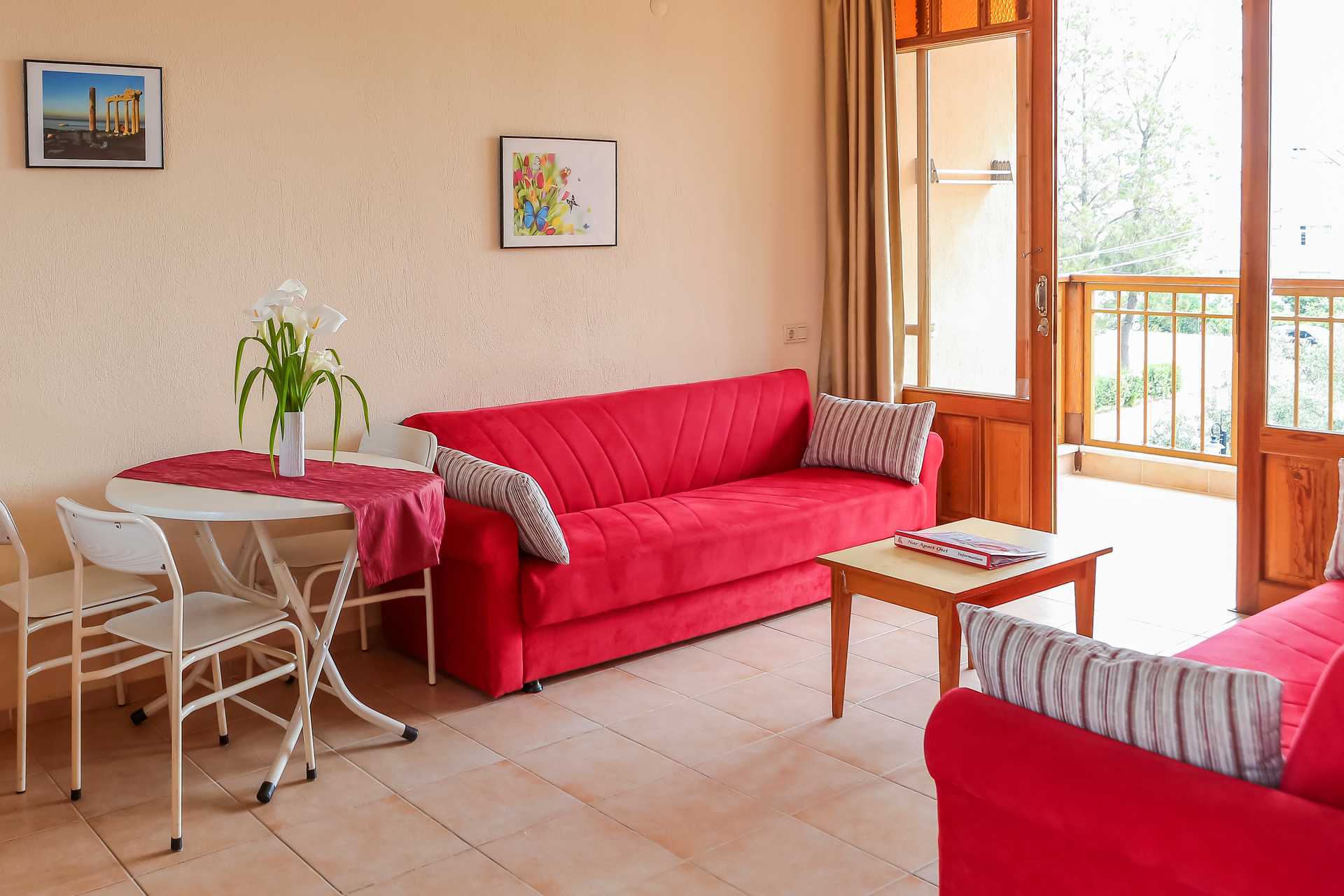 Tvårumslägenhet med balkong eller terrass. Sovrum och kombinerat vardagsrum med minikök. En dubbelsäng. Möjlighet till extrabäddar i två bäddsoffor. Minikök med kokplattor, kylskåp, mikrovågsugn, kaffebryggare och enkel köksutrustning. Wifi och luftkonditionering ingår. Deponering mot avgift. Tv med internationella kanaler. Badrum med dusch och wc. Städning 7 ggr/vecka.