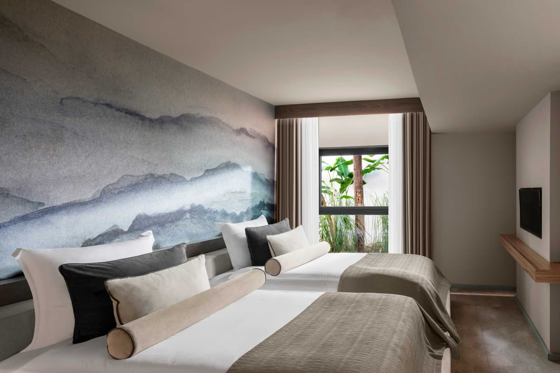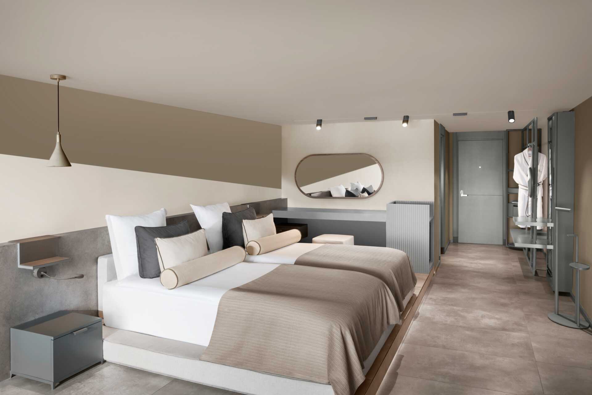 Större familjerum med balkong eller markterrass. Två sovrum, ett med en dubbelsäng och ett med två enkelsängar. Möjlighet till extrabädd i bäddsoffa. Wifi, luftkonditionering och deponering ingår. Minibar mot avgift. Tv med internationella kanaler. Hårtork. Två badrum med dusch och wc. Städning 7 ggr/vecka.