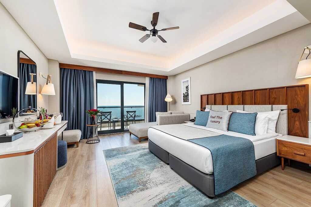 Dubbelrum med balkong, vissa med begränsad havsutsikt, havsutsikt och/eller poolutsikt. En dubbelsäng eller två enkelsängar. Wifi, luftkonditionering och deponering ingår. Minibar. Vattenkokare samt kaffe och te. Tv med internationella kanaler. Badrockar och tofflor. Hårtork. Badrum med dusch och wc. Städning 7 ggr/vecka.